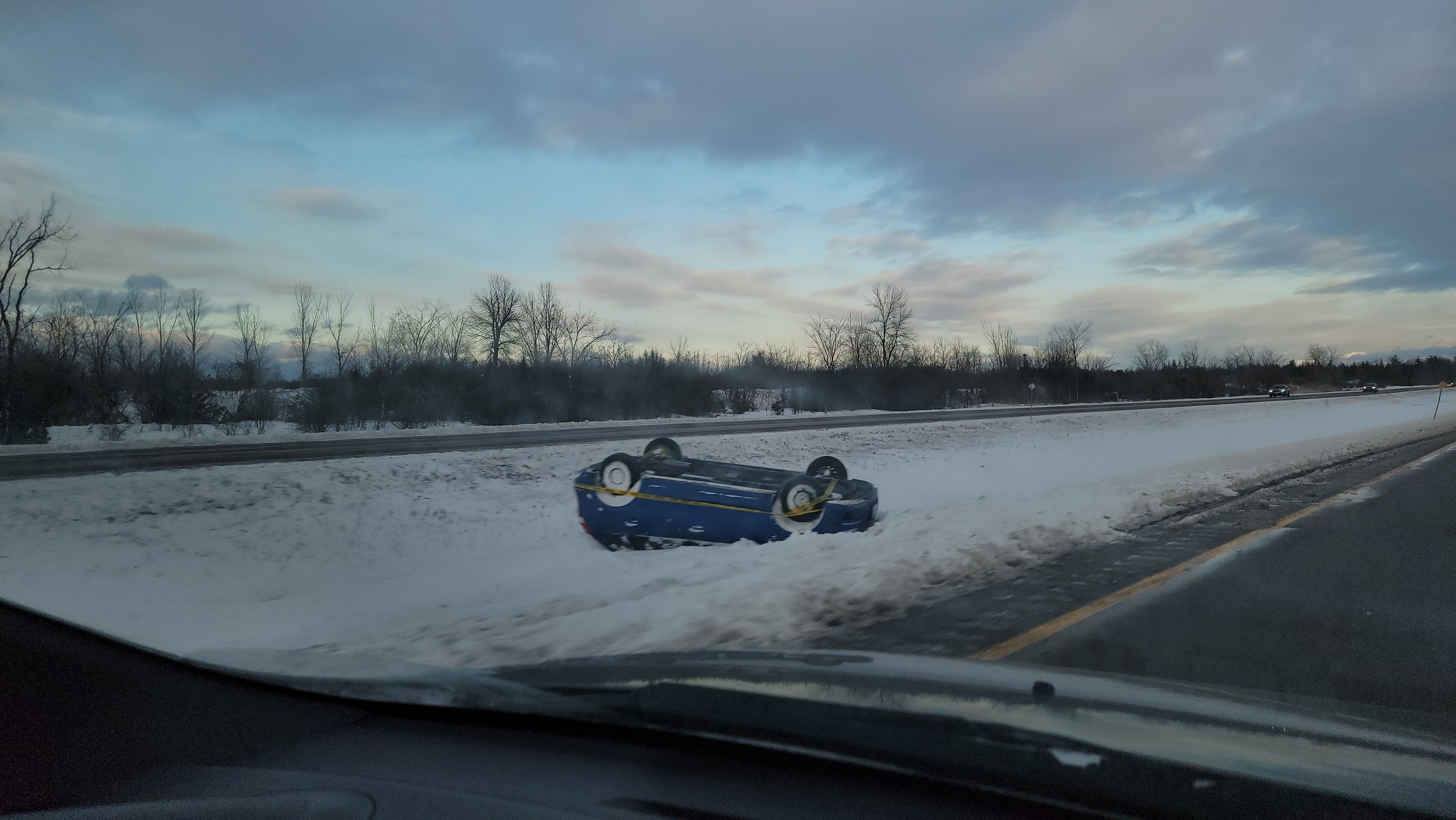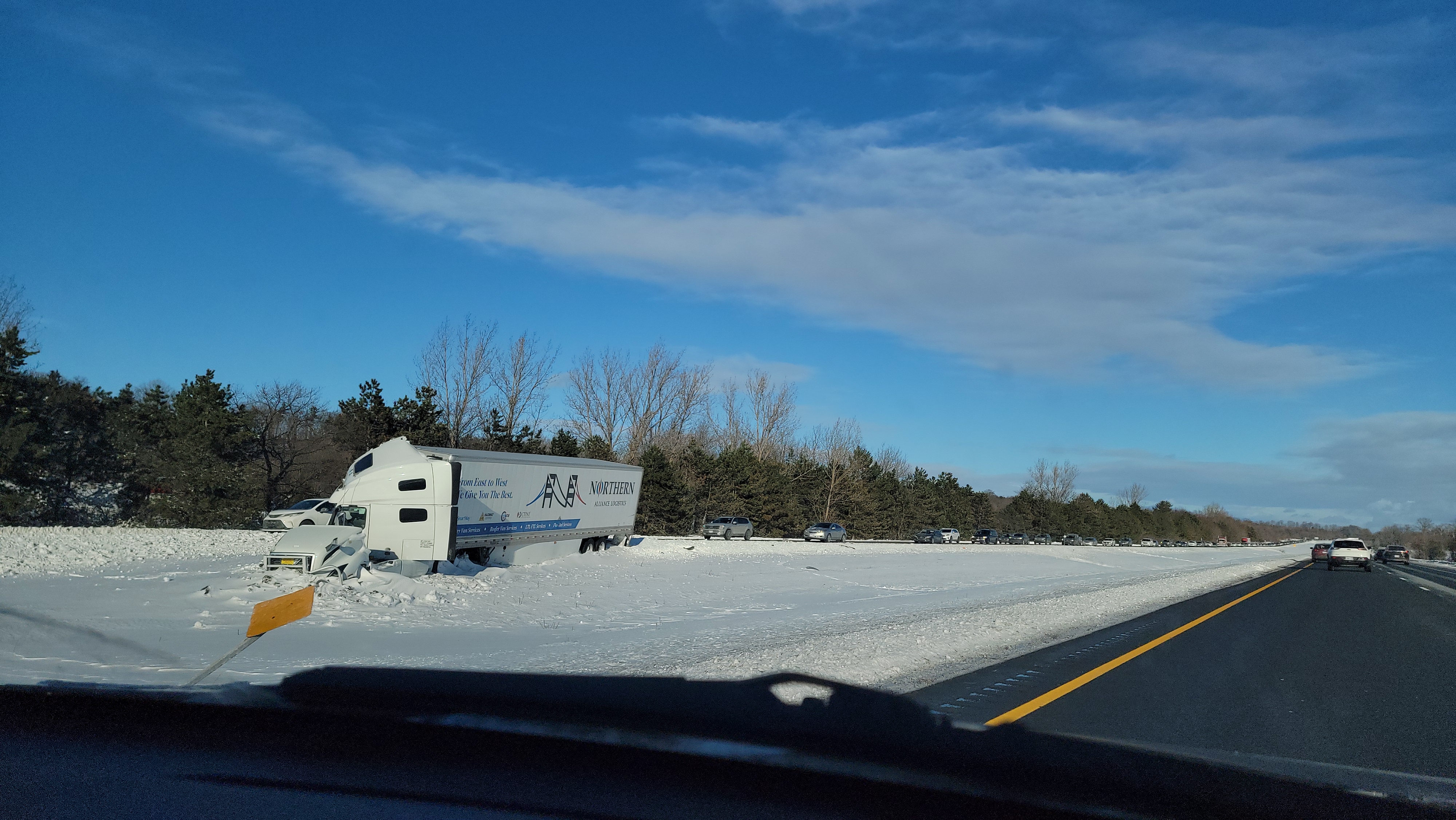 Google said 5:41 min on Christmas Eve and 2 slowdowns... Well luckily one of our EITs (Engineer In Training) messaged me and told me not to leave. She said look at 511 and there were 5 closures on the 401! We left the next day and saw more than 50 cars and trucks in the ditches both eastbound and westbound like ship wrecks in a white ocean.