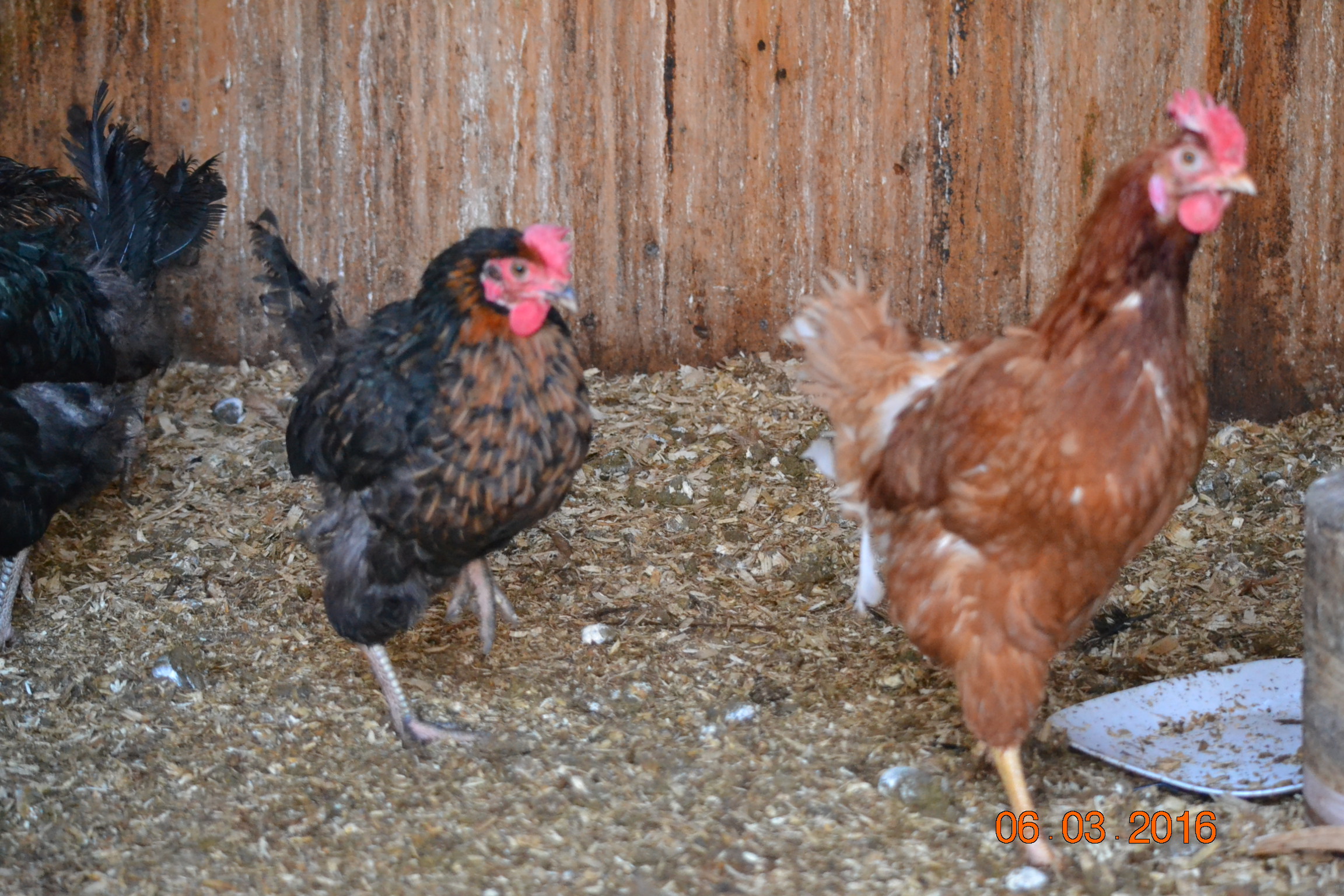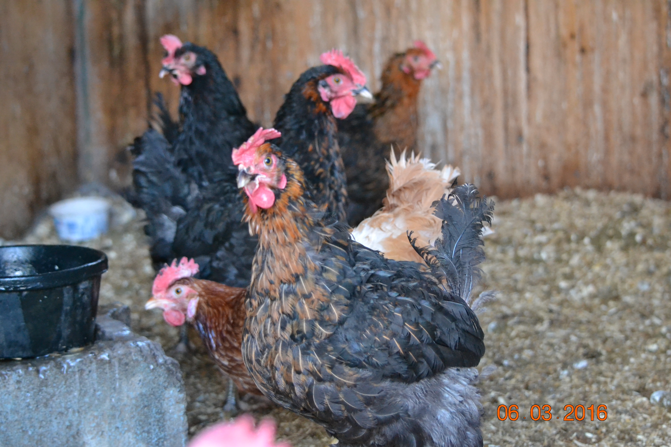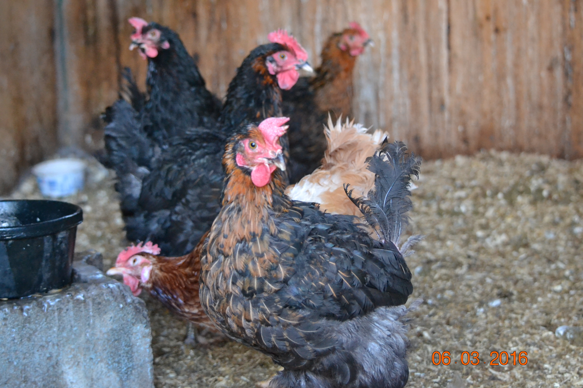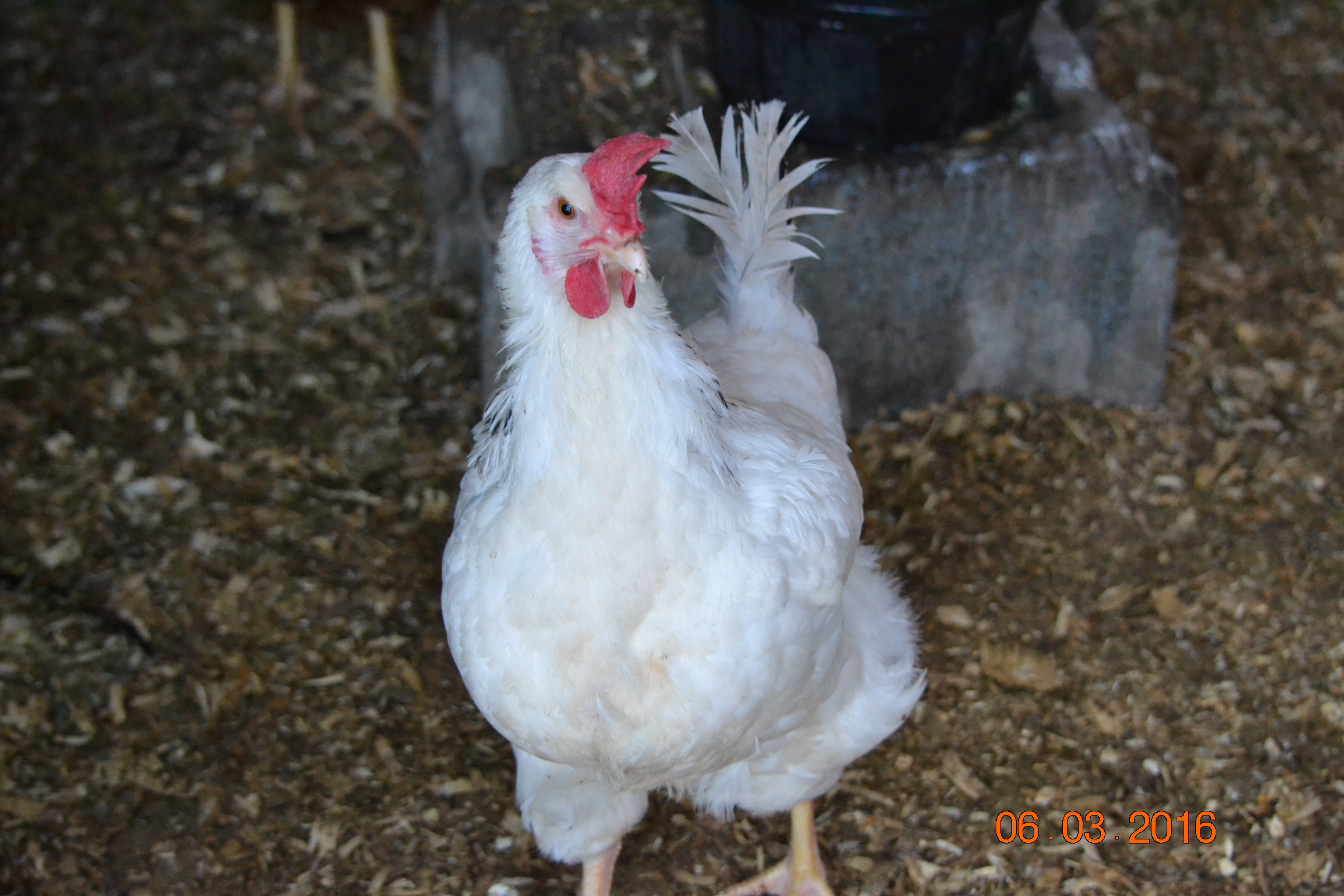 They have stopped being terrified of me! This seems to also help to have stopped the picking...when I first got them they would pile on top of each other against the wall to get away from me and I would see them peck at each other. Now some of them are still wary of me but at least half look forward to me coming in and have lost their fear. They look forward to what treats they get and one jumps up and pecks the water jug if they run out before i get out there. The white one sees me coming and waits at the door for me. Even though I have hit her with the door many times! She has earned herself a name. She is the friendliest and of course being the only white one the easiest to pick out :chicken peck2: She is Camilla...not named after price Charles' wife but after Gonzo's girlfriend...you Muppet fans will know!