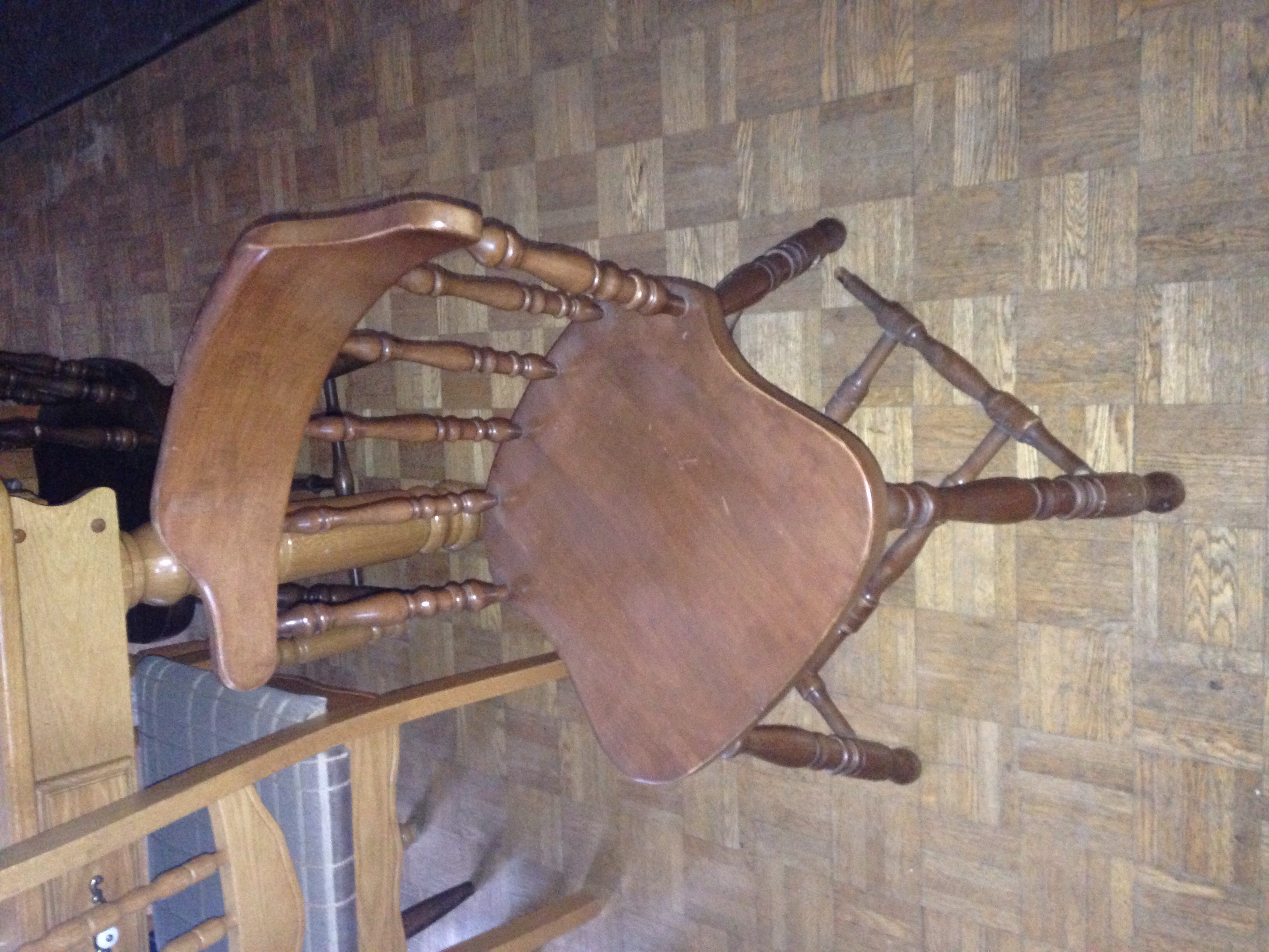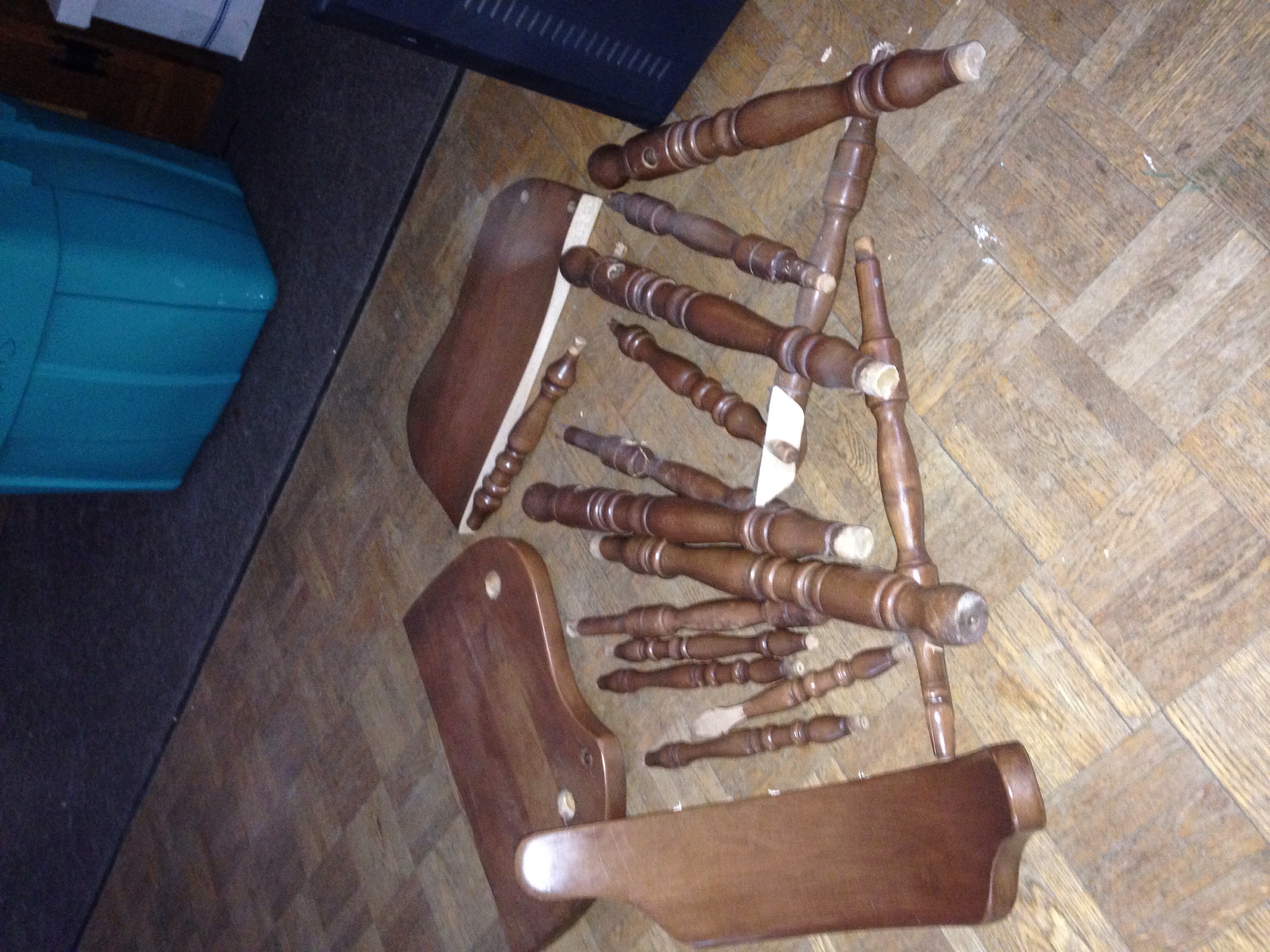 My dad goes to auction sales, and he buys chairs. They're wood and those ones had no nails only glue. Our family is full of "hefty" guys, and a lot of the "spindle" wooden chairs we have are mass produced from the 1970's so not valuable. We do have nice antique chairs that we had reglued and it costs as much to redo as buying more. I tell him to buy "solid and durable chairs" that have a single arm of wood from floor to shoulder, but he doesn't buy many of those. There's one "solid type" in the background of the top pic.