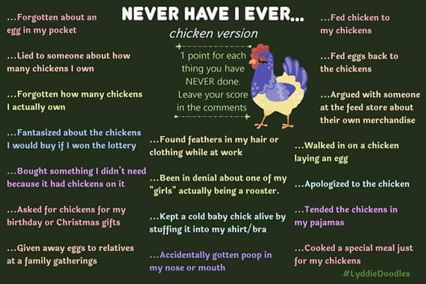 Well, my score is 11, but I'm brand new to chickens! Give me another year...