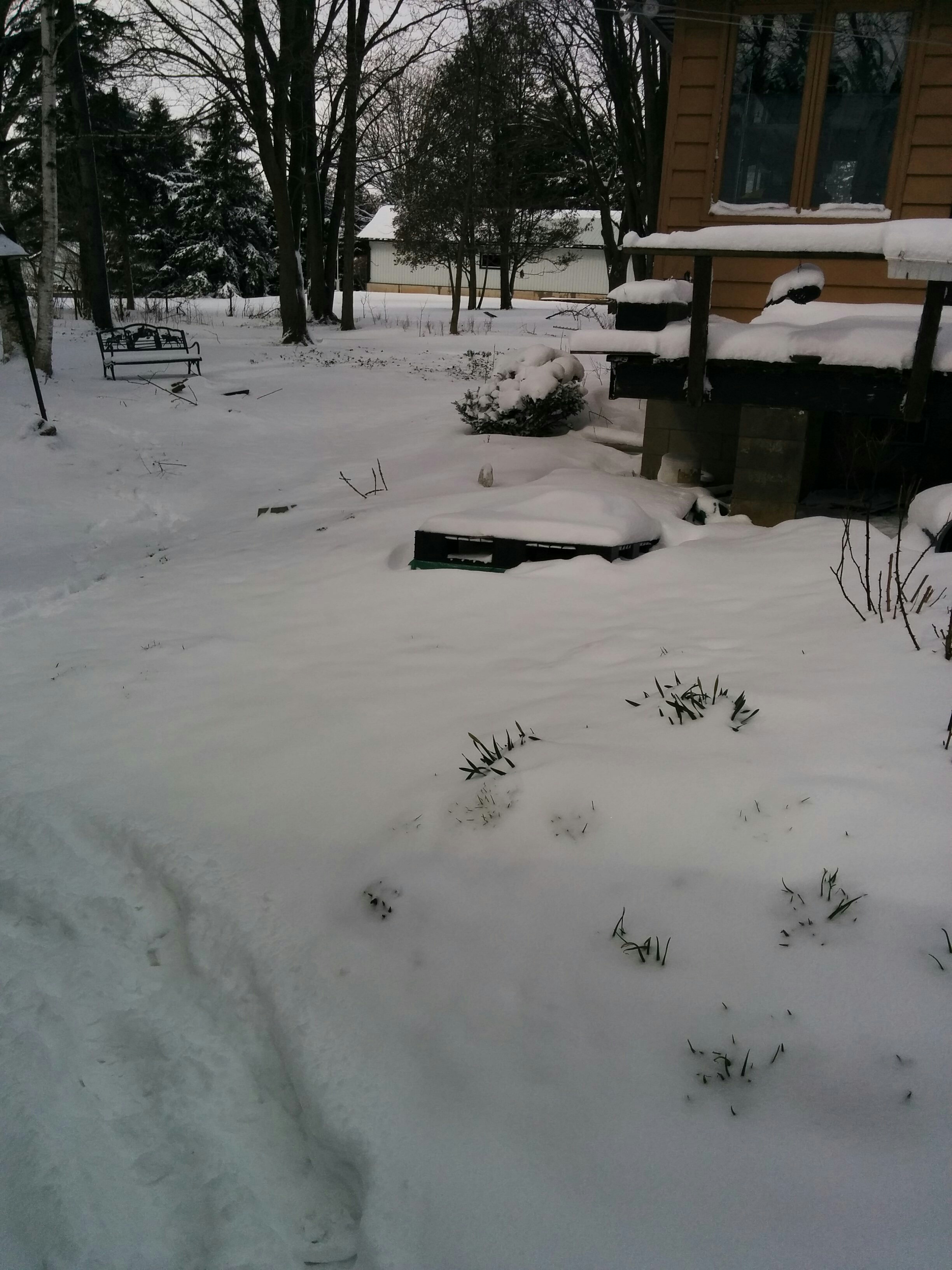 I love snow!! I love winter. But I don't love it on my bulbs that are up and my trees where the buds are opening. Especially my big flowering ones for the hummingbirds. No idea what they're called, but the hummingbirds and bees love them.