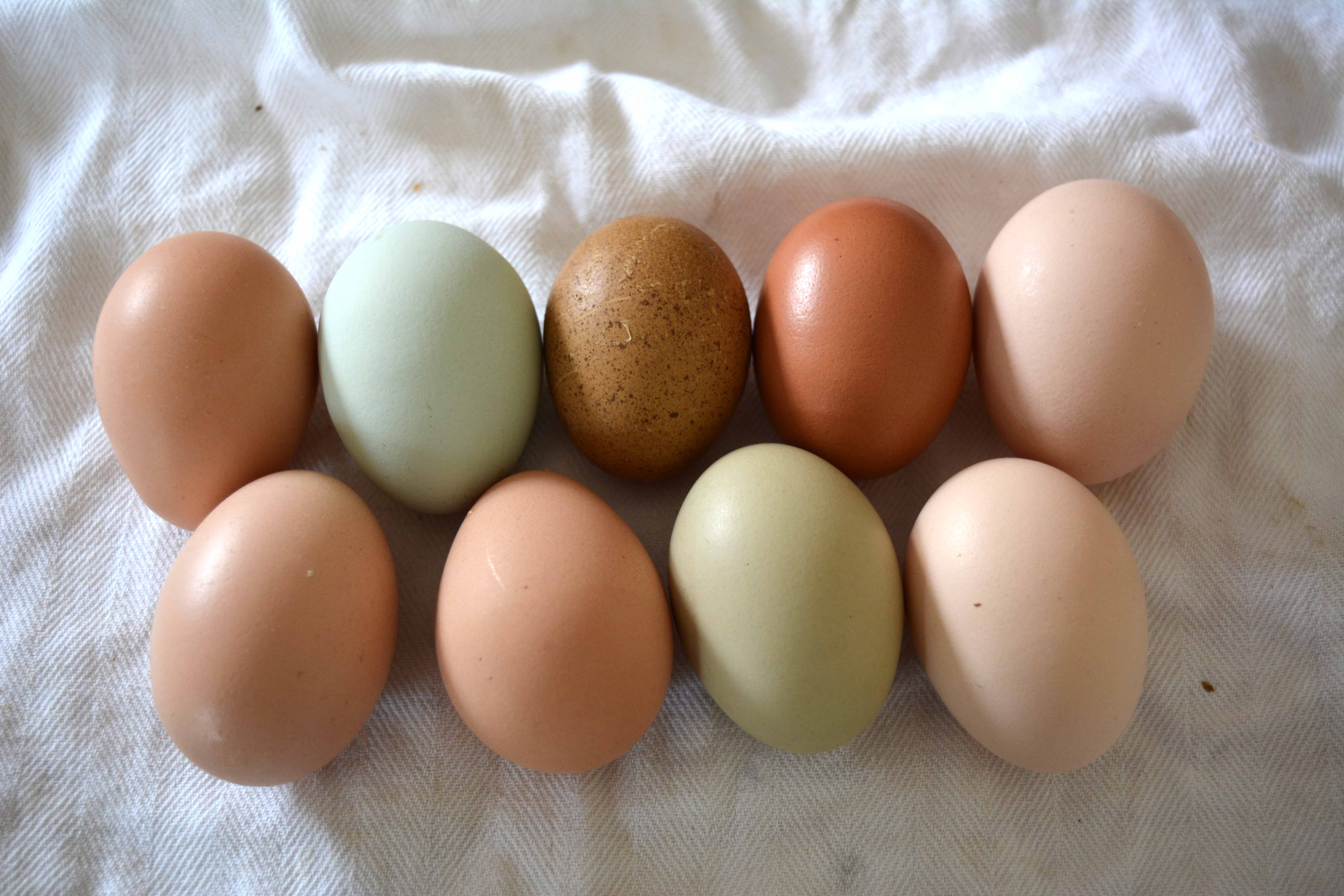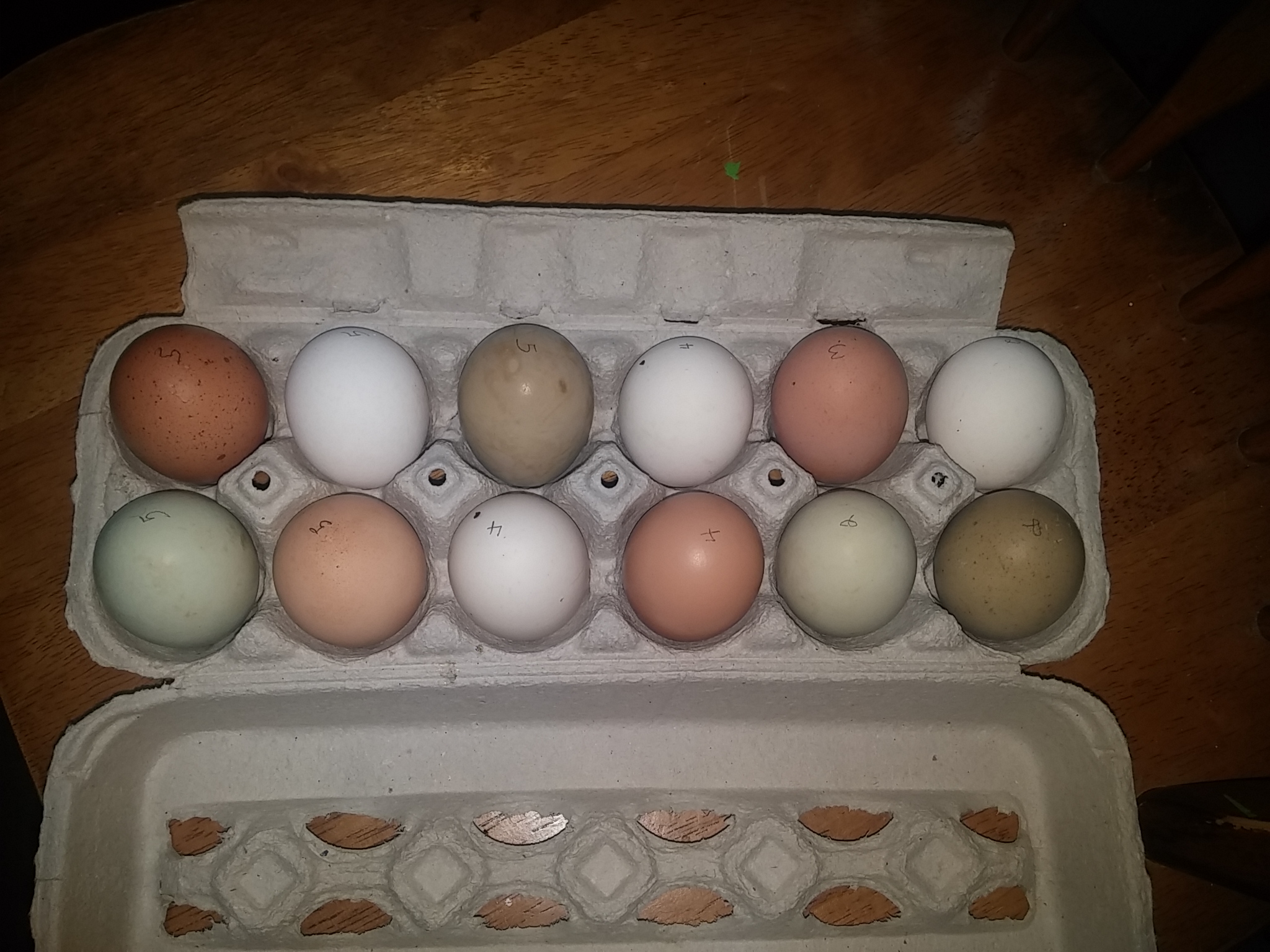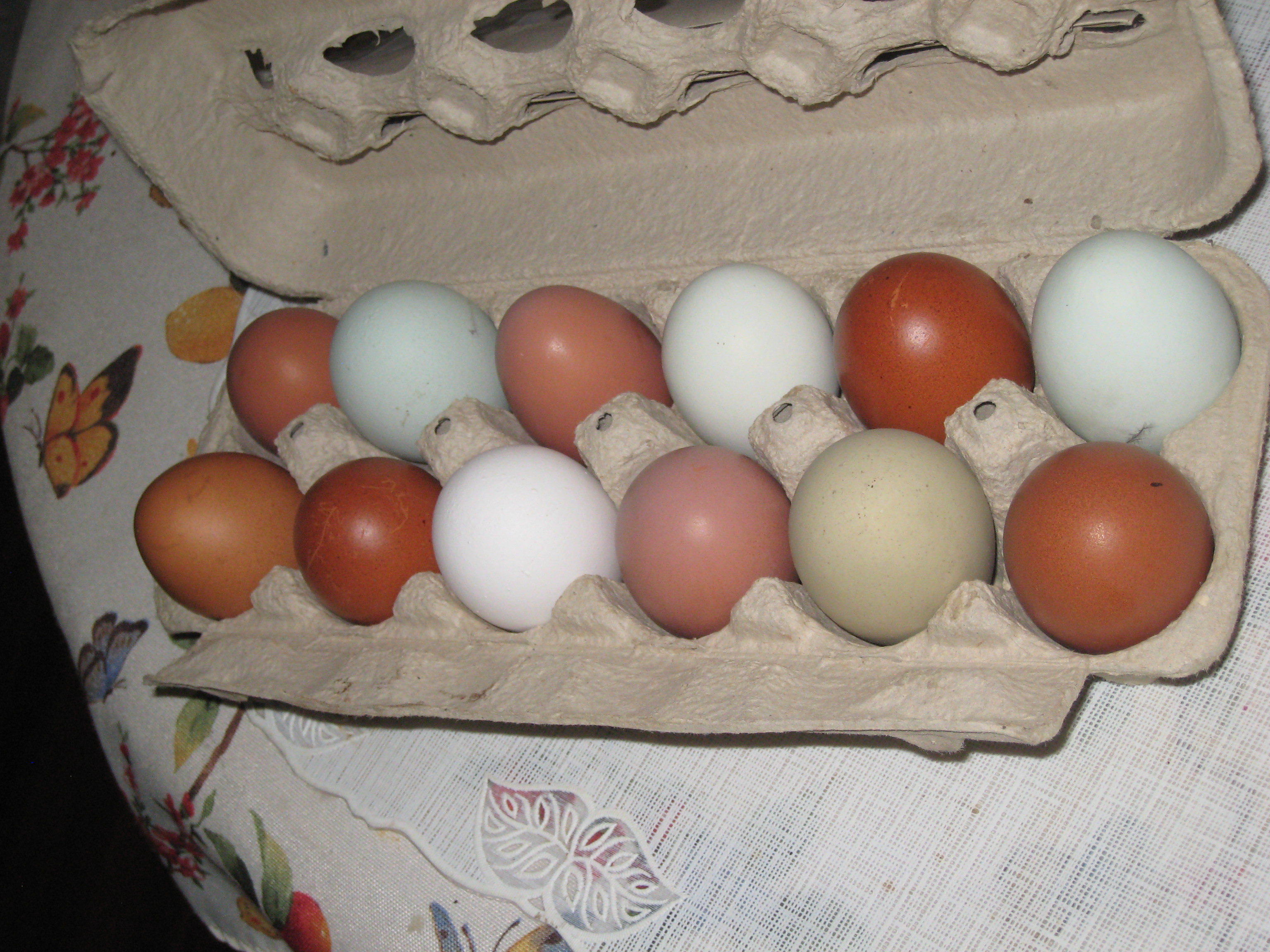 I just sold all my eggs for eating today, so all I have is some potentially in line for the incubator. My one blue egg layer is trying to go broody and declining to contribute...The darker brown eggs are Giant eggs--a couple of my best hens lay heavily speckled eggs, which is unusual for the breed apparently, but the hens don't know that :D . The one light brown is from an Orpington hen. The lighter green is Orpington x EE, and the darker green is Giant x EE. The white eggs are from a little Silkie cross girl with no white layer blood, and she's supposed to lay cream coloured eggs. Missing are cream coloured eggs from a hen that's supposed to lay white, and doesn't (Dorking) :/ because I sold those today too lol