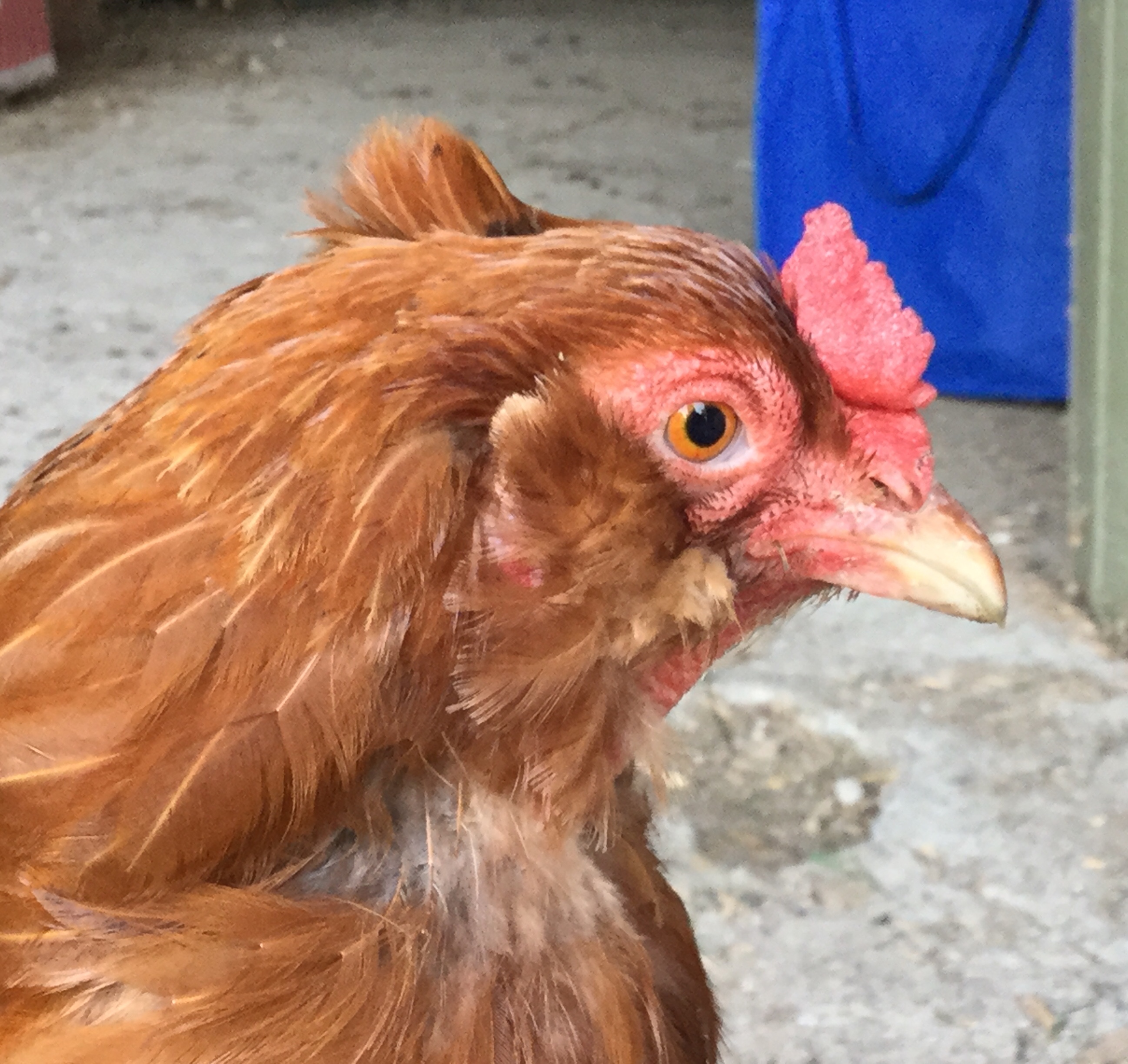 This is Nippy, a hen I hatched out about 4 years ago with a bunch of turkeys. She’s quite a character and fearless (probably because she had to put up with a crazy bunch of turkeys for the first several months of her life). She’s a cross between a New Hampshire rooster and a red brown Ameraucana. She has muffs and a small beard but her coop mates seem to like trimming them.