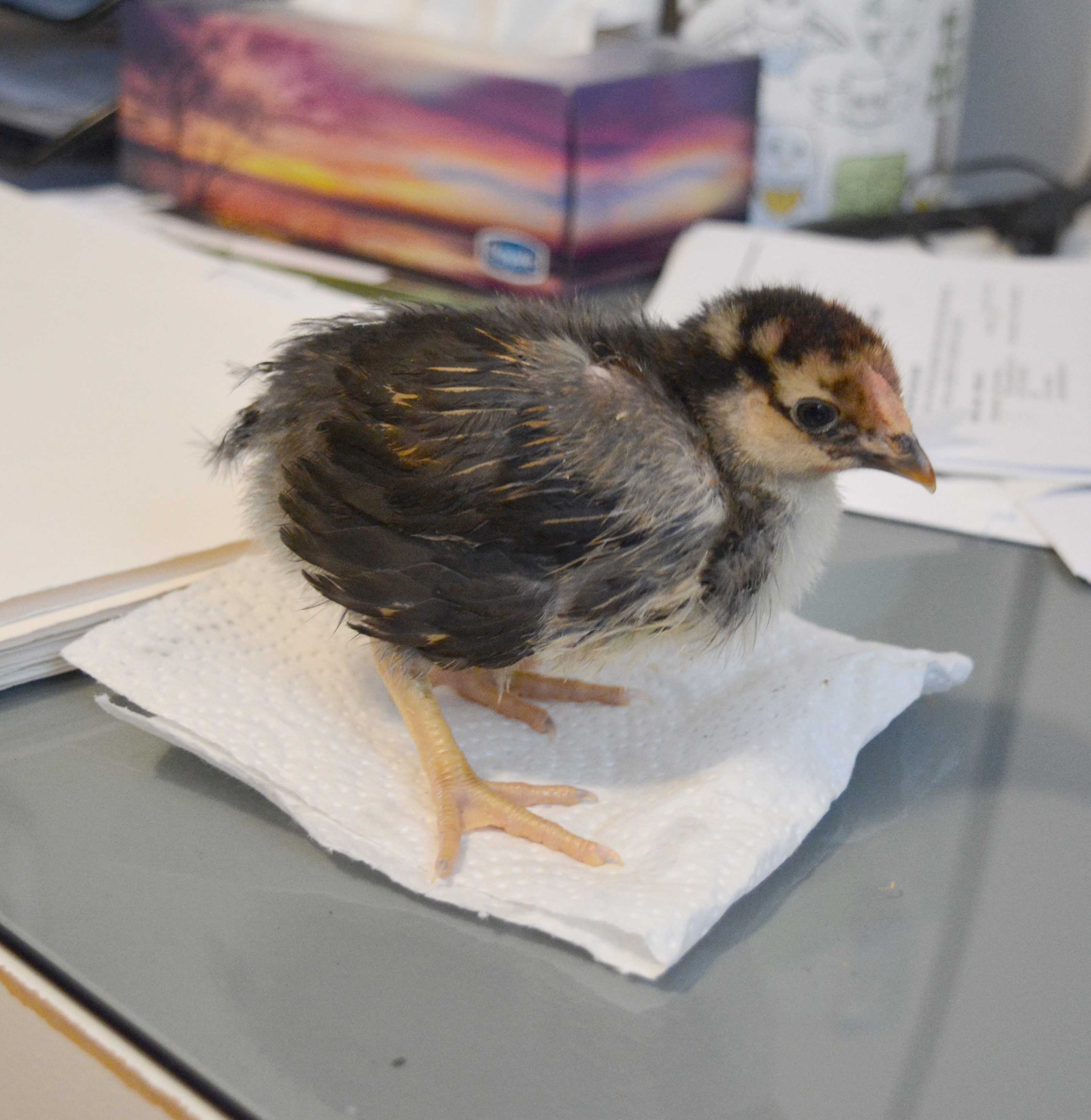 Update at 2 weeks. This little guy flew out of the brooder. Getting some gold on the top of their wings. They now spend more time in an outside heated coop.