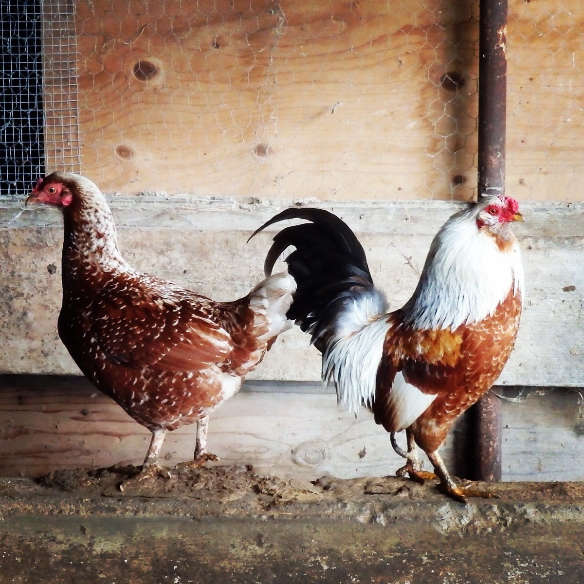 The Rooster is my 5 year old Araucana/Americana (EE) from McMurray Hatchery and the hen is a cross from my white laced red cornish bantam and mystery rooster?