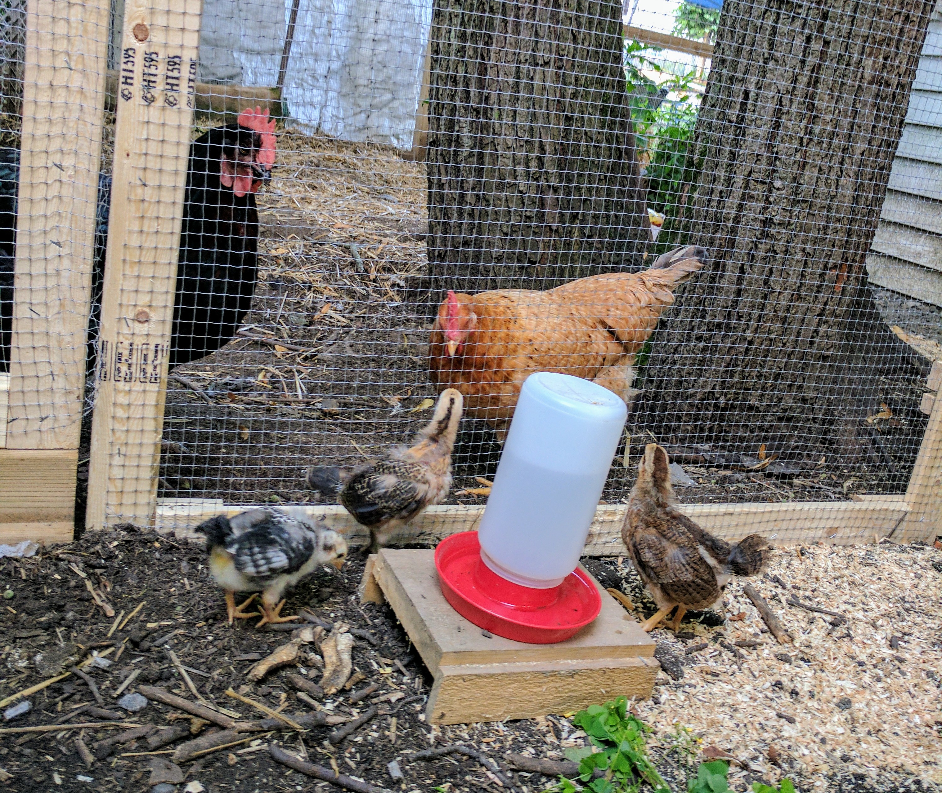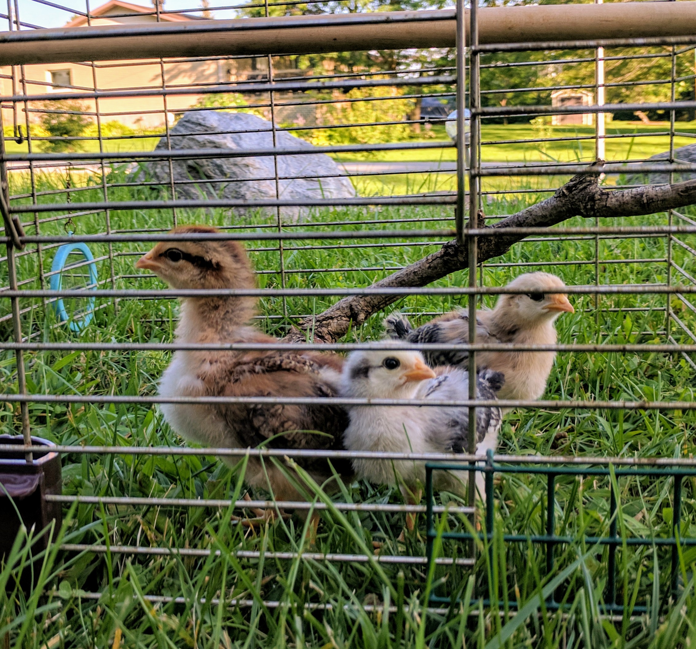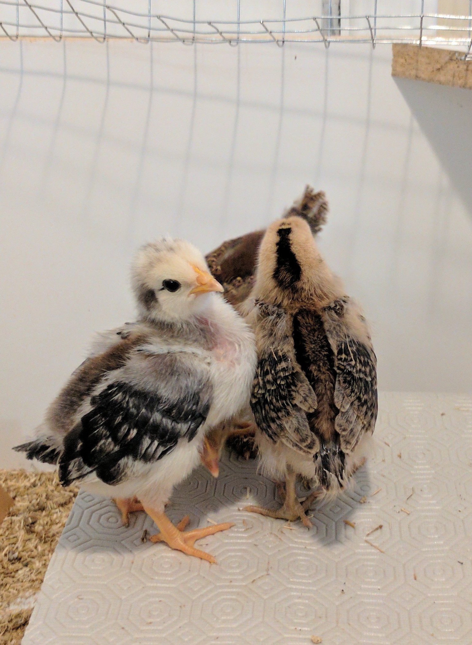 Two weeks old now, and they just spent an hour yesterday evening getting to know their outdoor space - the junior coop and run within the main run. The junior coop isn't quite finished yet, so they are still in the brooder in the laundry room at least one more day. This picture is of first introductions to Twyla and Penelope.