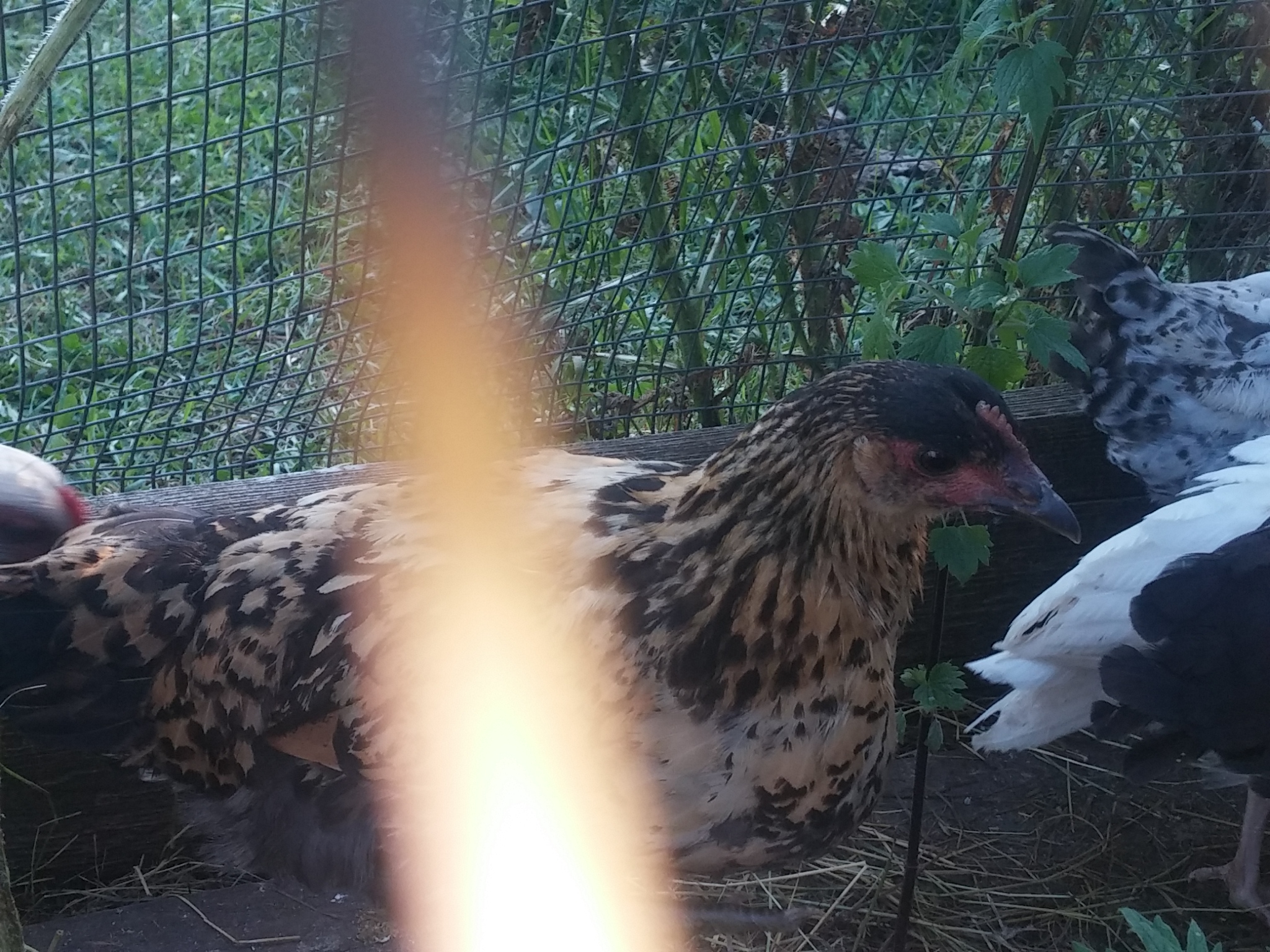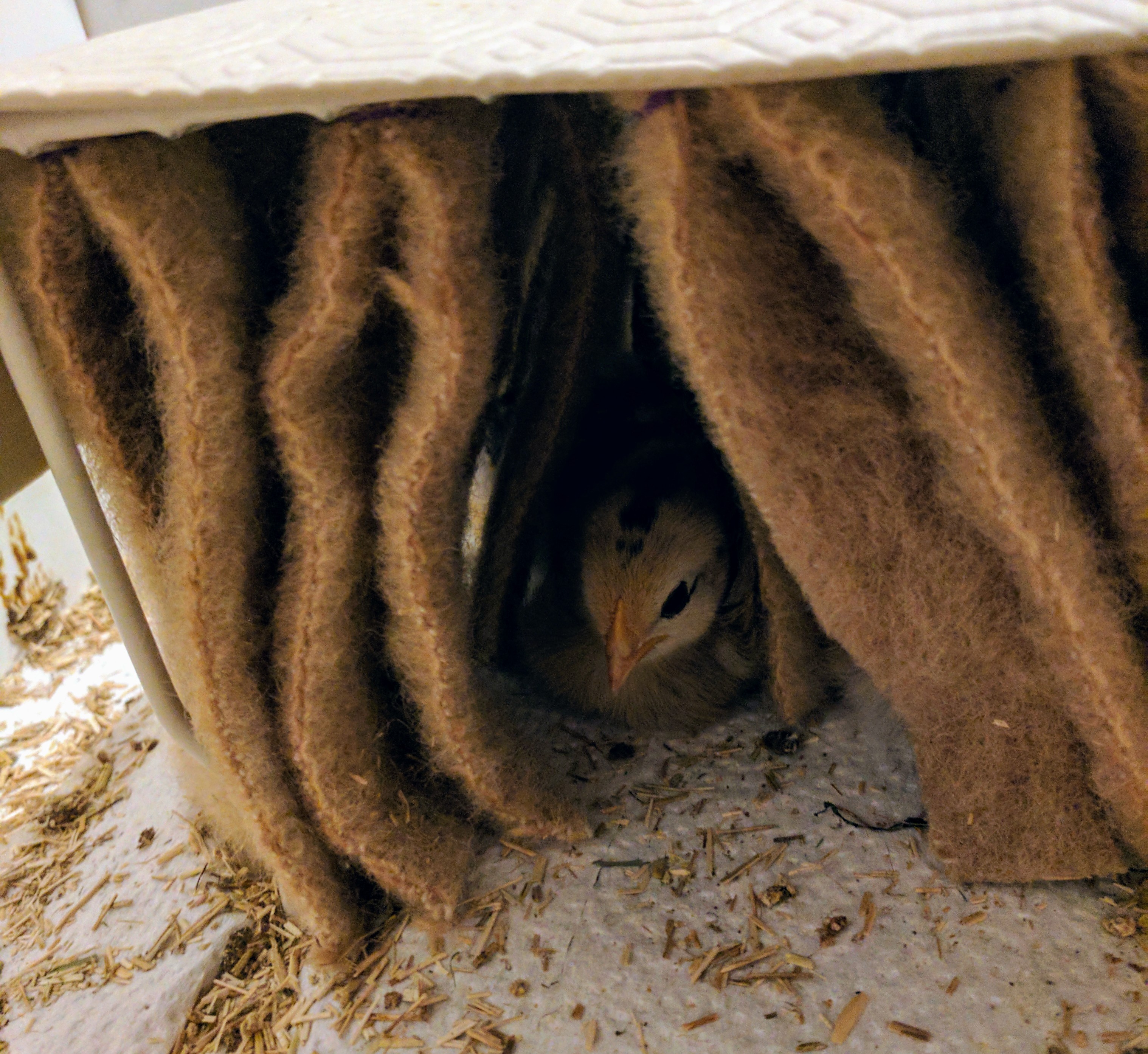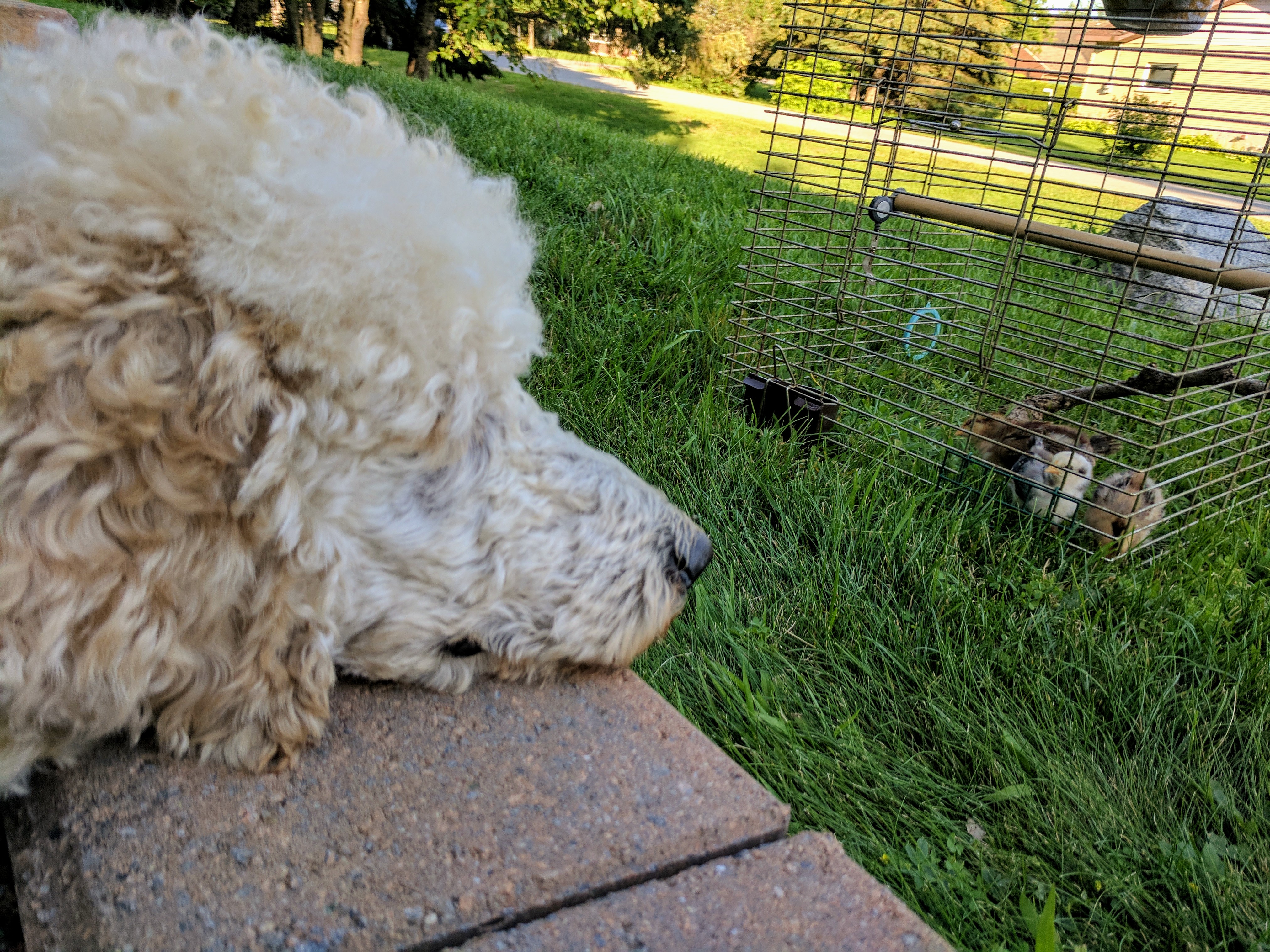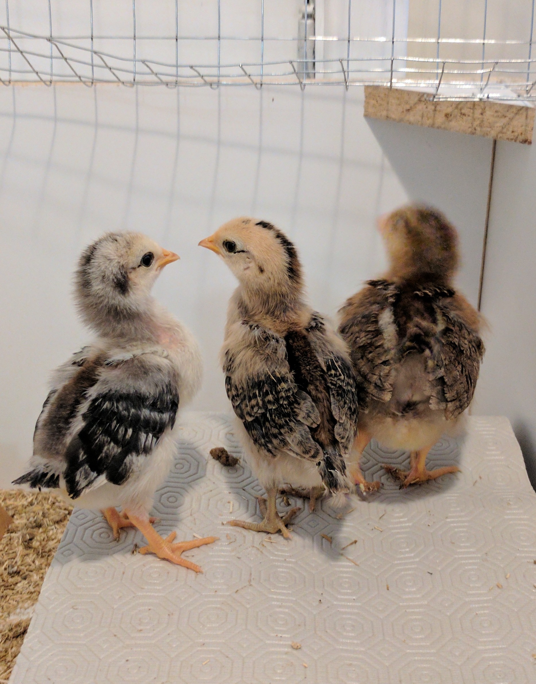 Two weeks old now, and they just spent an hour yesterday evening getting to know their outdoor space - the junior coop and run within the main run. The junior coop isn't quite finished yet, so they are still in the brooder in the laundry room at least one more day. This picture is of first introductions to Twyla and Penelope.