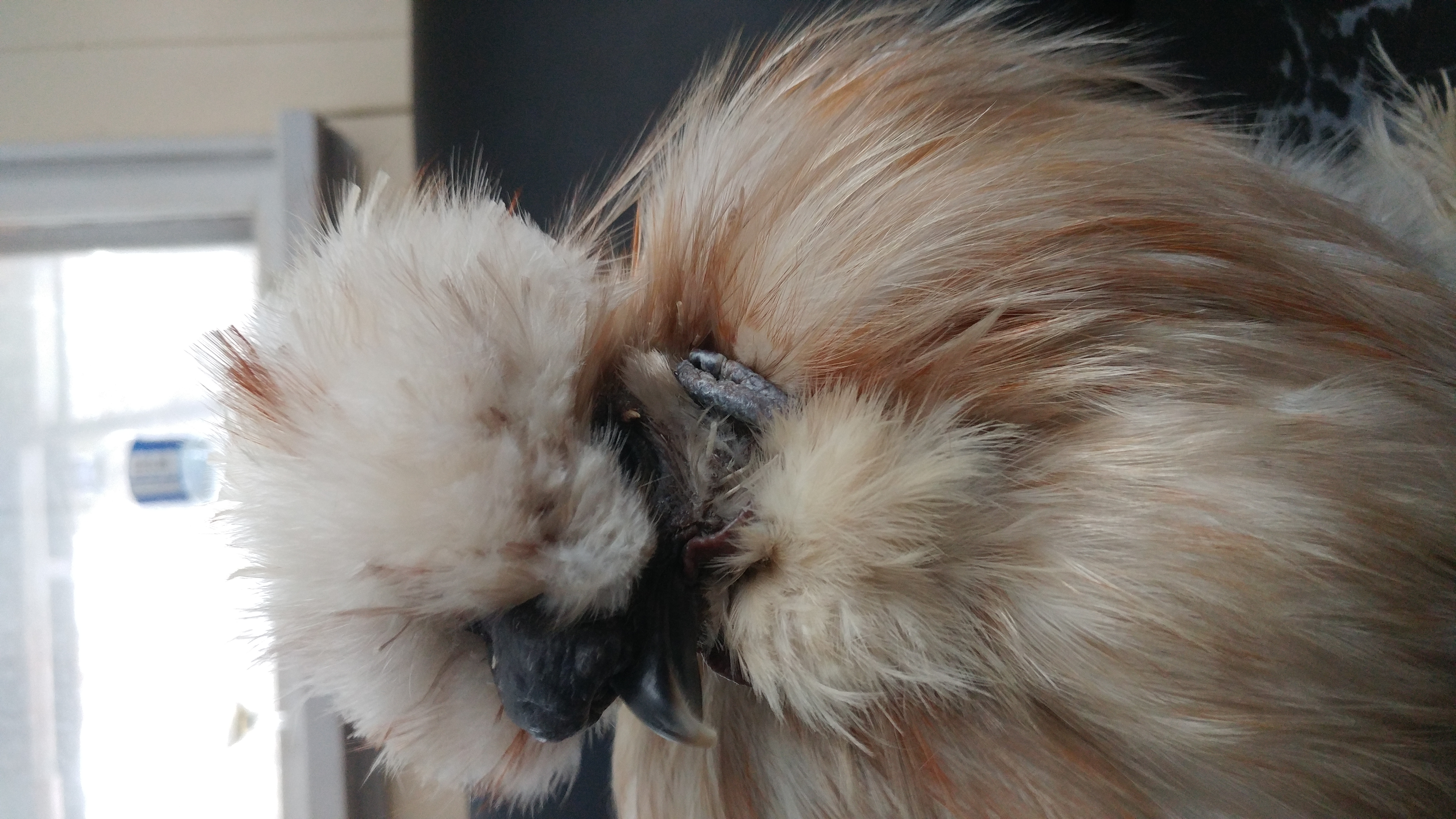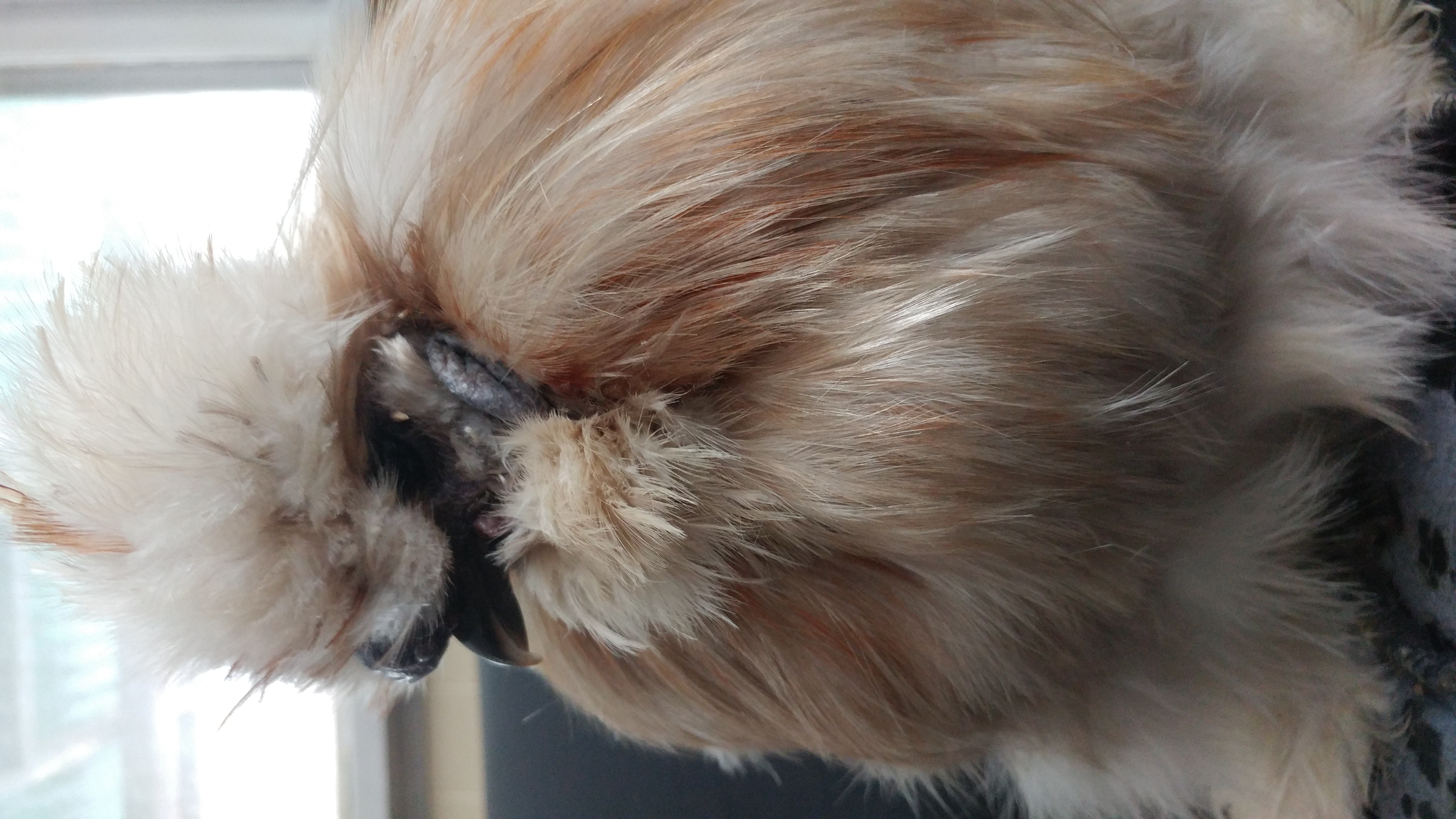 Feathers were plucked just below his eyes.
