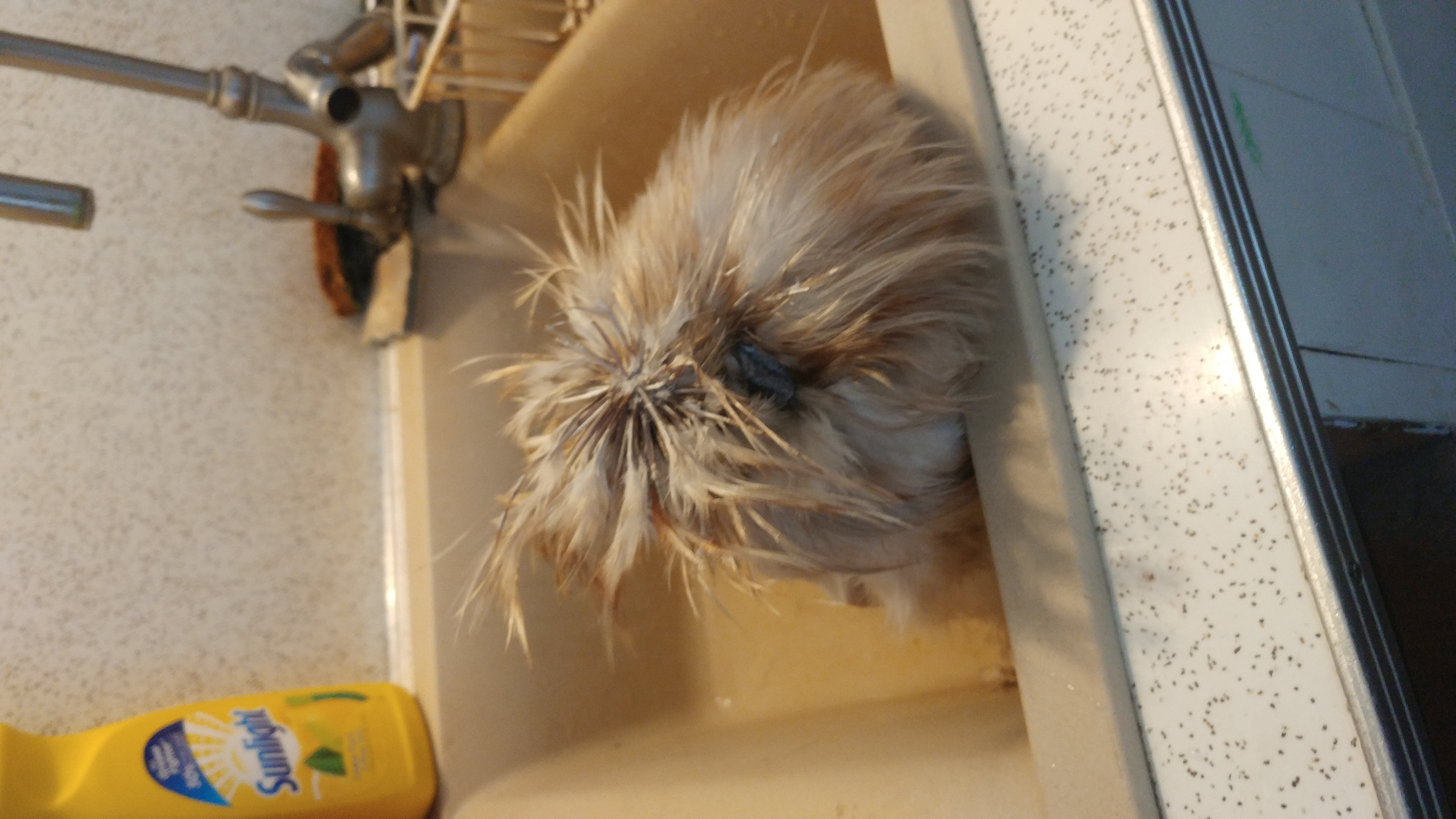 Here he is in the sink, no I don't use sunlight I use no more tears baby shampoo.