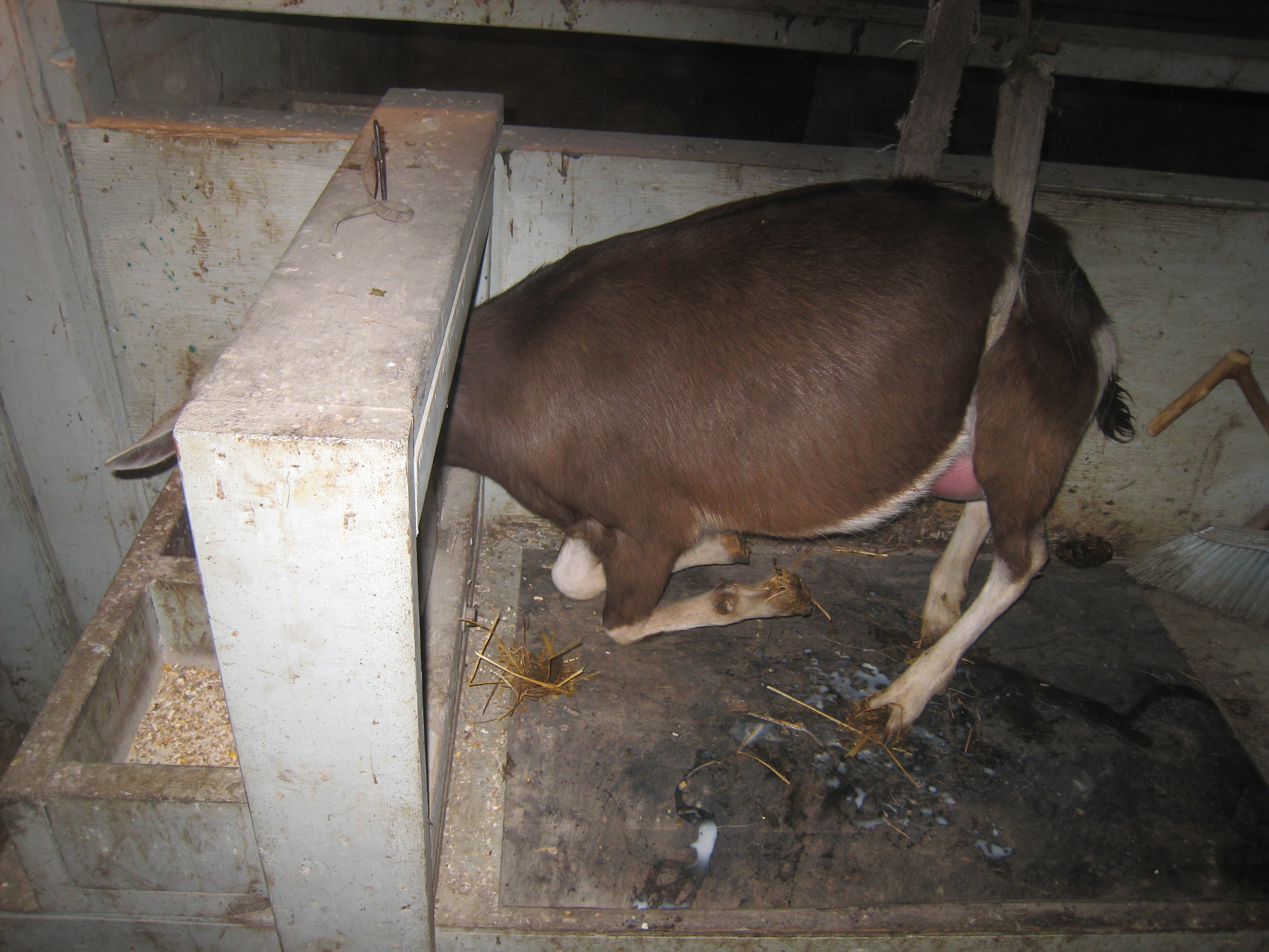 Cleo is a first timer. Training her to the milking stall. She needs emptied and massaged once a day to try to prevent any chance of mastitis. See how bright pink her bag is in the one pic?