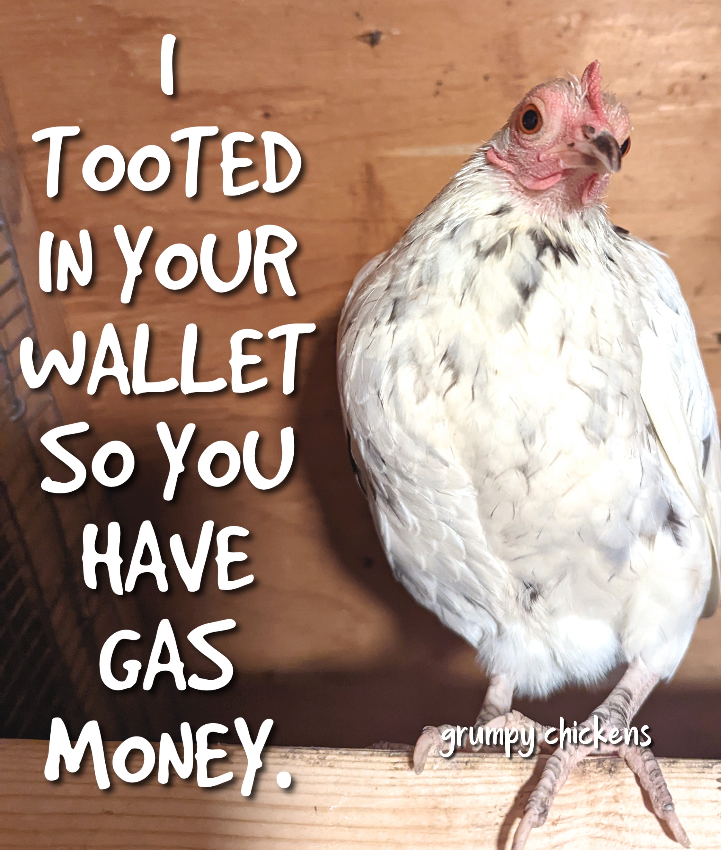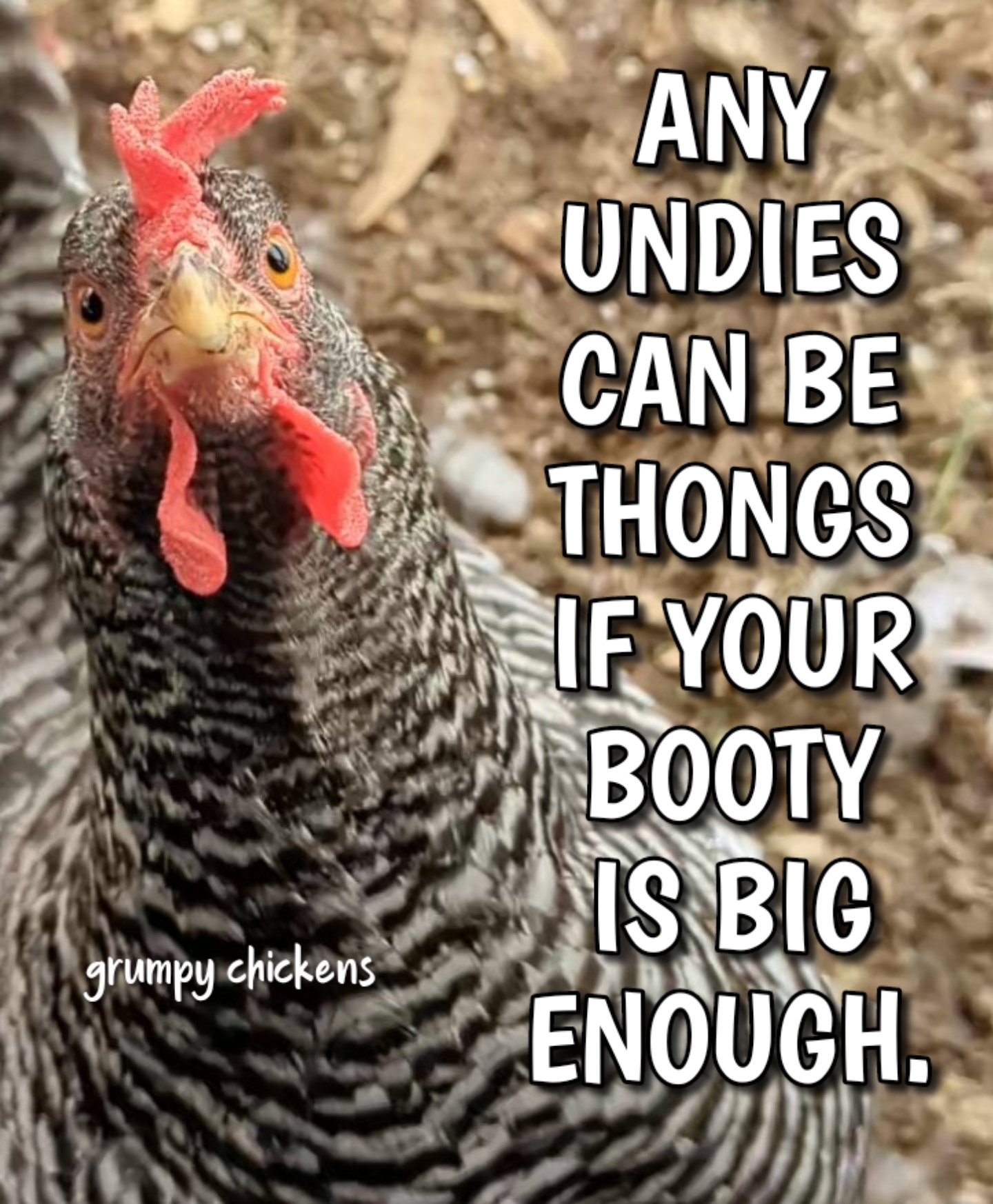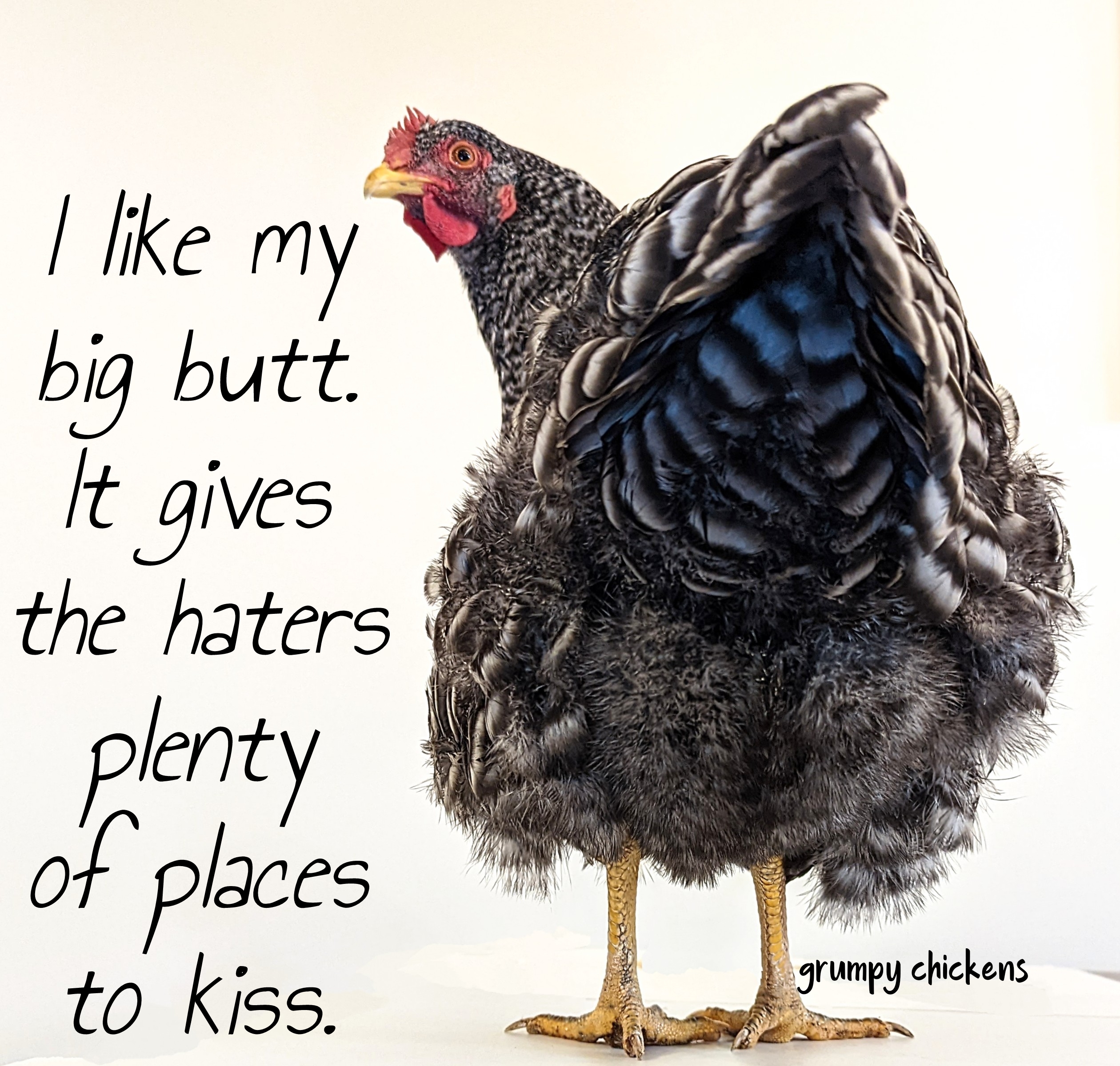 OK I am noticing a theme here. Some of your chickens appear to have body image issues! Tell them to read the correct breeds in the APA Standard of Perfection. I quote here "BREAST: Broad, round and deep" - yay for me."LOWER THIGHS - medium length and rather stout" Cheers ladies!