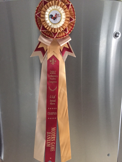 This female was Reserve of Breed Cornish Bantam .. got beat by a Nice White male from Tom Robuck from Virgina... I did manage to have one bird on Champion row.. in I had Champion Modern on a Brown Red pullet... Was a great show lots of fun at the show and apre show .. great people = Good times ! I have always said .. the birds are what bring us together but the people are what it is all about !