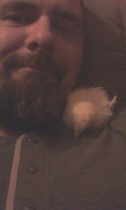 HAHA well I just had Chicky out, she curled up in my beard and went to sleep. I took a selfie, which made her jump up and crap on me but, I got the shot. LOL