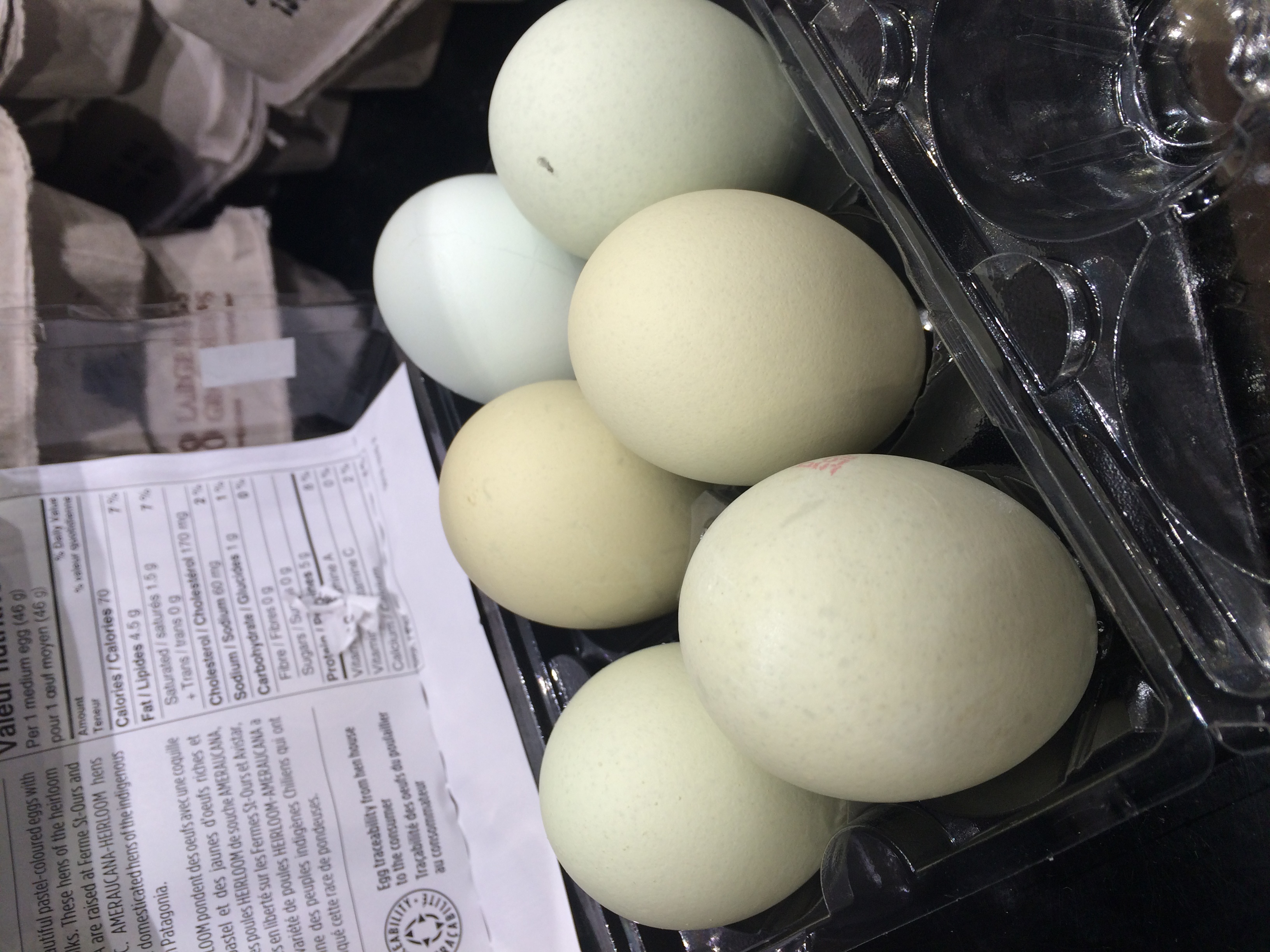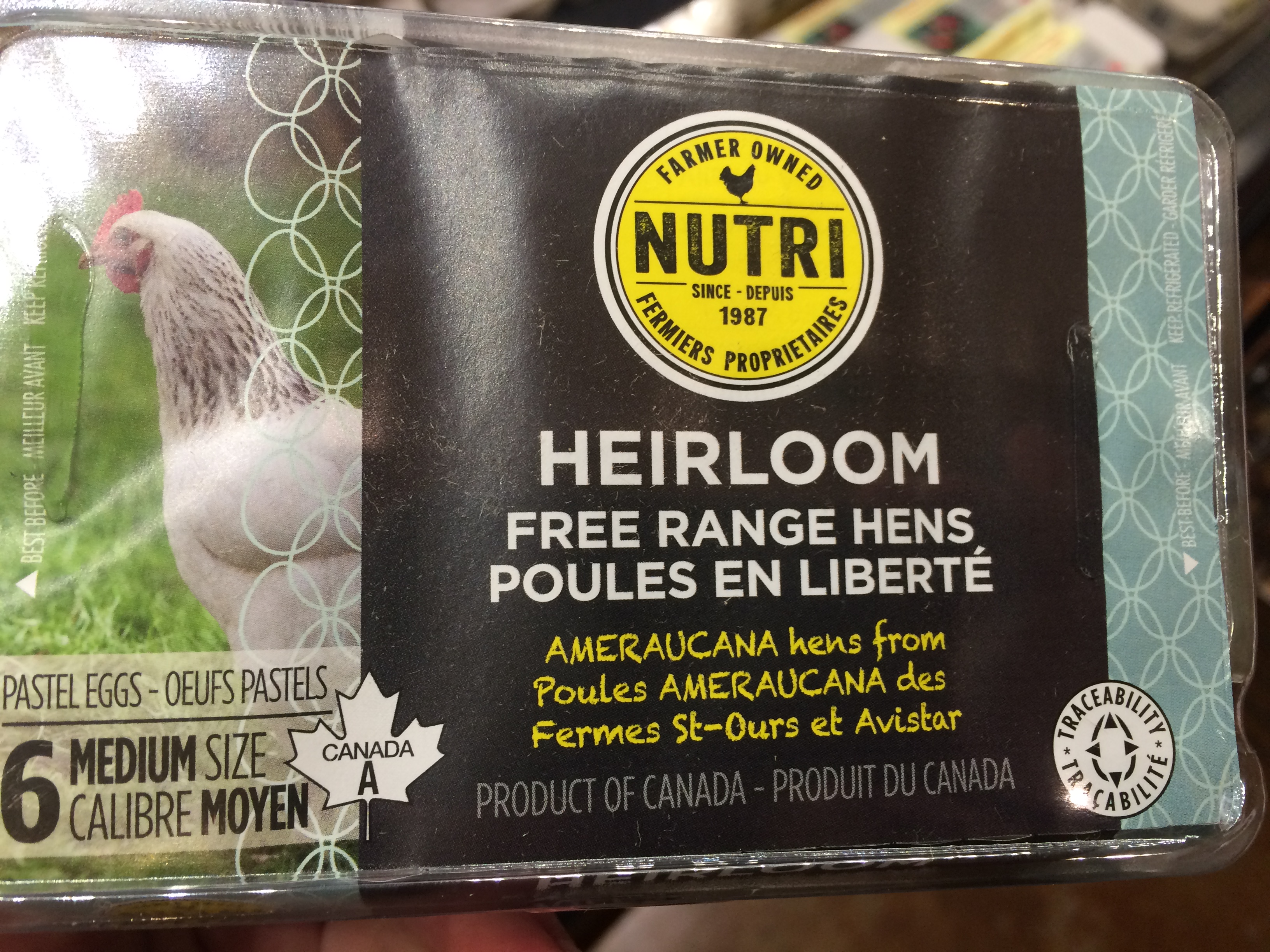 First time I have seen green/blue eggs in a grocery store. And the term heritage irks me. I asked the dairy employee why these eggs were more ($3.99 for 6) he actually said to me that the blue ones were healthier. I said can you prove that? He got another employee (mgr?) and I suggest that they re-educate themselves on egg nutrients and we had a little talk. No victims, I'm not always a super b*tch. At the end of it, that's just what he is being told from the higher up. I said, well if you're truly interested if you're bullshitting your customers or not, do some of your own reasearch and share with the ones who are telling you this crap. They aren't even fed organic feed. We had some laughs, like when I said chickens don't have super powers, you can't feed them