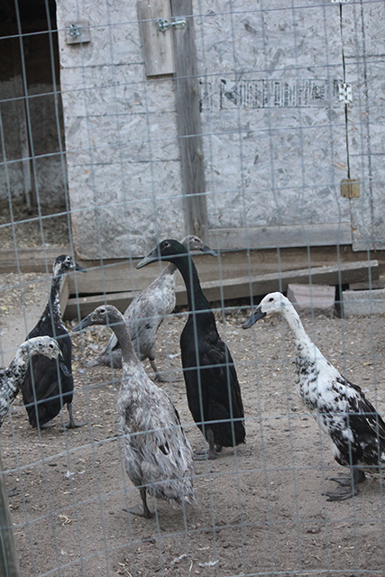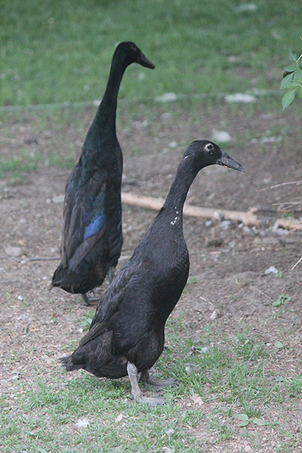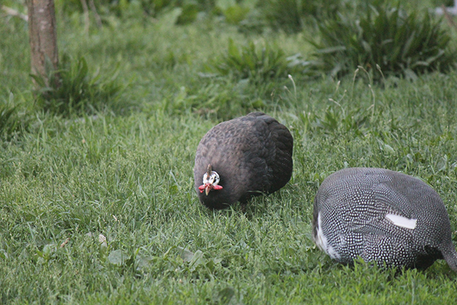 Runner Pair Older Runners from Holdereids Waterfowl in Washington Sky Blue Guinea Fowl Royal Purple and a Pied Guinea Fowl Yokohoma Males