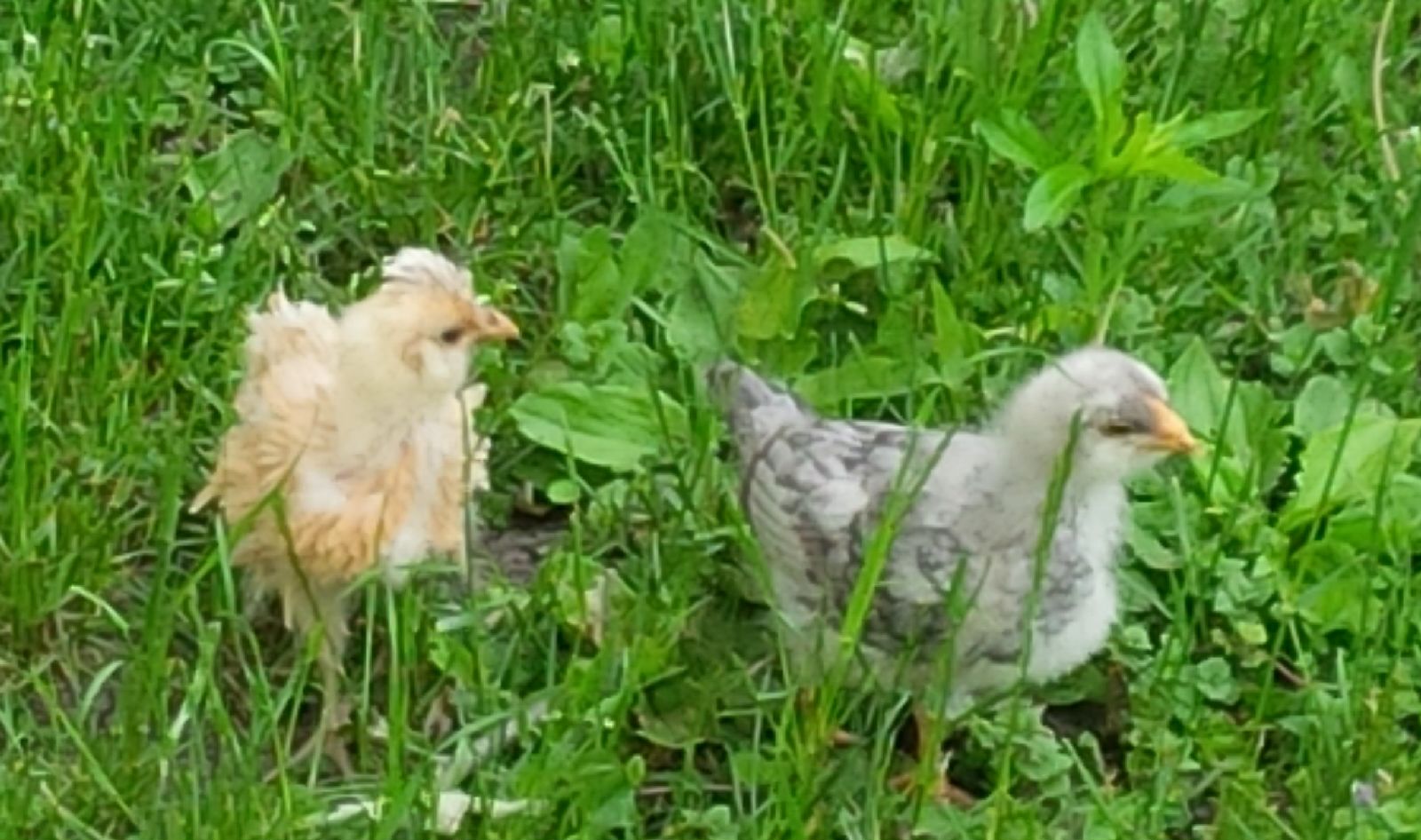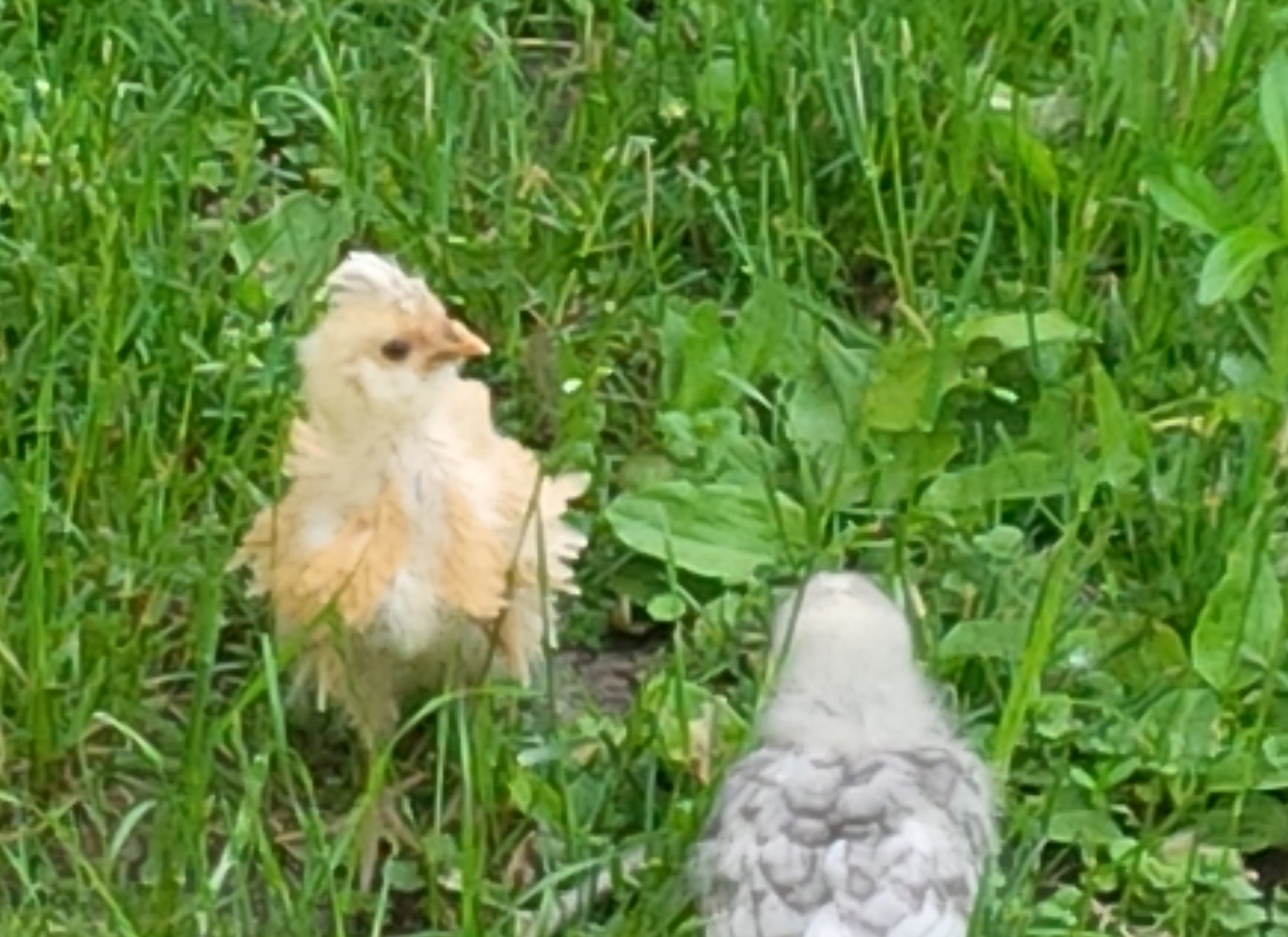 Sorry everyone: I think I may be partly to blame for the confusion, since my post was kind of confusing. Okay, it's not the post so much as me: I'm confused. I second-guessed myself, based on what I was seeing instead of what I thought I was told, which was that one was a frizzle Ameraucana and the other was a Polish. I assumed that the little one with the crest was the Polish, and the blue one was the Ameraucana. Yesterday and this morning I took another closer look at them, and I think the crested one is in fact supposed to be Ameraucana and the blue one is Polish, because the little blonde one has dark legs - but not slate, exactly; they have kind of a green tinge to them under some lighting conditions. So still an EE, I think. Just not the chick I was thinking was an EE. What I don't understand is why the "Polish" doesn't have a crest. WWW, I tried getting some better photos of the dark chick's comb, but (a) my phone camera is crappy and doesn't seem to be able to focus, and (b) she/he just never stands still long enough. Here are some pics from yesterday anyway. Whatever they are, I think they're cute.