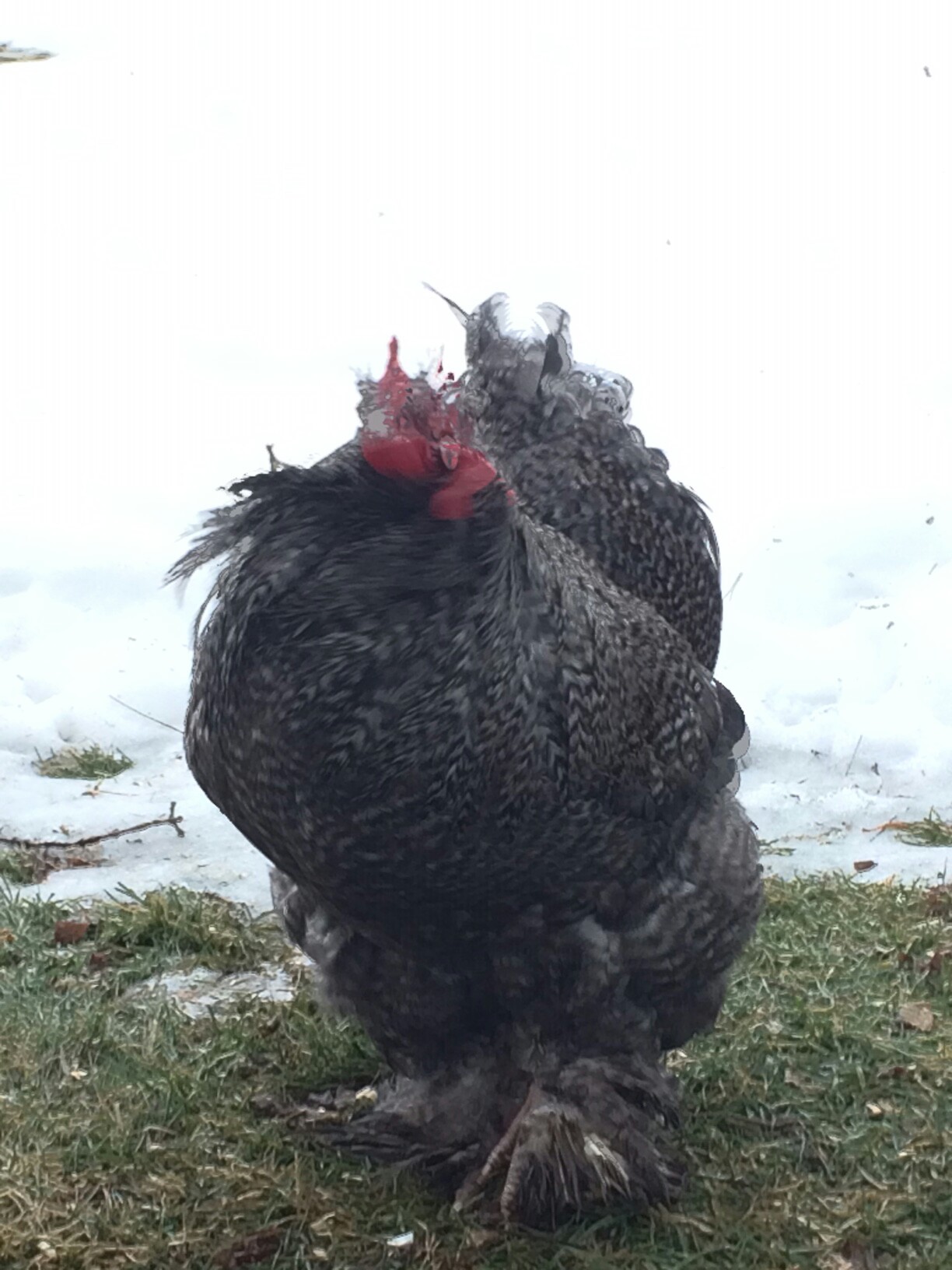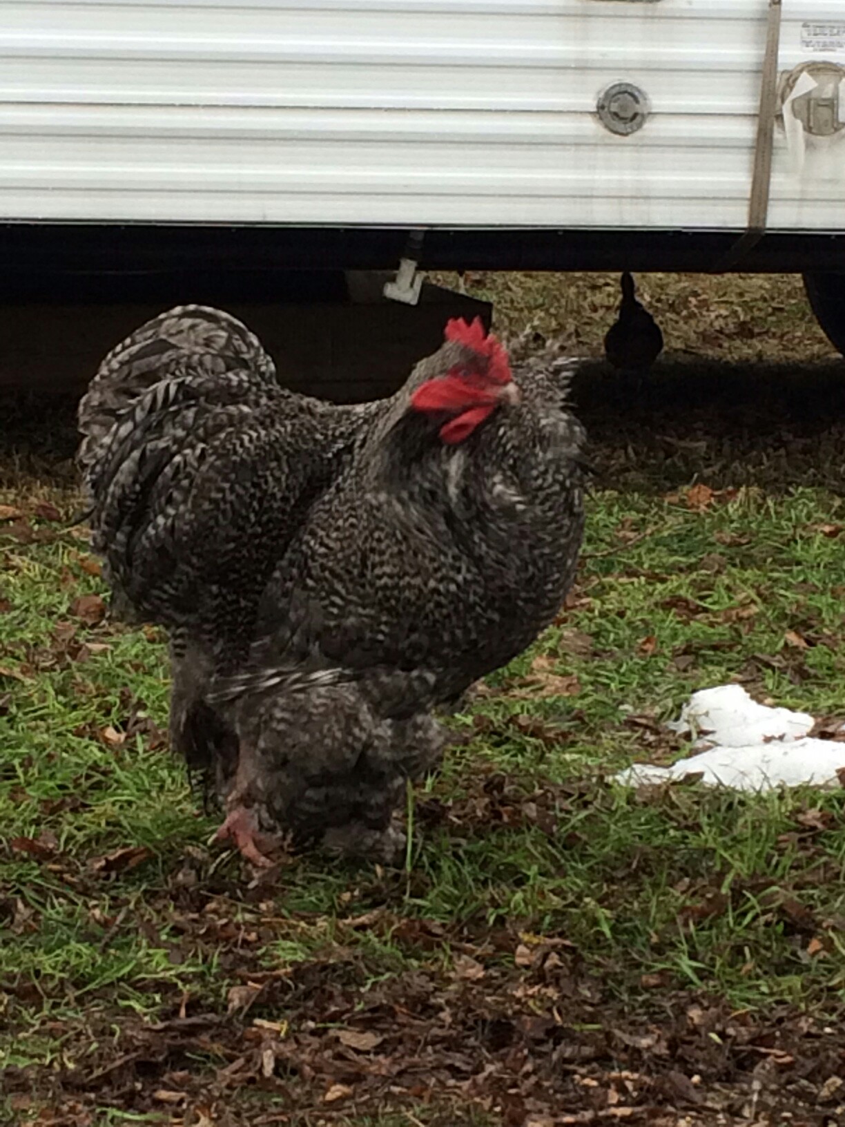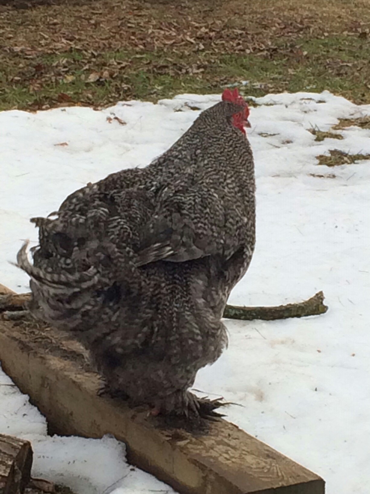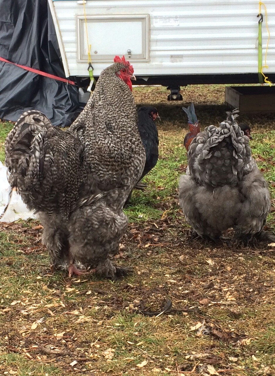 He's a barred large fowl Cochin. Yes he's a good boy...Very gentle and loves attention. He's not as generous with his girls at treat time as I'd like but he's still immature. Will be a year old end of April.
