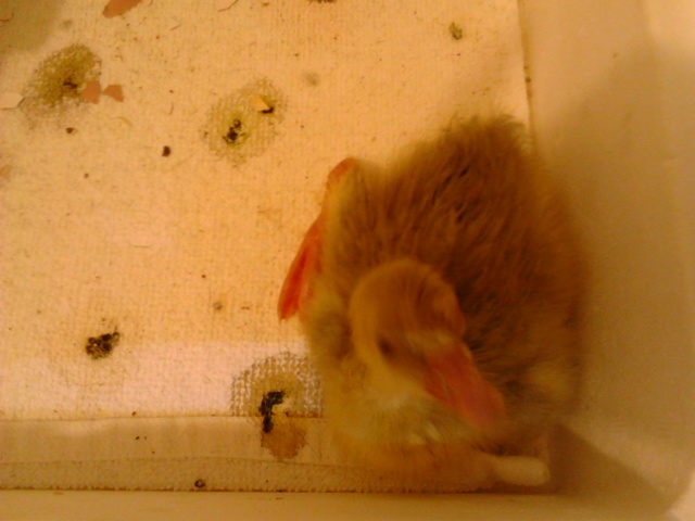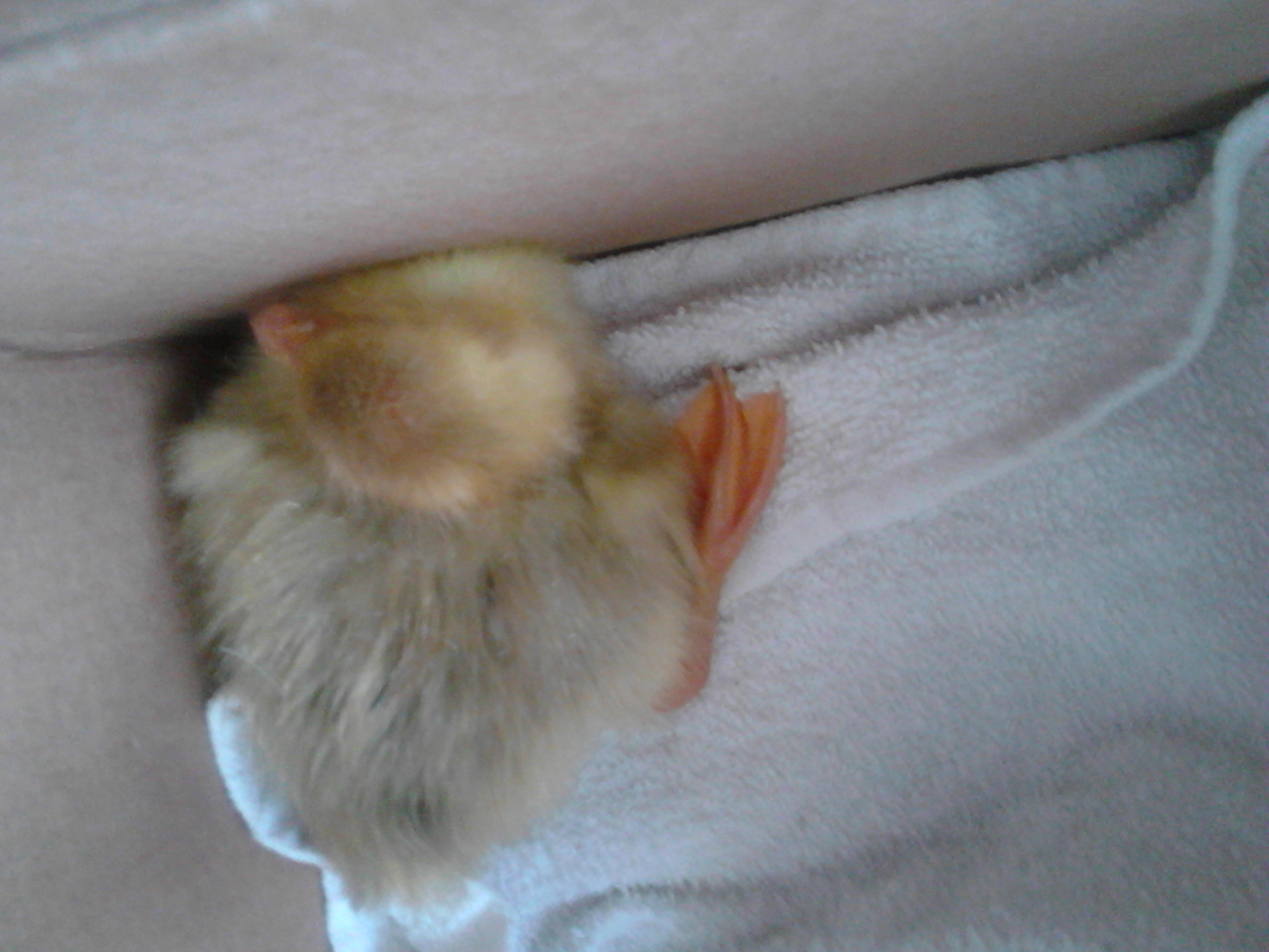 So, being an "only", we have a problem. I've named him. His name is Nugget. He's had his first meal, first walk/run/fall over and flail about, and he's imprinted on people. He's only happy when he can see a person or is tucked into a shirt. He's currently in a box wrapped in a towel, and I'm having to kick/wiggle the box to simulate me carrying him around, or else he pops out of the towel and yells. Loud and long. I tried Jaye's awesome little fake mama, but it wasn't fooling Nugget for a second, unless I wiggle the box. It's like rocking a fussy baby lol! It's going to be a very long night.
