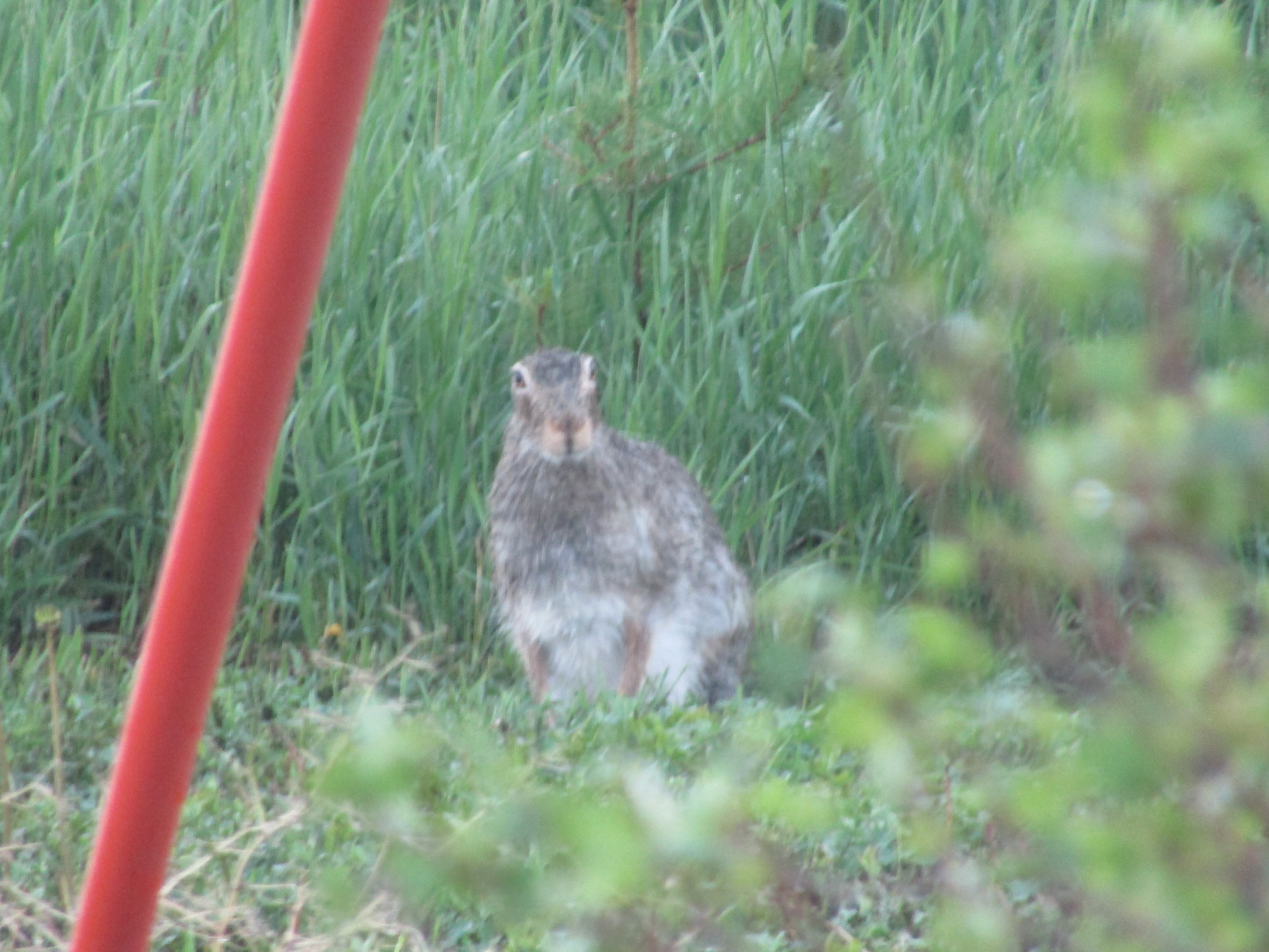 Yesterday we had several thunderstorms with heavy downpours. In the afternoon I saw something sitting in the yard. From the house I thought it was a bird. I got my camera and zoomed in. It turned out to be a very wet jack rabbit with its ears down. :)