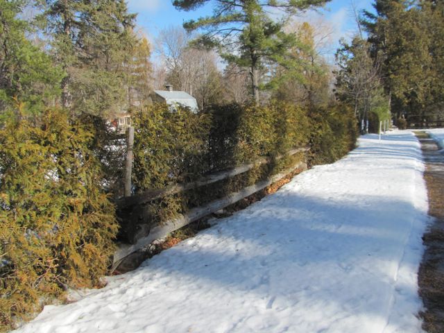 Deer are making a hash of my cedar hedges, must admire their systematic "post to post" approach, left side done, right side saved for next full moon? That used to be one continuous hedge, with the rails completely hidden. Sort of forgot they were there.