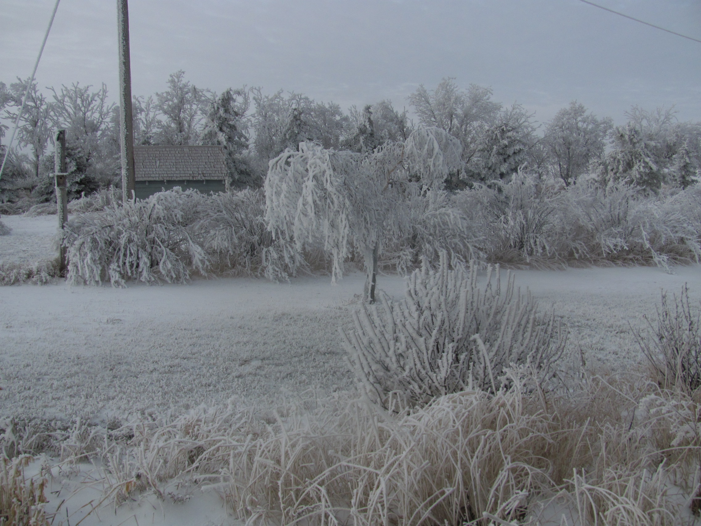 There's not much snow here. We had freezing rain last week and then 3 days of heavy fog. The frozen fog made frost so heavy it is bending some of the trees, and interfering with the power lines. Only house sparrows, a ton of mice, and 1 snowy owl around for critters.