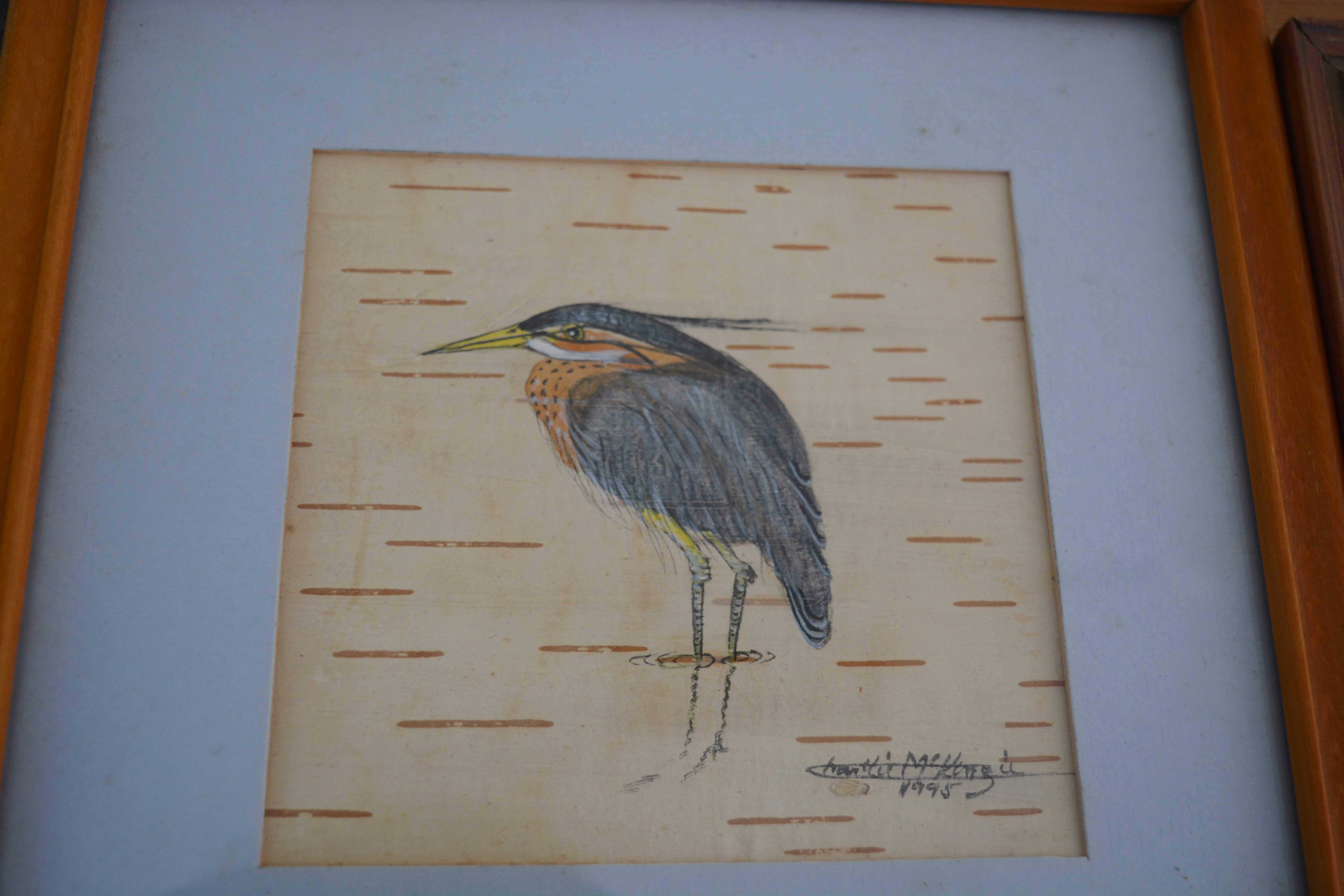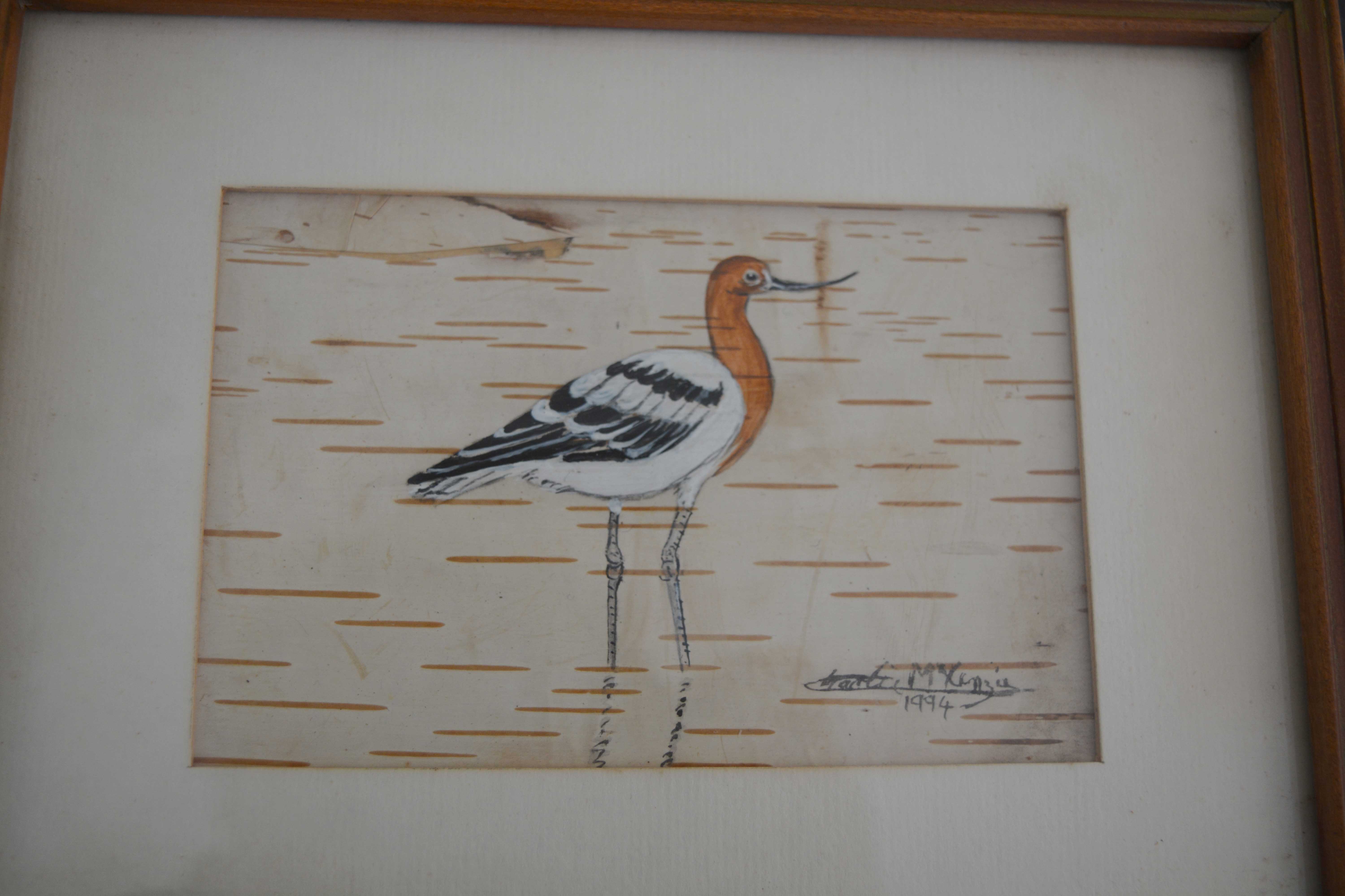 Either very fine birchbark or birchbark paper. They are an American Avocet and the other is called a Purple Heron and is a rare visitor it seems. They are by a Cree artist, Charlie McKenzie, who used to live in the Rideau area. Couldn't believe people were ignoring these!