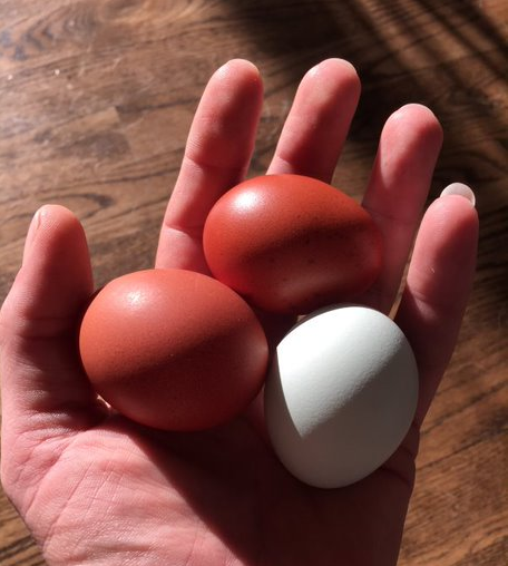 Such nice perfect oval eggs and lovely contrasting color! Those Marans eggs make such a nice foil against the lighter eggs. What other colored eggs are you expecting to get?