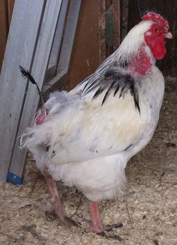 This is our Light Sussex roo Dick. He's a great roo and has now survived 2 dog attacks in the last year plus the ravages of the bitter cold this winter. The hens love him so much they've picked his neck clean! But through it all he's a sweet gentle giant..