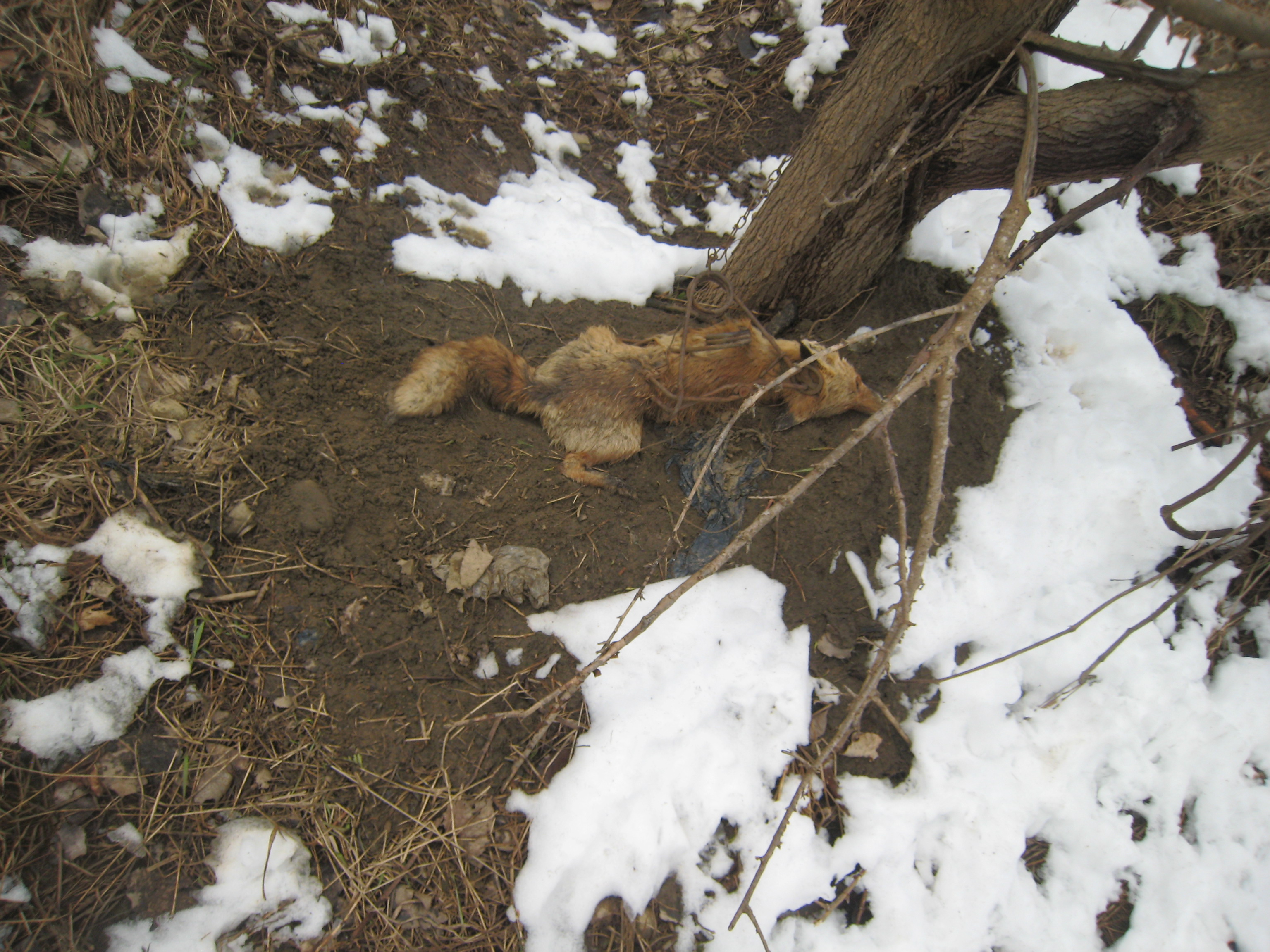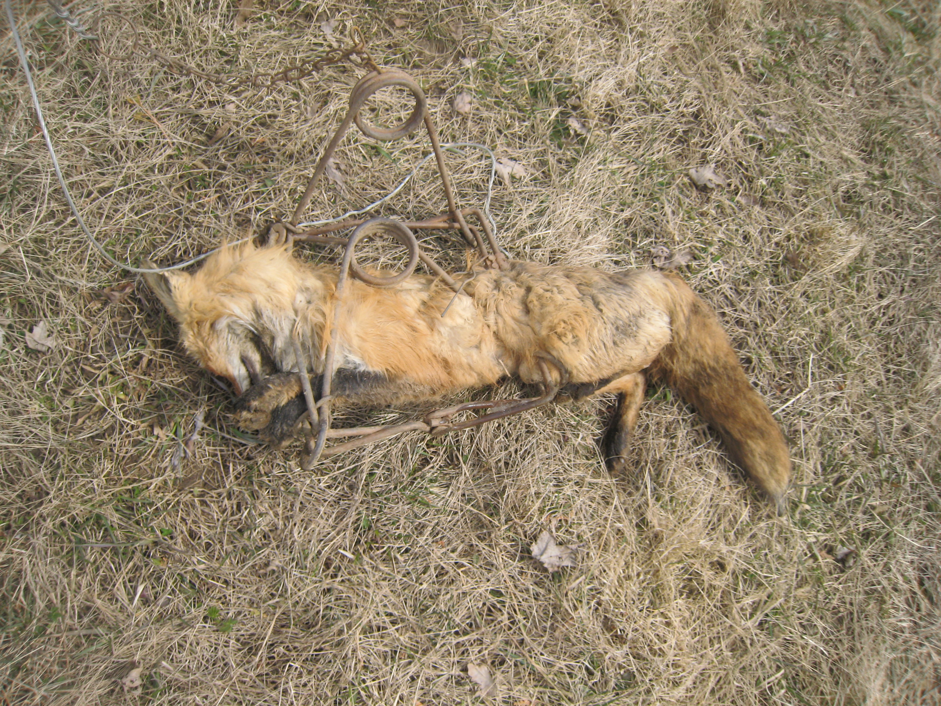 Pic of the 330 Conibear trap set over the back entrance to the lair. Another was set at the main entrance at the base of a tree. Pic of the vixen I caught still in the trap. See how that 12" square closed two places, neck and hips? She was almost instantly dead. I will not use foothold traps. This size Conibear is great for coon, skunk, fox and coyote. I had an easy set at the den there, but fox and coyote are usually harder to get. I won't bait for them as I don't want to get a dog or cat.