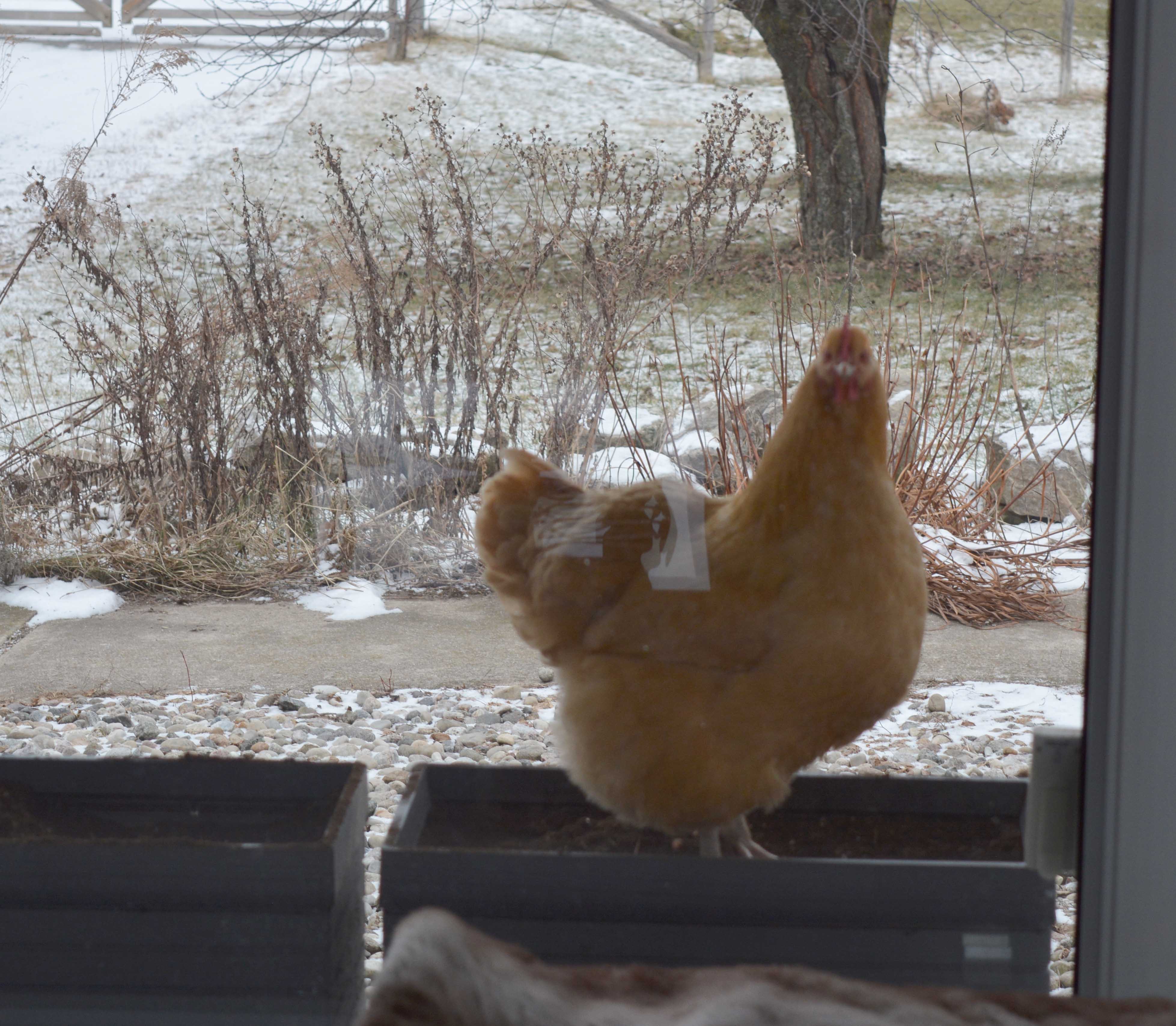 I can arrange it! Seriously though they are very sweet birds. Run to the door like those whiligig things. She's only 7 months old. The 2 orps and the 2 chanties hang out and they always look so guilty when they see us watching them! It's nice they can still have a dustbath in January. I still have Kibbles and her daughter but they aren't silly and stay in when it's cold.