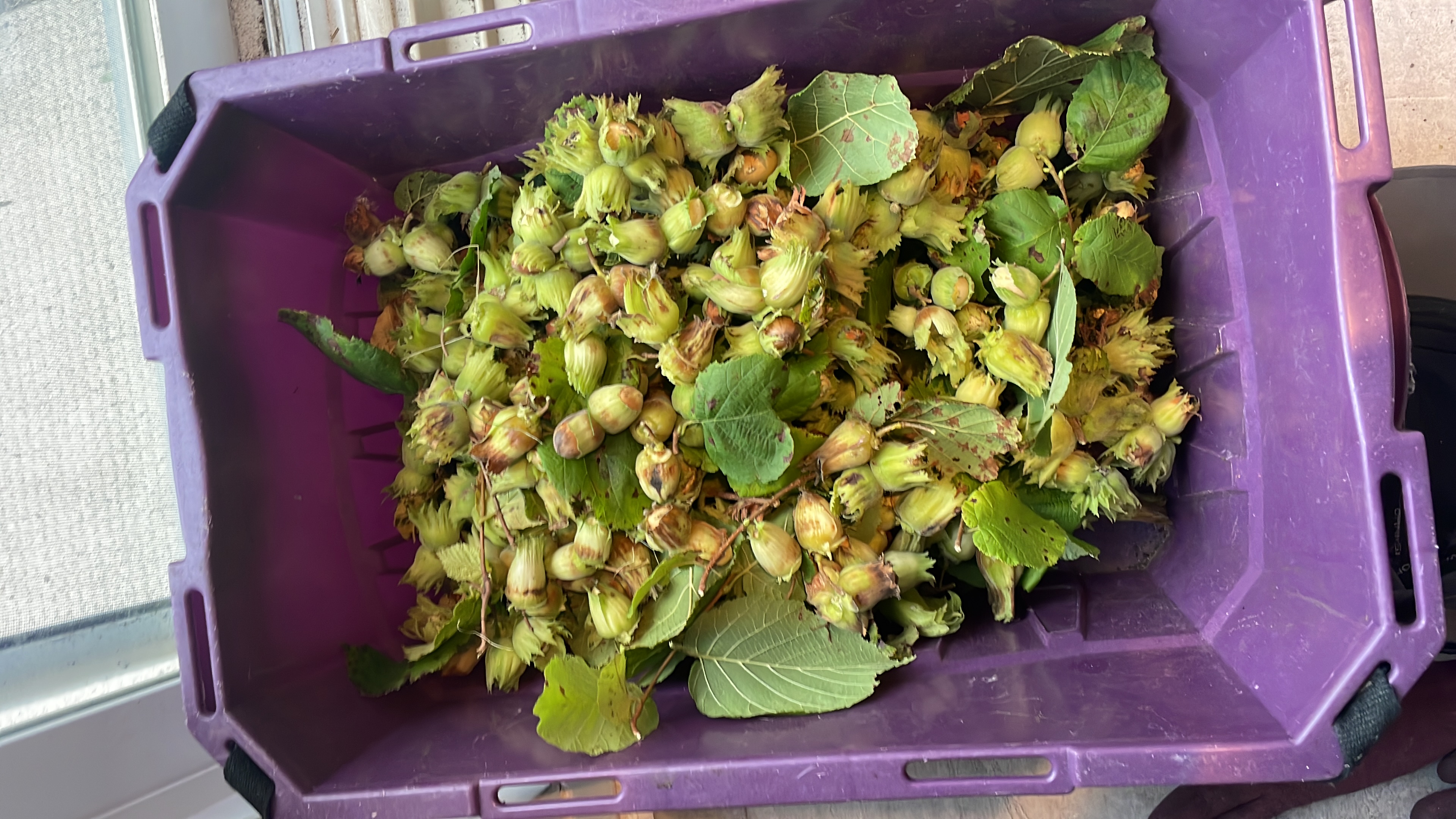 Went out and found the hazelnuts were ready. Loads more on the ground from the wind.