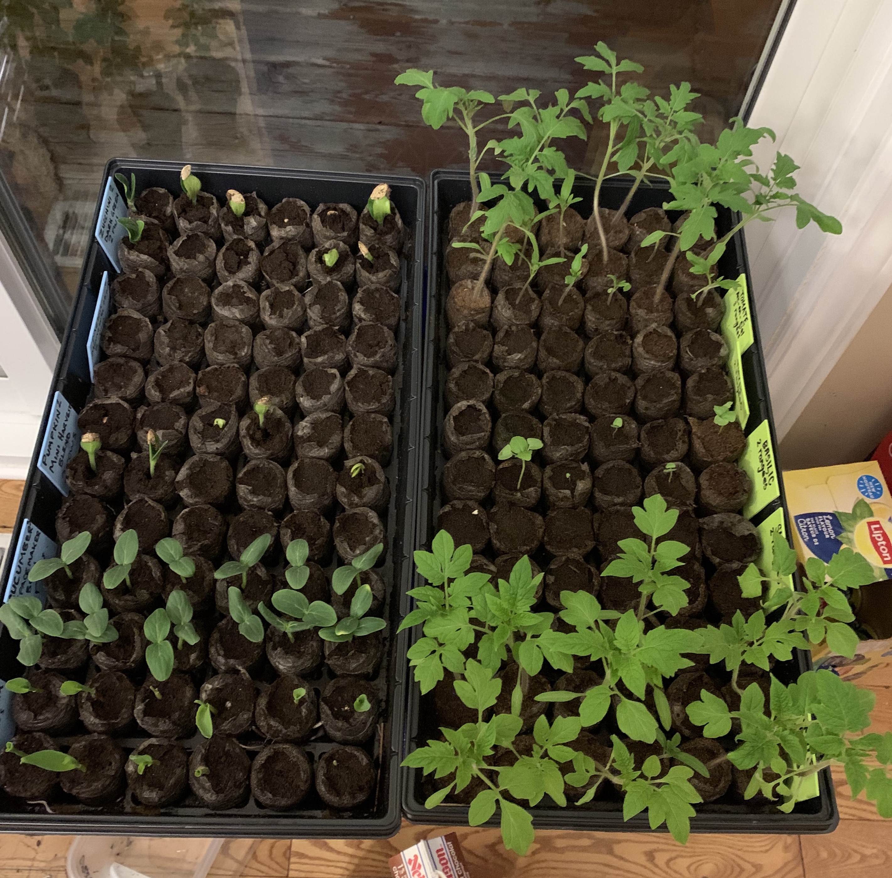 I use to start my seeds in my science classroom, but switched schools and have not planted much of a garden in about 4 years. Changing that this year. I normally use seed heating mats, but my mats are at my school and not allowed in there. So nothing fancy this year we have 2 Jiffy pellet trays that are sitting on top of our blue box in our south facing patio door and another tray sitting on the floor. So far so good.