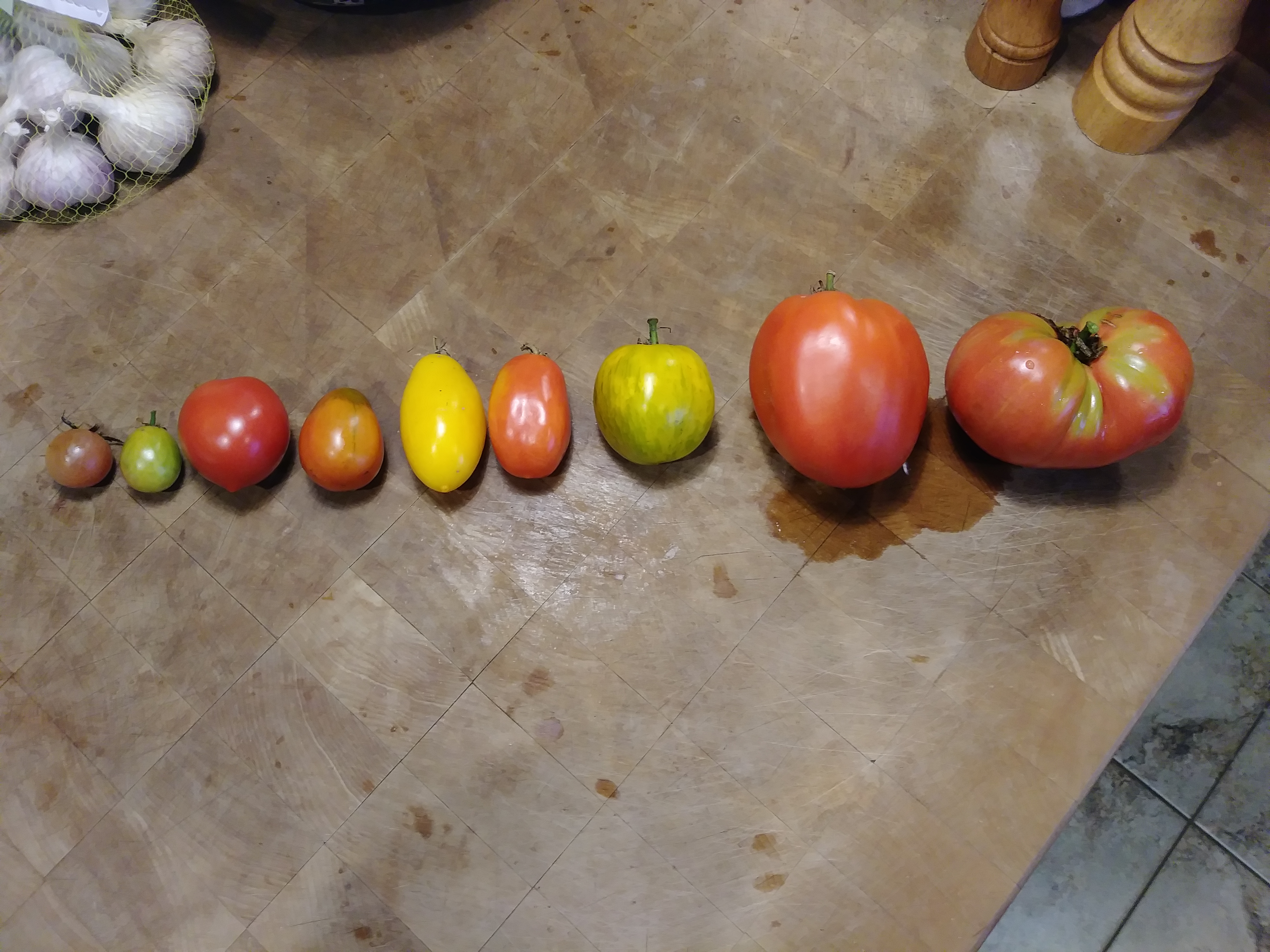 Not sure that this is a 'reply'... But thought i would throw this out there ...my tomatoes this year...only one missing is the dwarf Tiny Tim cuz the damn chipmucks got all the ripe.ones...lol..hope one ripens before frost for the seed...anyway, left to right, Black Cherry (not that black this year)..Isis Candy...Tom's Fantastic Patio, Black Plum, Banana Legs, Amish Paste, Green Zebra, Ernie's Plump and Beefsteak....collecting seeds and willing to share...