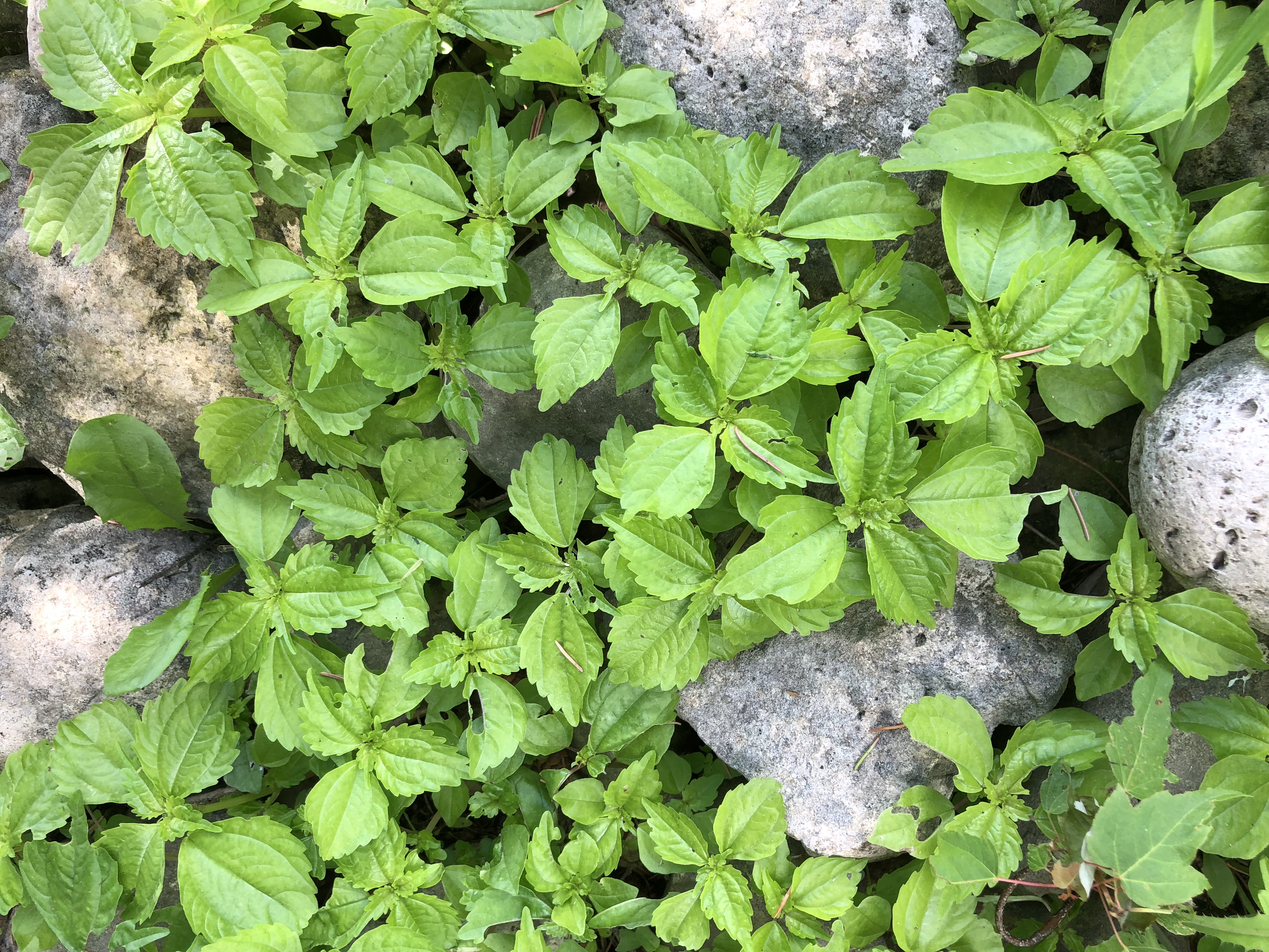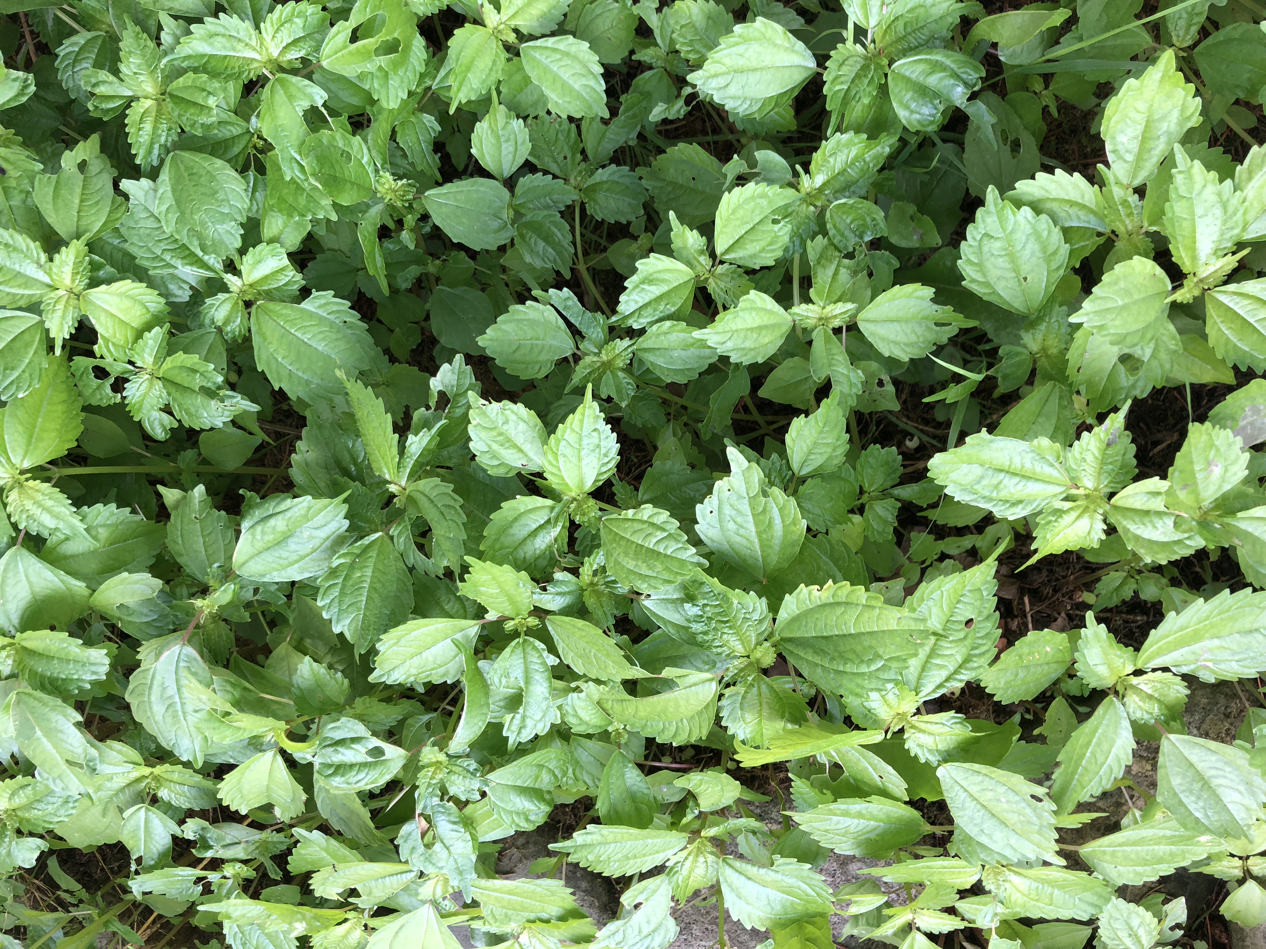 stinging nettle for sure, just pull it when little the "stinging" parts aren't bad when little....when it's over a foot tall wear gloves! and if you do get stung rub wet sand over it....trust me.....it works for me....