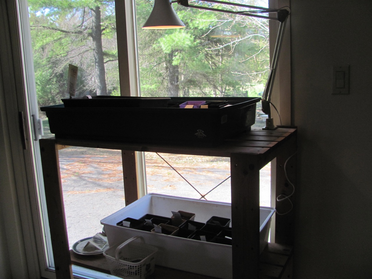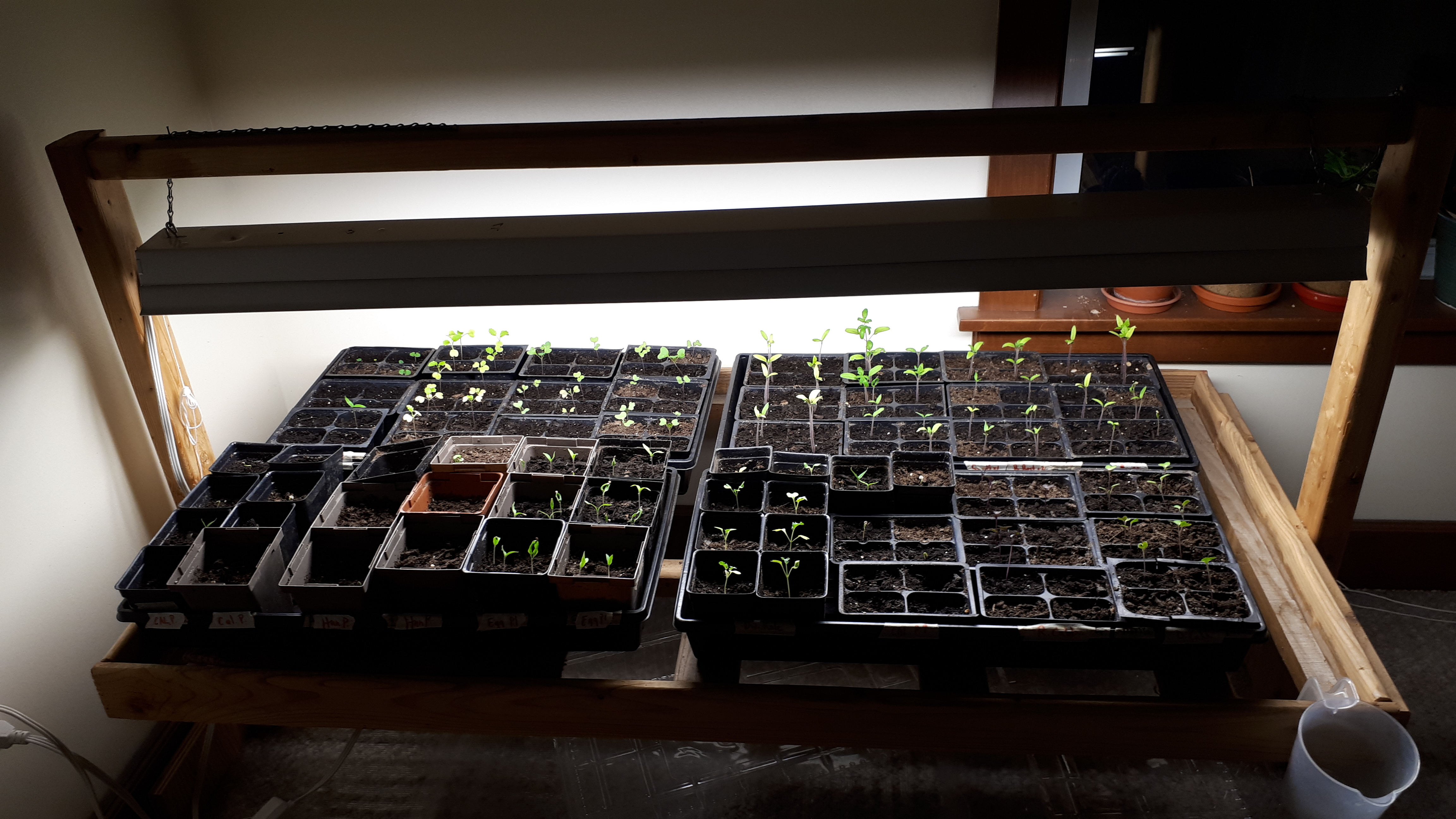 Below is the set-up the DH made and has used for the past 4 yrs. - a fluorescent tube on for about 12 hours a day or longer. For some plants, he put a heating pad under them.