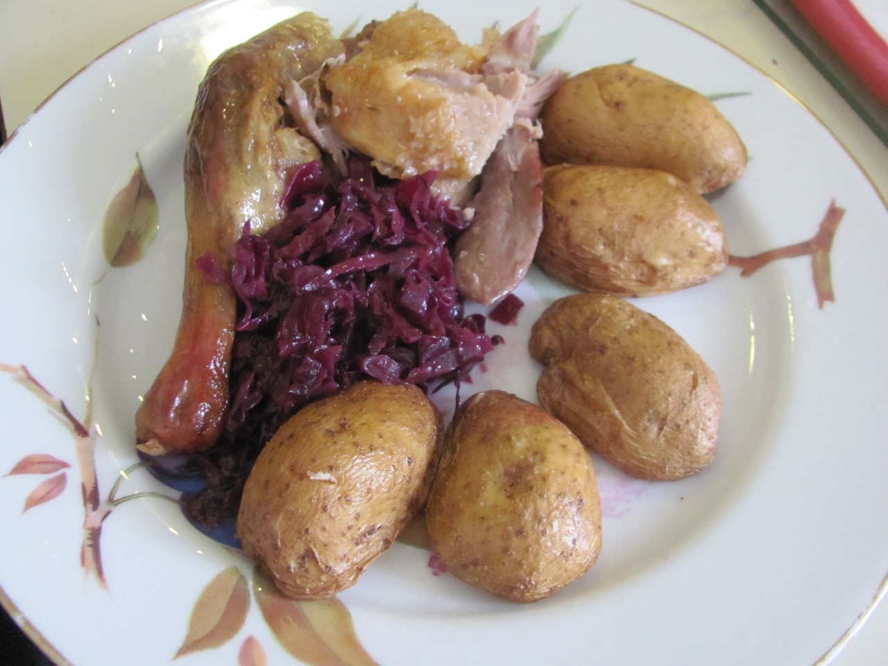 it's only fair I should post the resulting holiday meal consisting of home grown potatoes and red cabbage the duck is bought, but the apple inside it was home grown ;)
