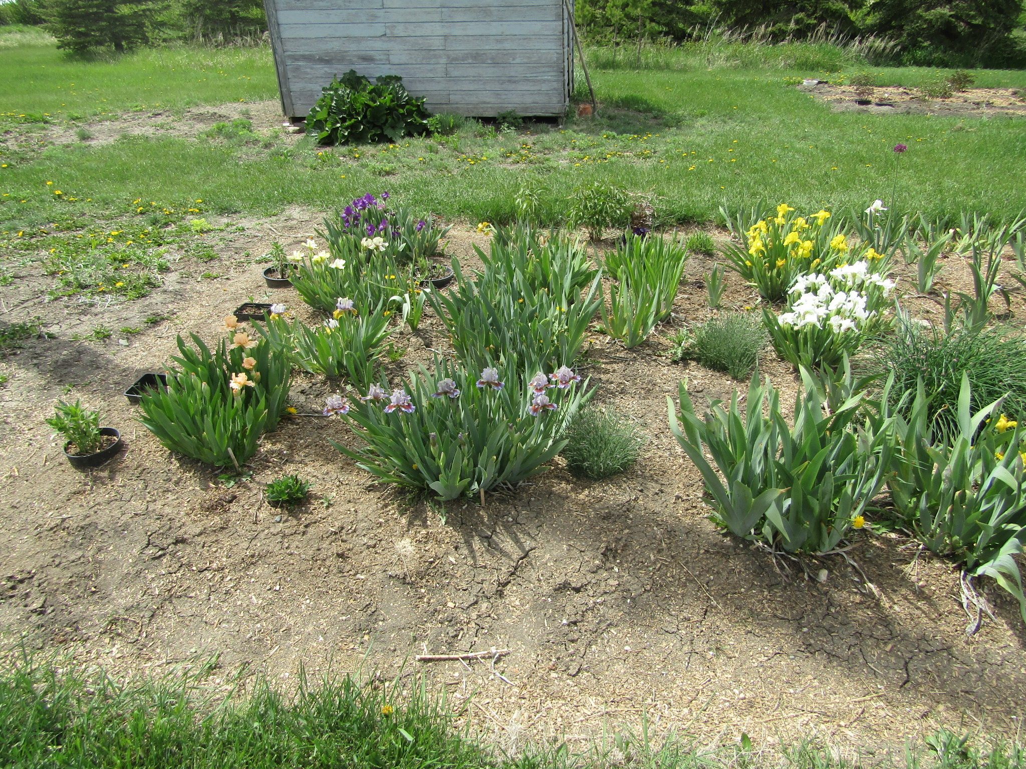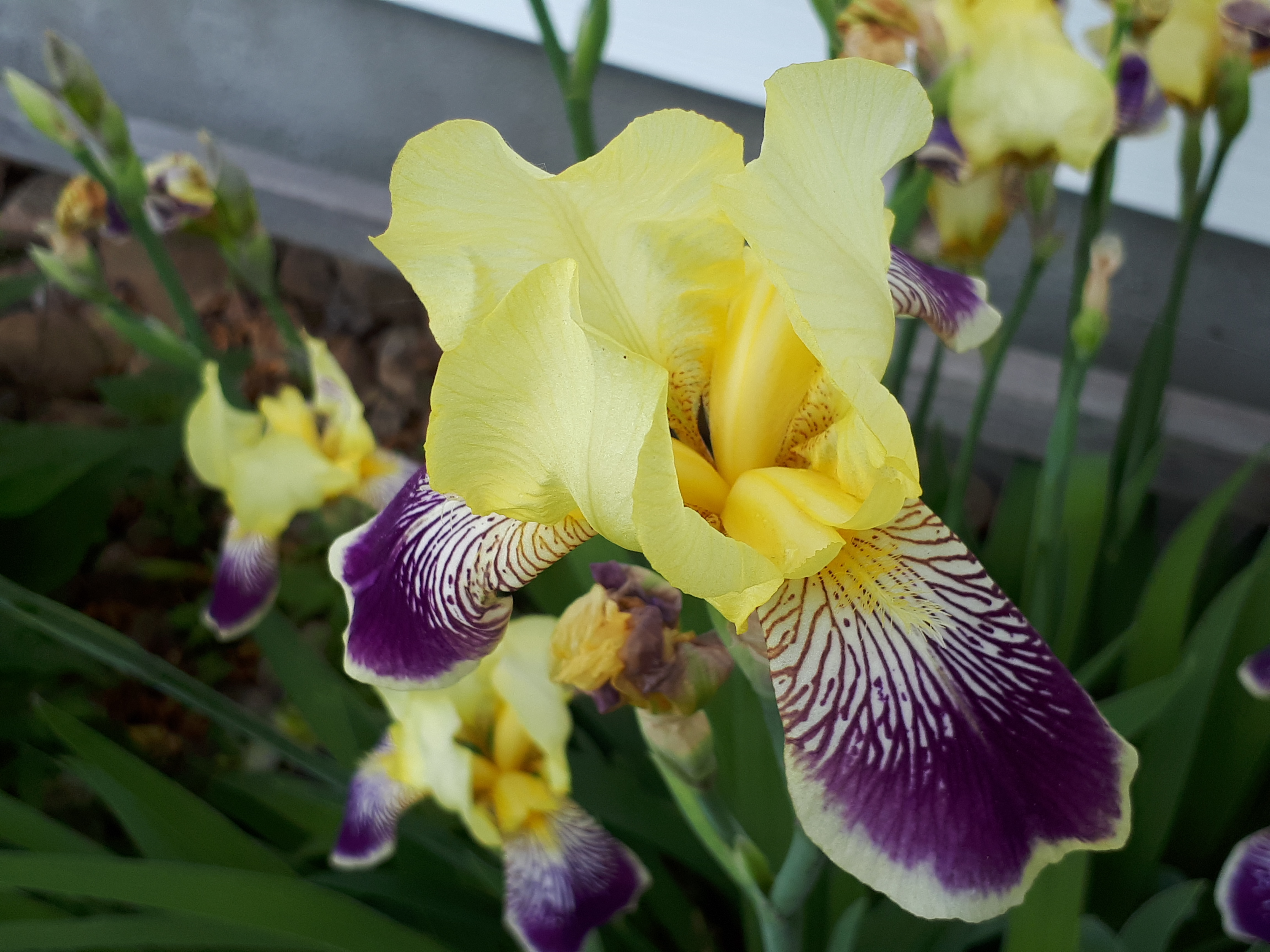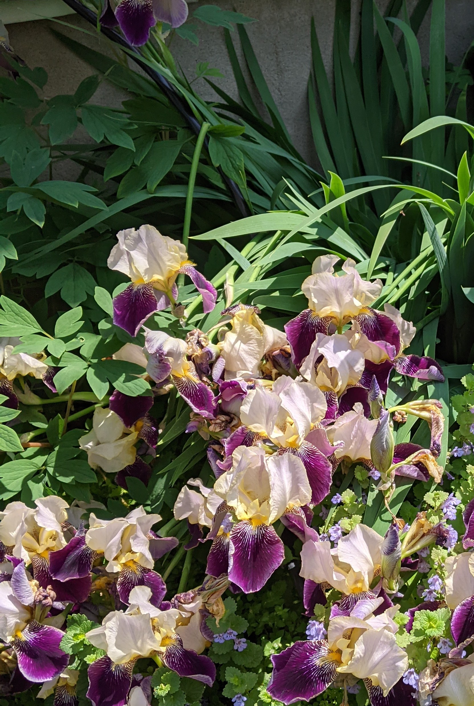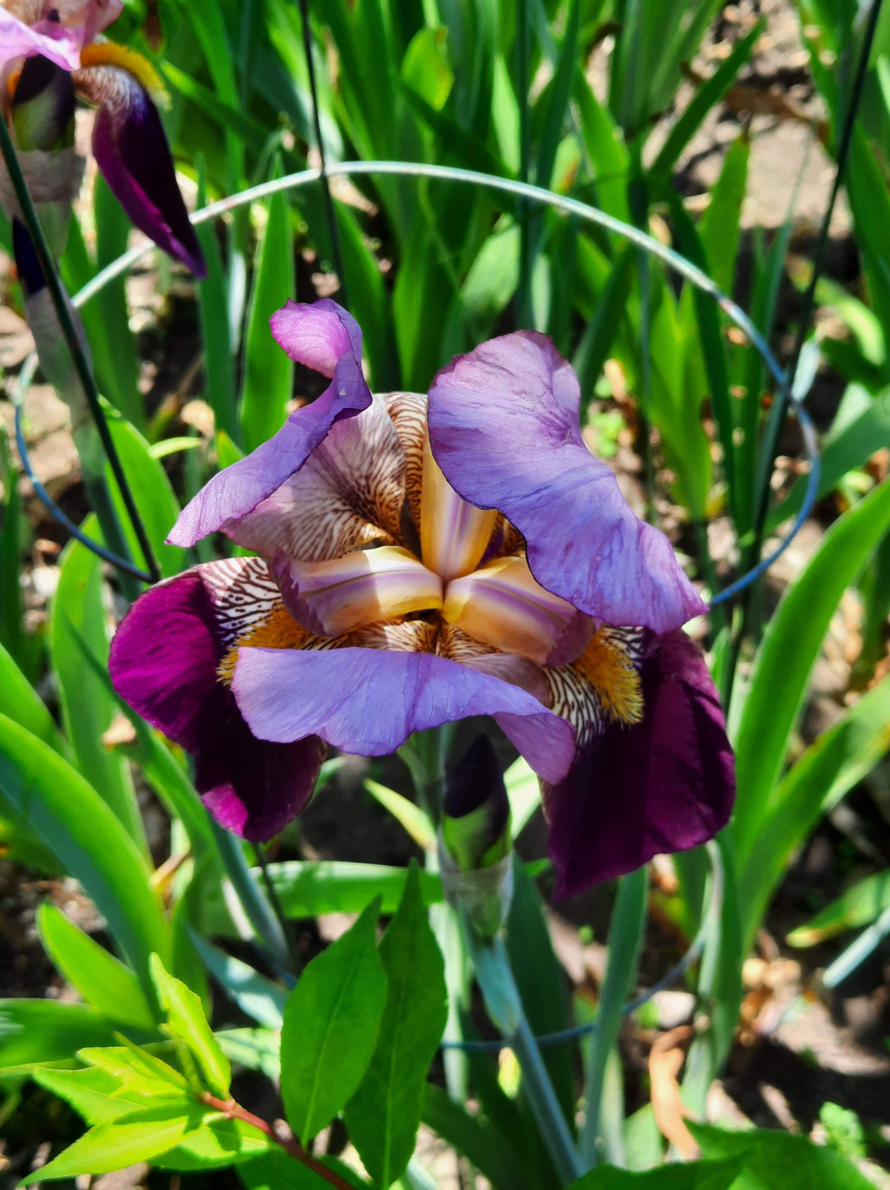 Iris's eh! we have one that looks like the 4th one from the top. the purple/yellow color. it went to bloom and the darn wind knocked it over!