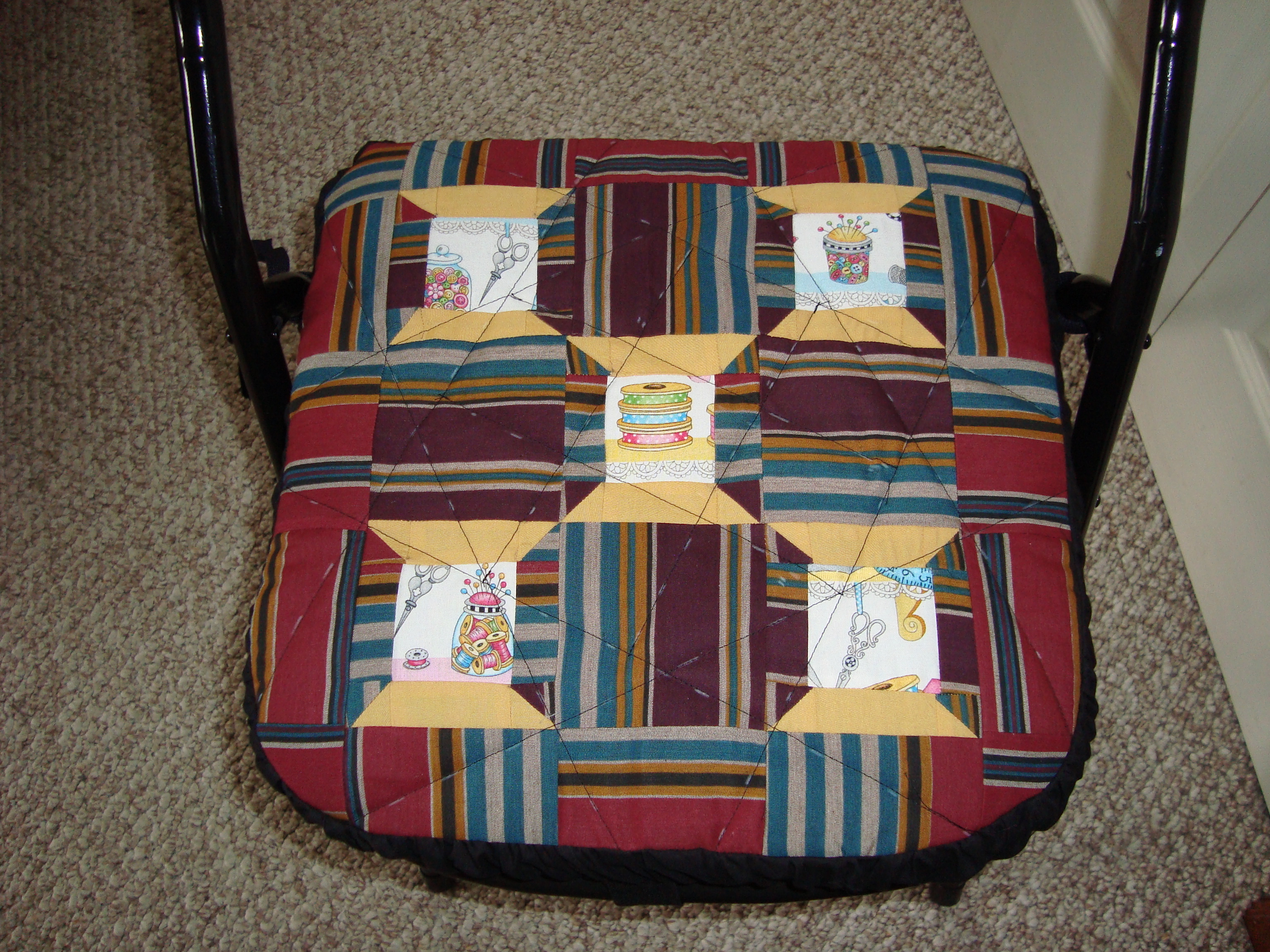 Oh my gosh! So many lovely quilts! I am what you would call a total novice in the quilting department. I have made a pot protector to put in between Teflon pans (where I would serge the edges differently) and a folding chair cushion with a sewing motif (where I used a variety of leftover fabric, not quilting fabric).