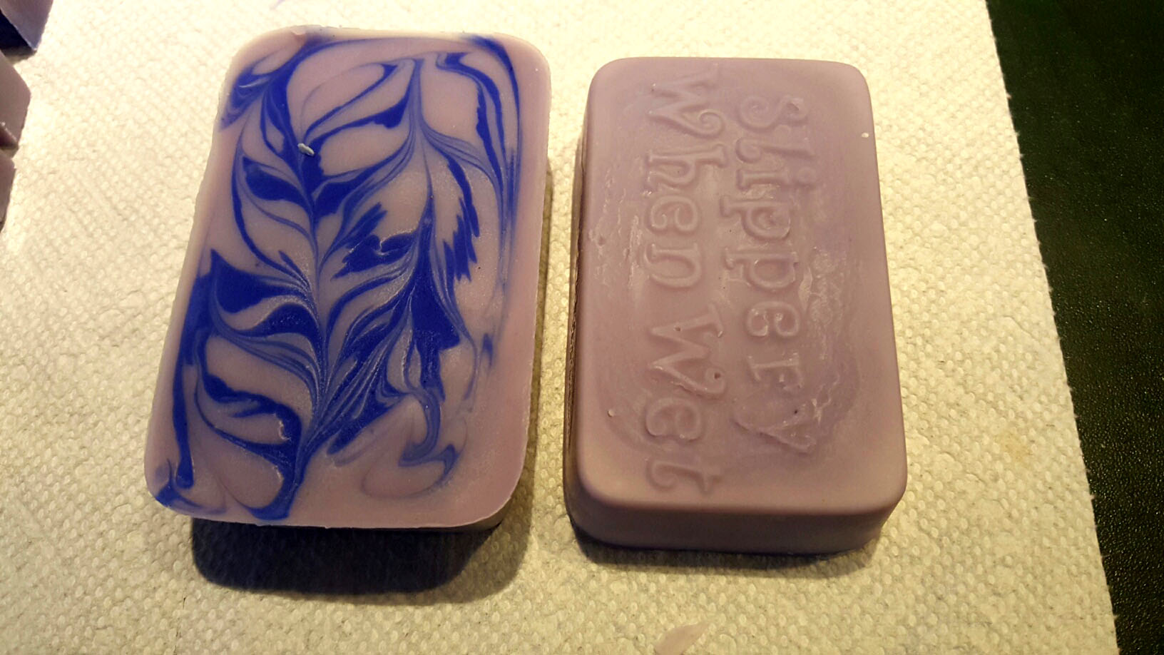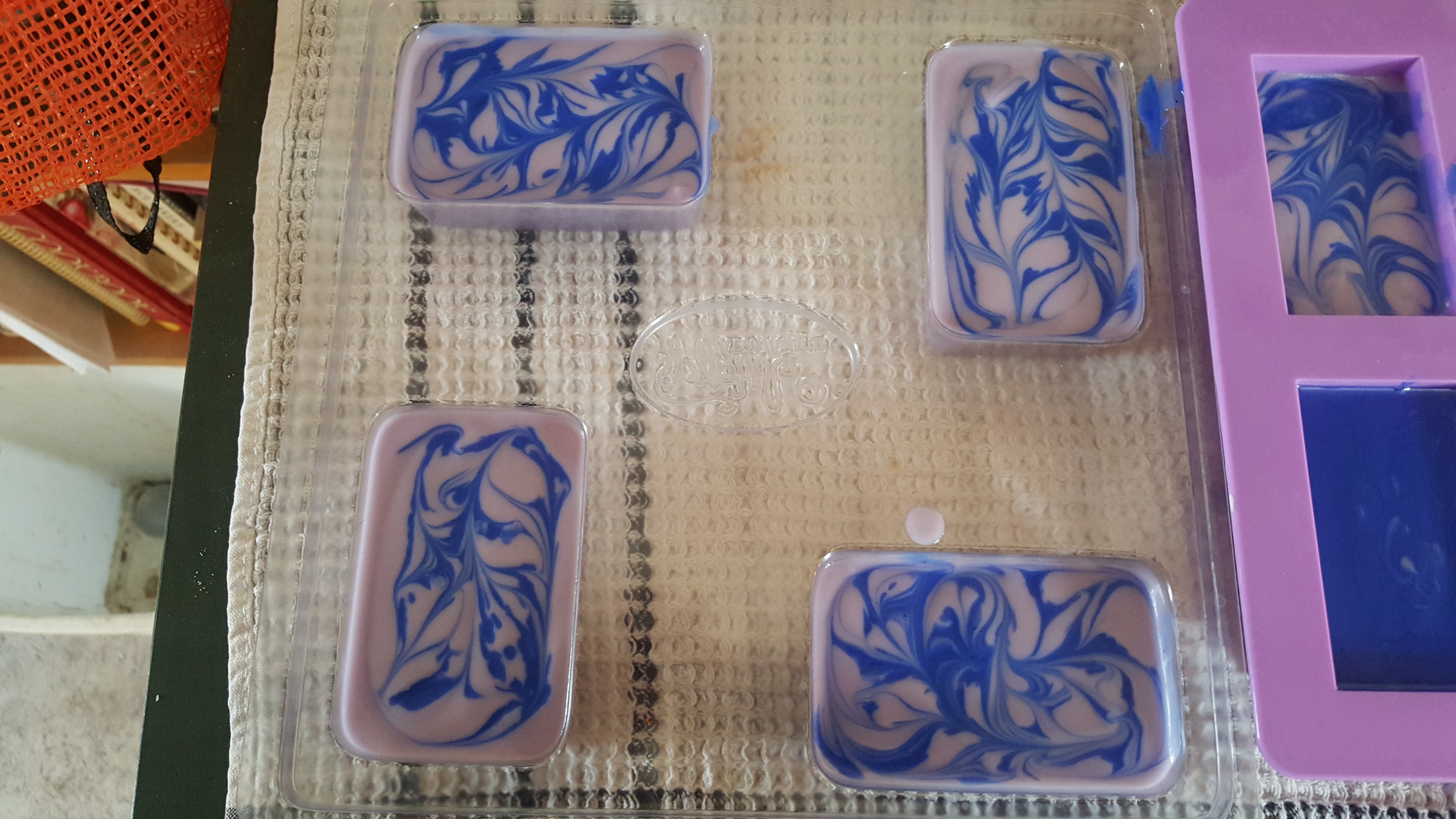 These are lavender colour...unscented...with blue swirls. Curious to see what they look like inside. The first ones in the post above are a swirl while pouring method...so pour into bowl each colour in turn and then pour from bowl to mold...