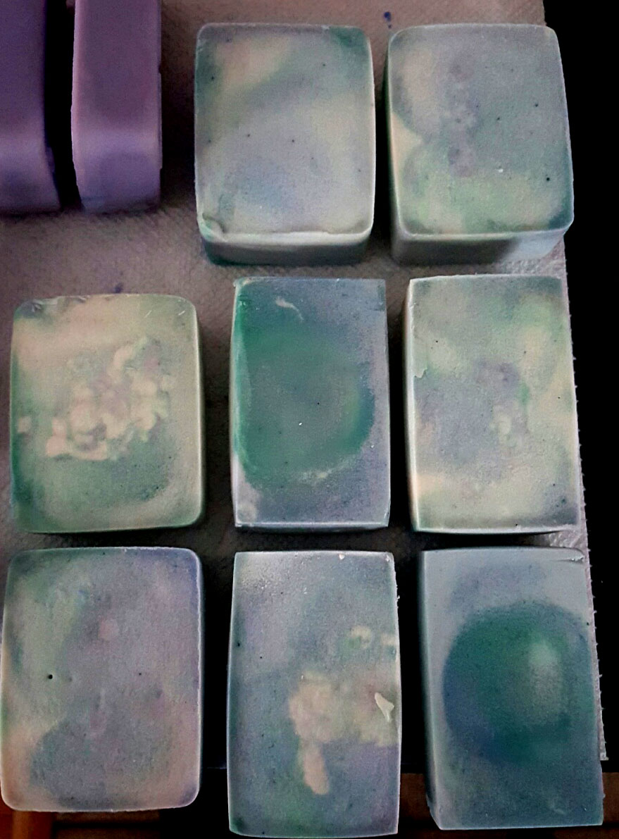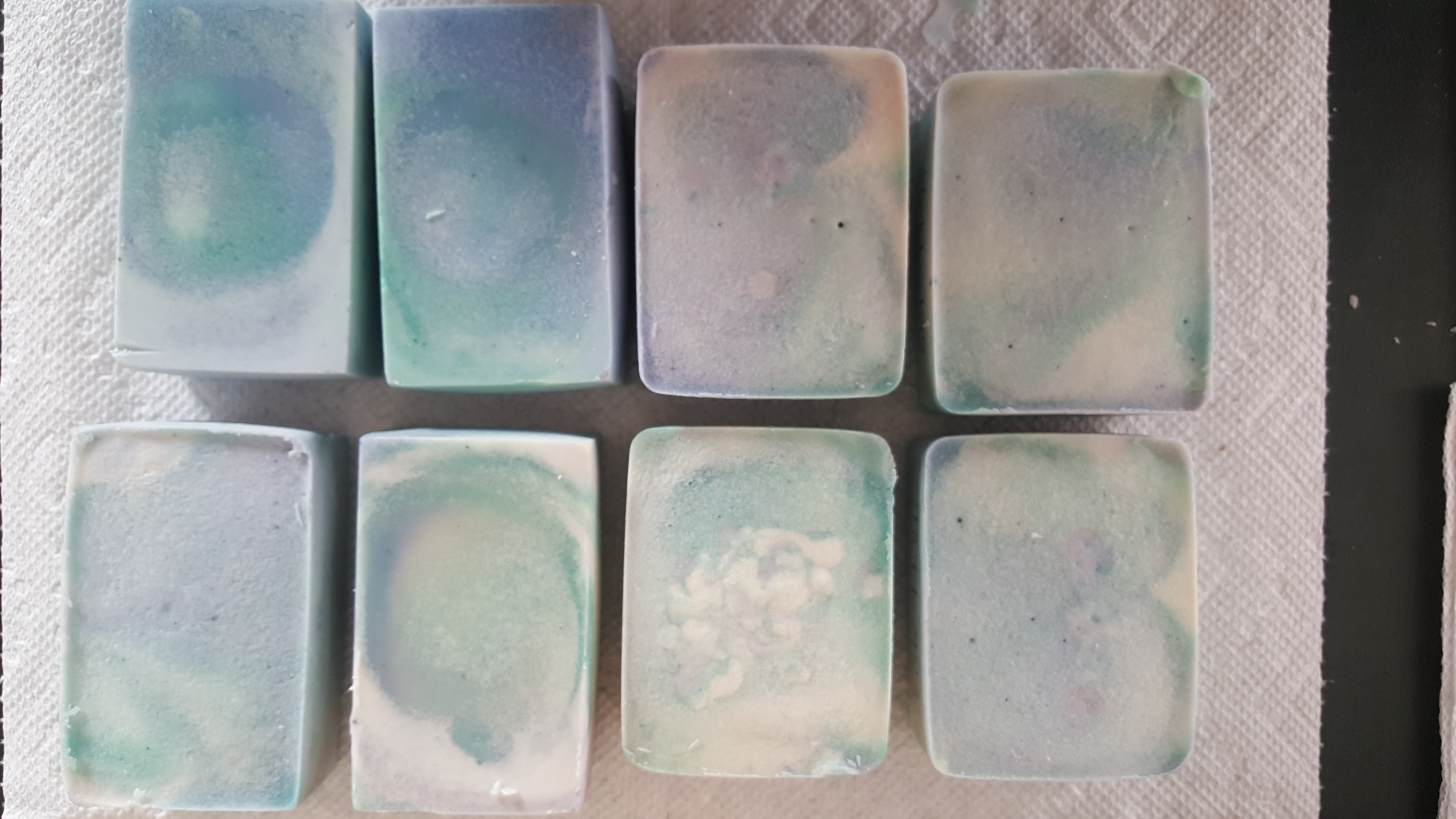 The top batch reminds me a little of fluorspar. Very pretty soaps.