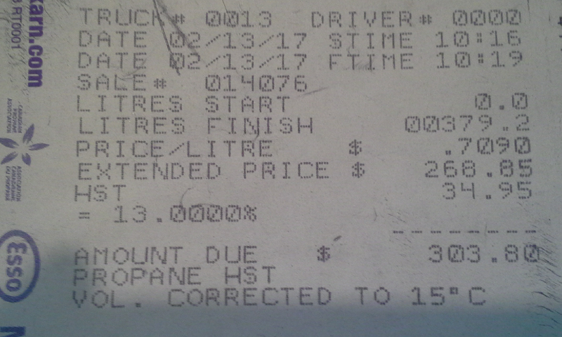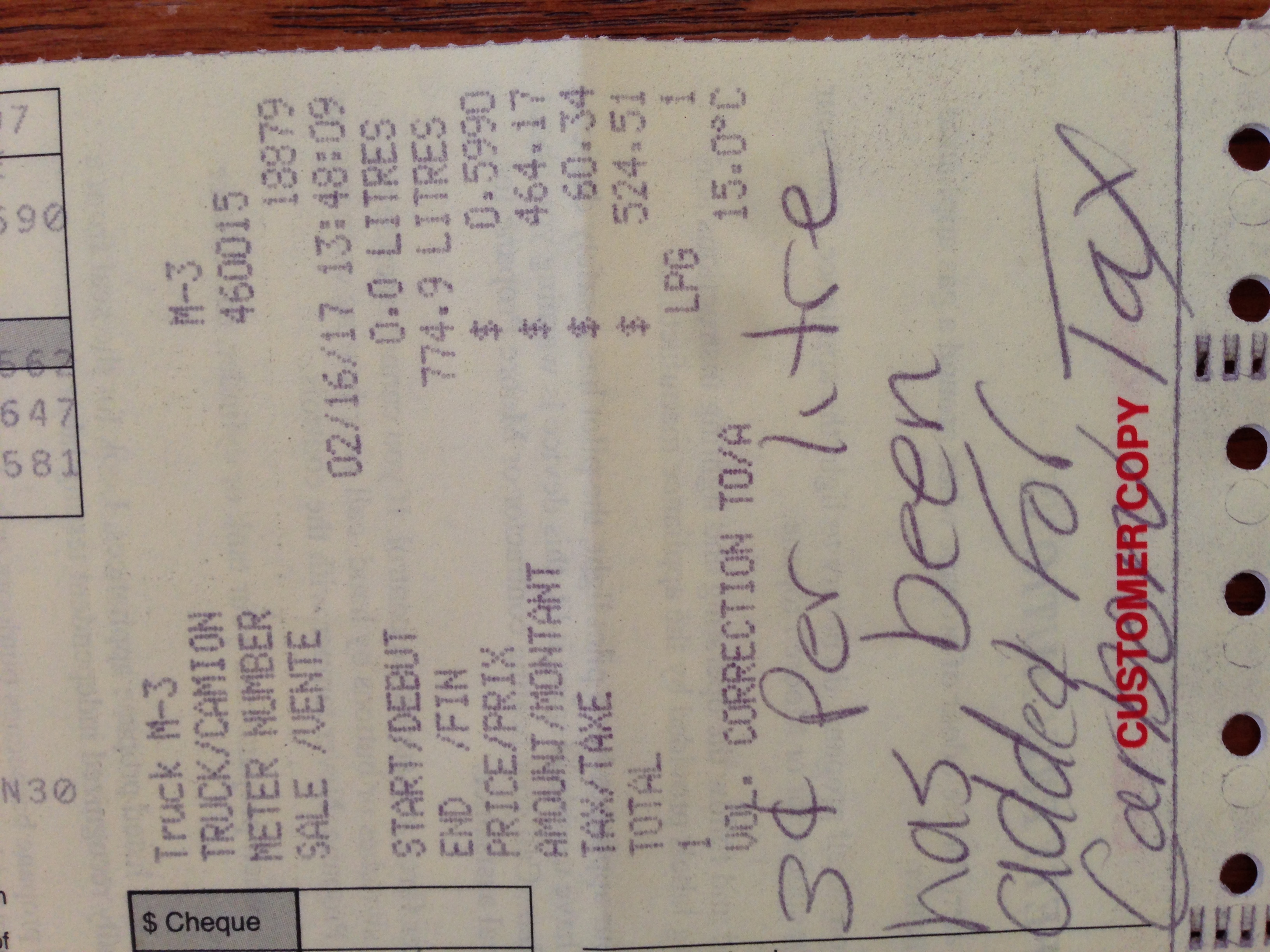 I locked in at .5990/L this year. But my last fill Feb 16/17 came in with a handwritten note attached that said "3 cents per litre has been added for Carbon Tax" That came up to an extra $28!! Carbon tax....the 2017 money grab.