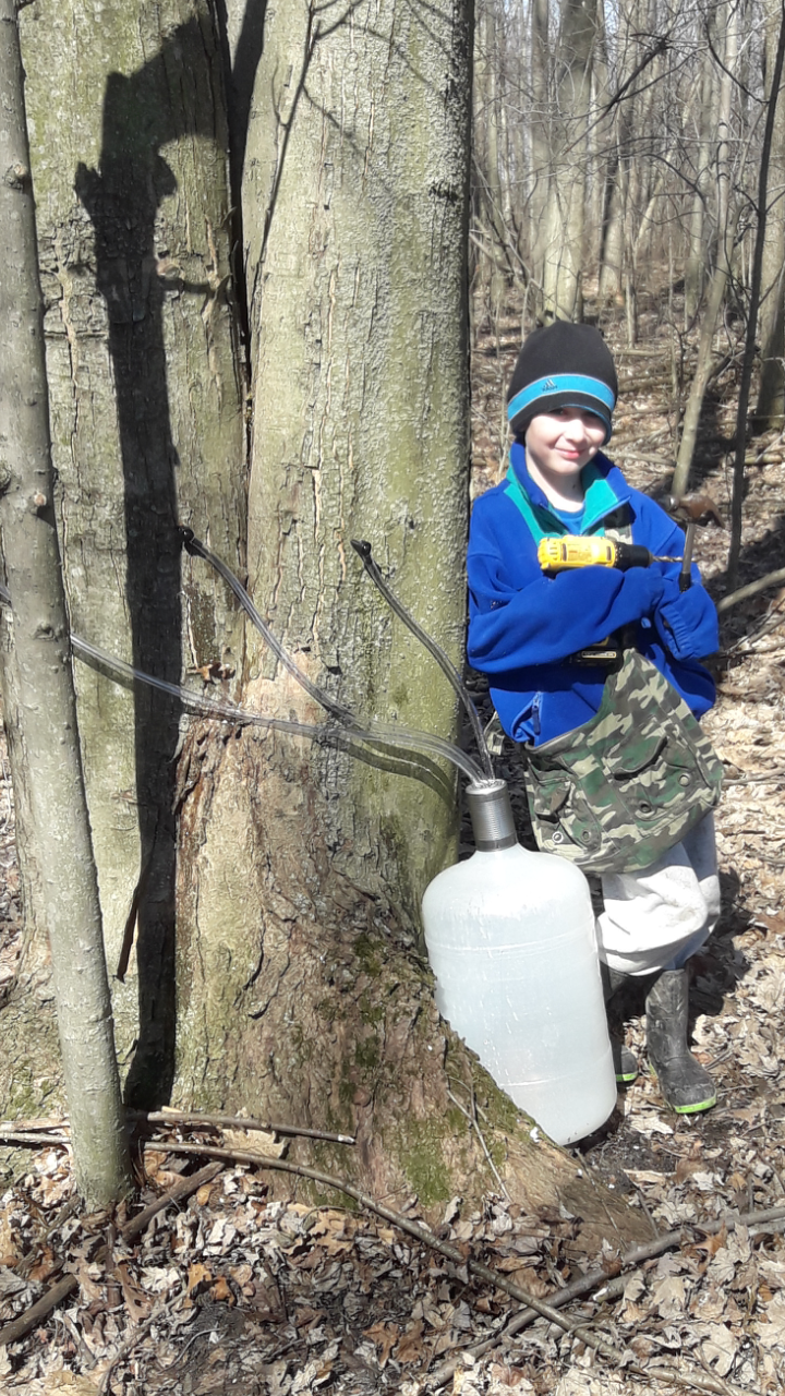 we tapped 5 big trees, all destined to be logged... i wish i could have tapped all of them but logistics dont allow for that to happen. we used my new to me 98 Sierra pick up truck "most" of the time to get the sap home, other times we used a 3 wheel stroller. since im so darn busy i had it all stored in anything i could and we collected about 50 gallons of sap. Friday i started boiling half of it... like a day later i made 2 litres!!! i have 4 fire pots, 3 normal size and 1 is a turkey deep fryer pot.... 3 small on the fire and the big one on the propane stand. it took me forever to get them all in 1 pot. got more to do right now... gotta go! did i say i was up until 2am boiling sap friday night? LOL i boight some filters and filterd the sap once and then again before the final boil.... its soooo dark and has hmmmm ashes sediment or something in it? oh well its delicious! and i dont care!