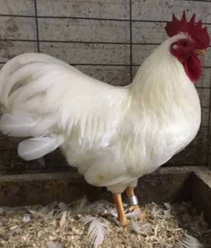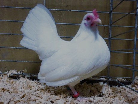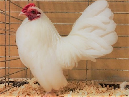 Lot # 7 White Old English Bantams donated by Cheryl Barnaba & Cesar Betelho of Connecticut . Cheryl and Cesar have been winning all over the USA with their white Old English over the past several years. They have provided us with a great pair of birds. The male is just getting his two main sickle feathers back and is an awesome bird. The female.. is outstanding with proper body and tail and a show winner. Well matched birds that will put you on the fast track to winning with Old English