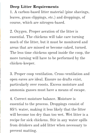 Here's a few requirements to make it work . I find if done properly the litter gets very acidic & salmonella , cocci & other stuff can't survive in it . Only removal I do is IF manure buildup gets "peaky" builds up frozen under roosts I scoop out when necessary . As u say lack of ventalation proper is the biggest issue in most situations . Folks seem to think moving out bad , moist air is taking out heat but the little heat from most chicken situations is minuscule .Yes more ventalation around Eve's works & fresh air inlets round bottom also . Luck