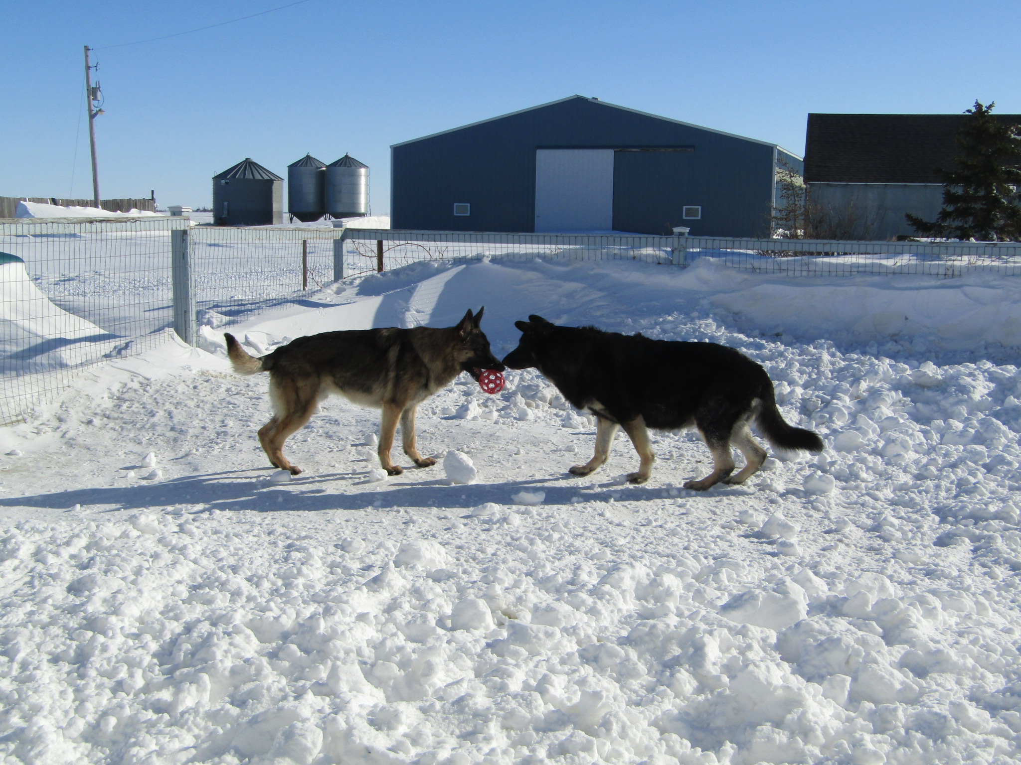 Update. Teddy is doing great. He will be 1 year old May 3. Here's a picture of my two dogs playing outside on one of the nice days we have had lately. The black one is Trixie. She's 5 years old.