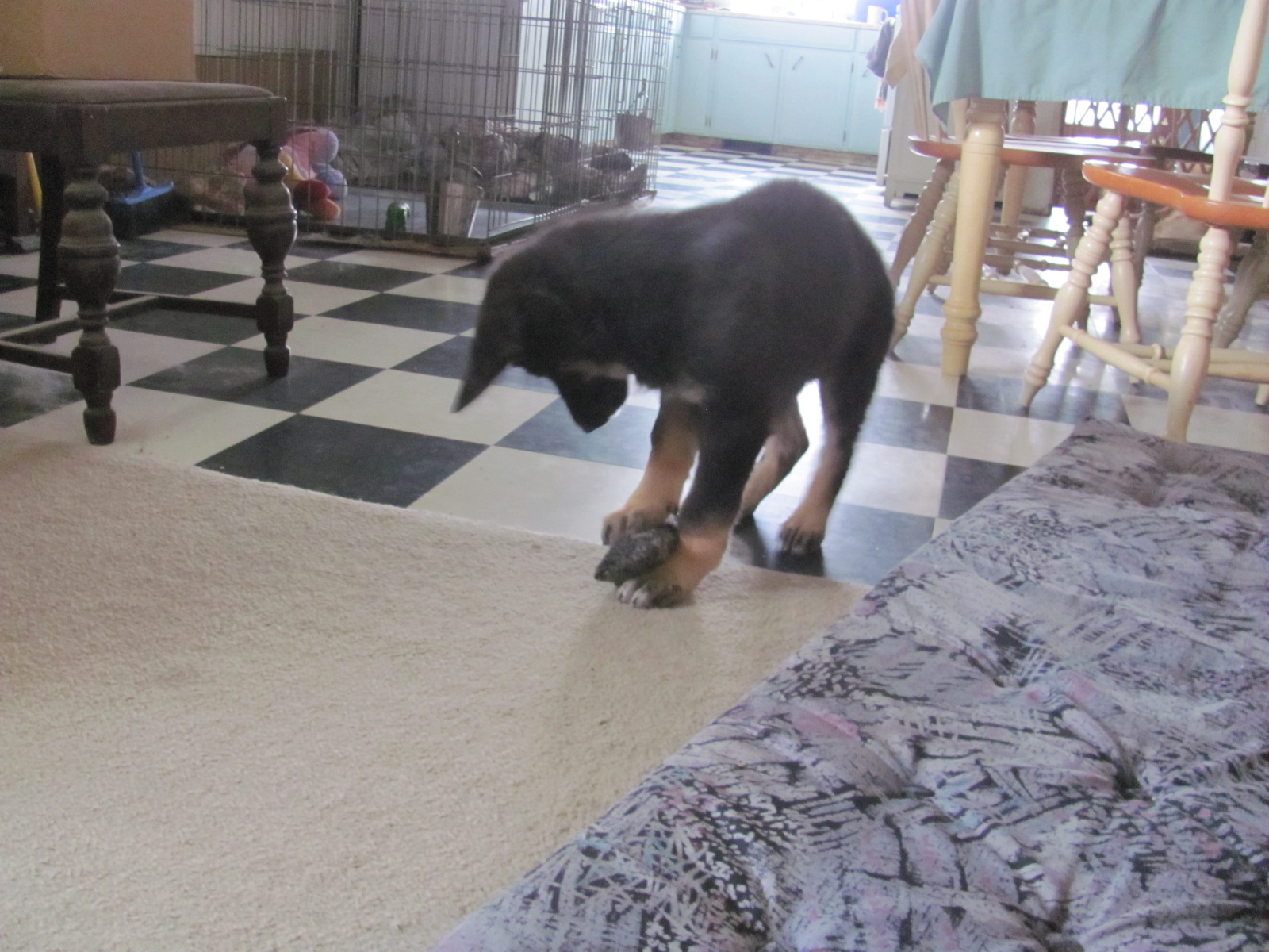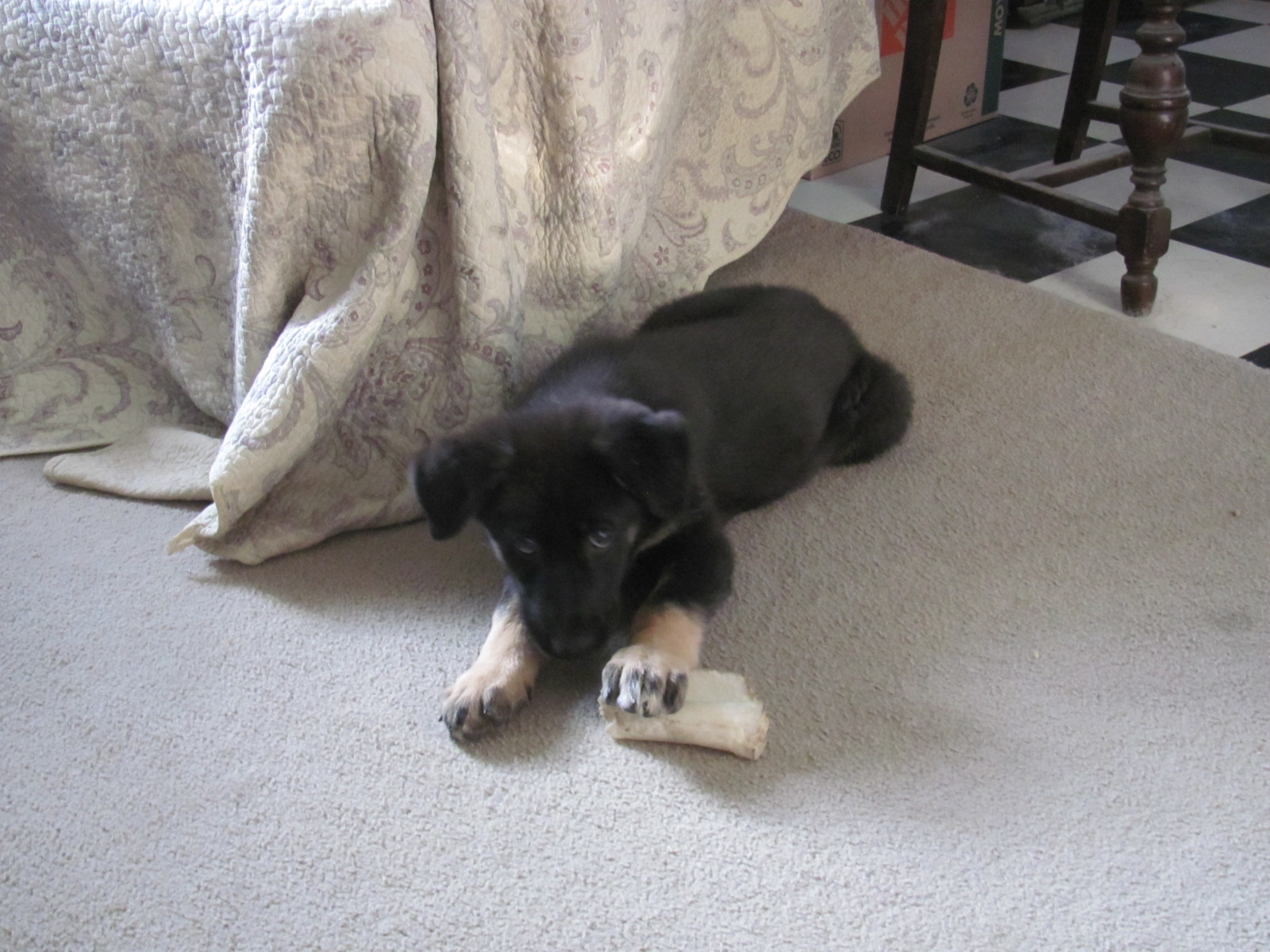 She's got a nice personality. She's quite outgoing. I'm really happy with her. She eats well, and is partly house trained now. She's playing, curious, barking a little, cuddly, and starting to ask for a drink when she wants one. I love how German Shepherds speak English! Last night she only cried a little when we went to bed, then nothing until 5:00. She did pee in the crate, but that's to be expected for now. I haven't had a puppy for 8 years so I have to dig into the cobwebs to remember how to take care of one. Signed her up for a puppy class in June. That will be fun.