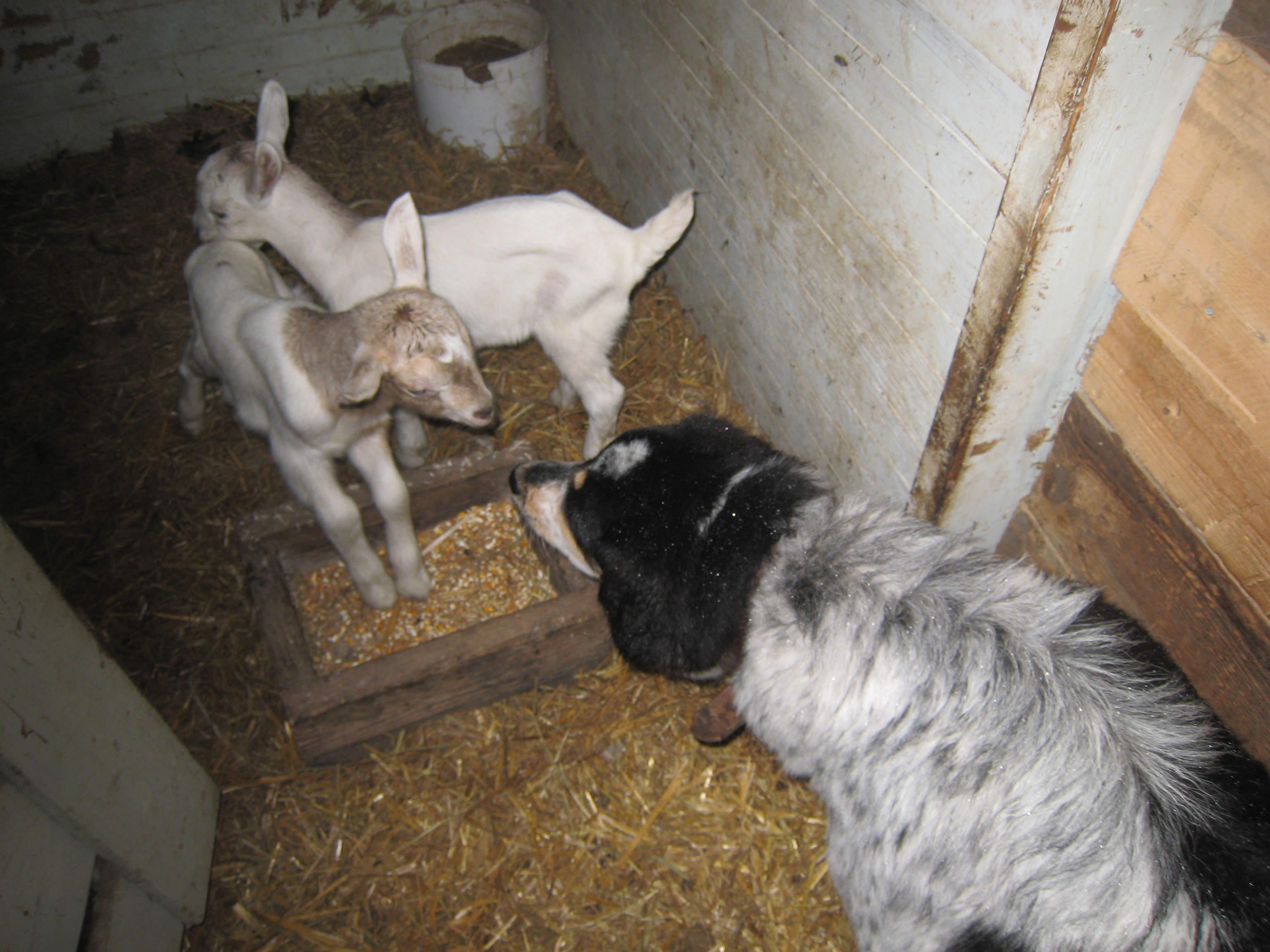 And Ranger, the 8 month old pup, was very interested too, but not very brave when Sunny was close by. The pic in the stall with the babies was while Sunny was in the milk stall for her first time.