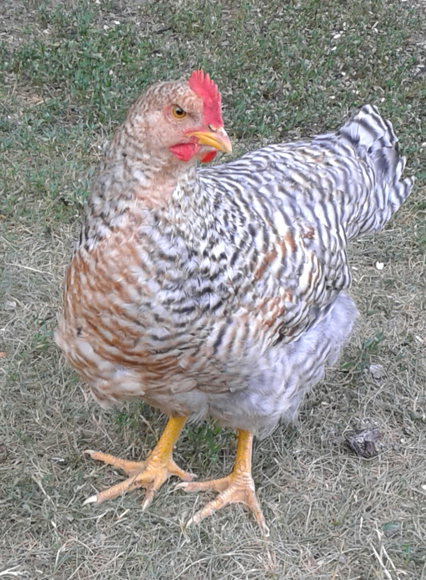 I have decided to go a different direction and so my bielefelder hen will just stay with the giants. She seems comfy with them. My new direction? I will be getting erminette eggs. They arrive along with some new blood for my FBCM this Wednesday.