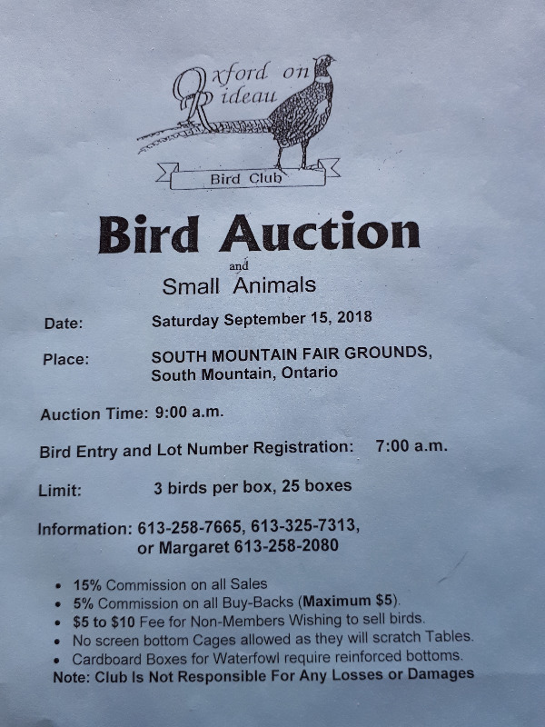 Auction 2018 09 15 Oxford on the Rideau Bird Club Auction South Mountain Fairgrounds