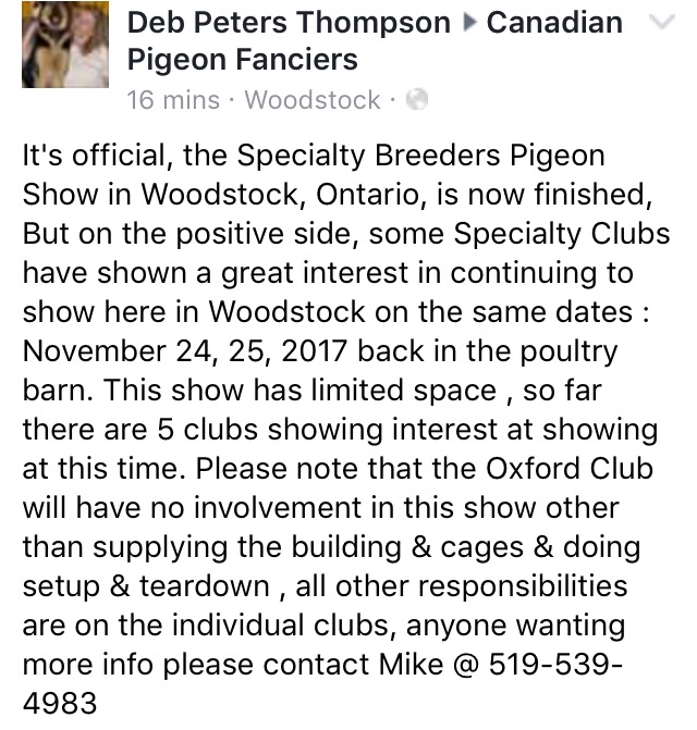 Show 2017 11 24-25 Specialty Breeders Pigeon Show, Oxford Club (Woodstock)